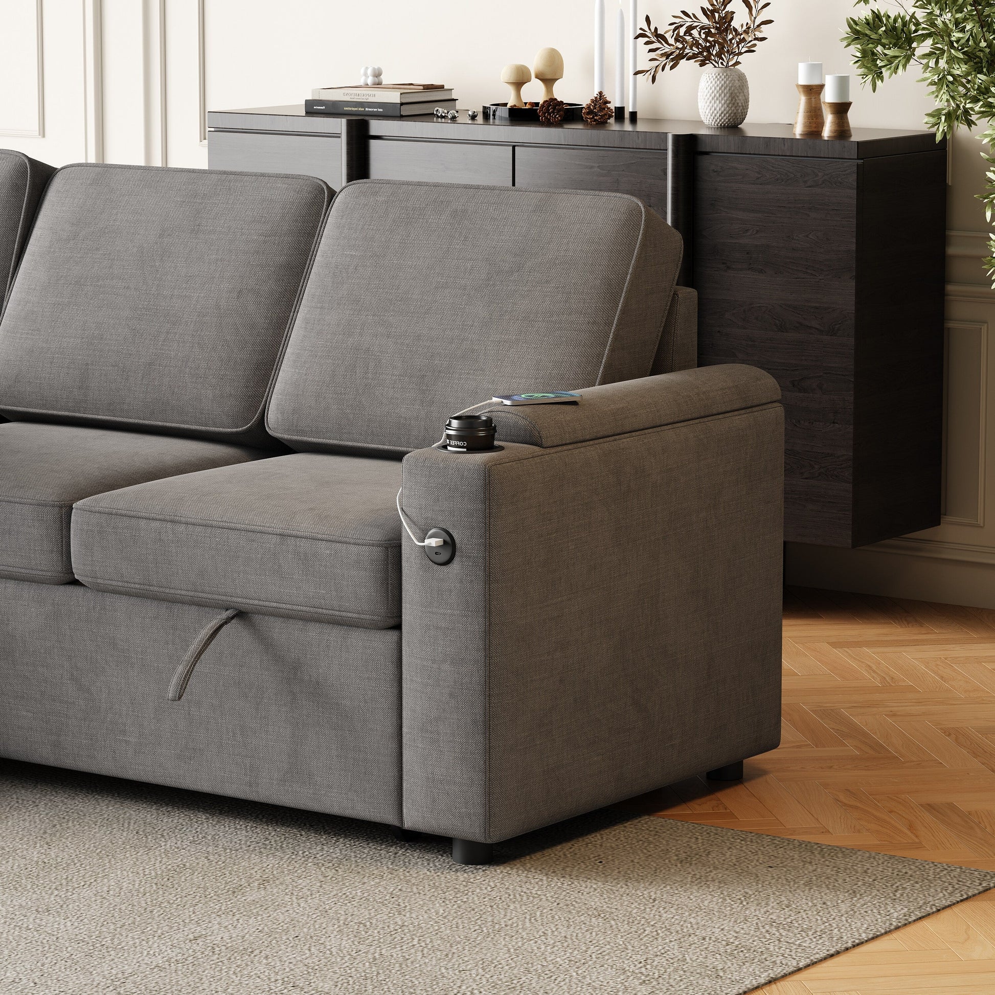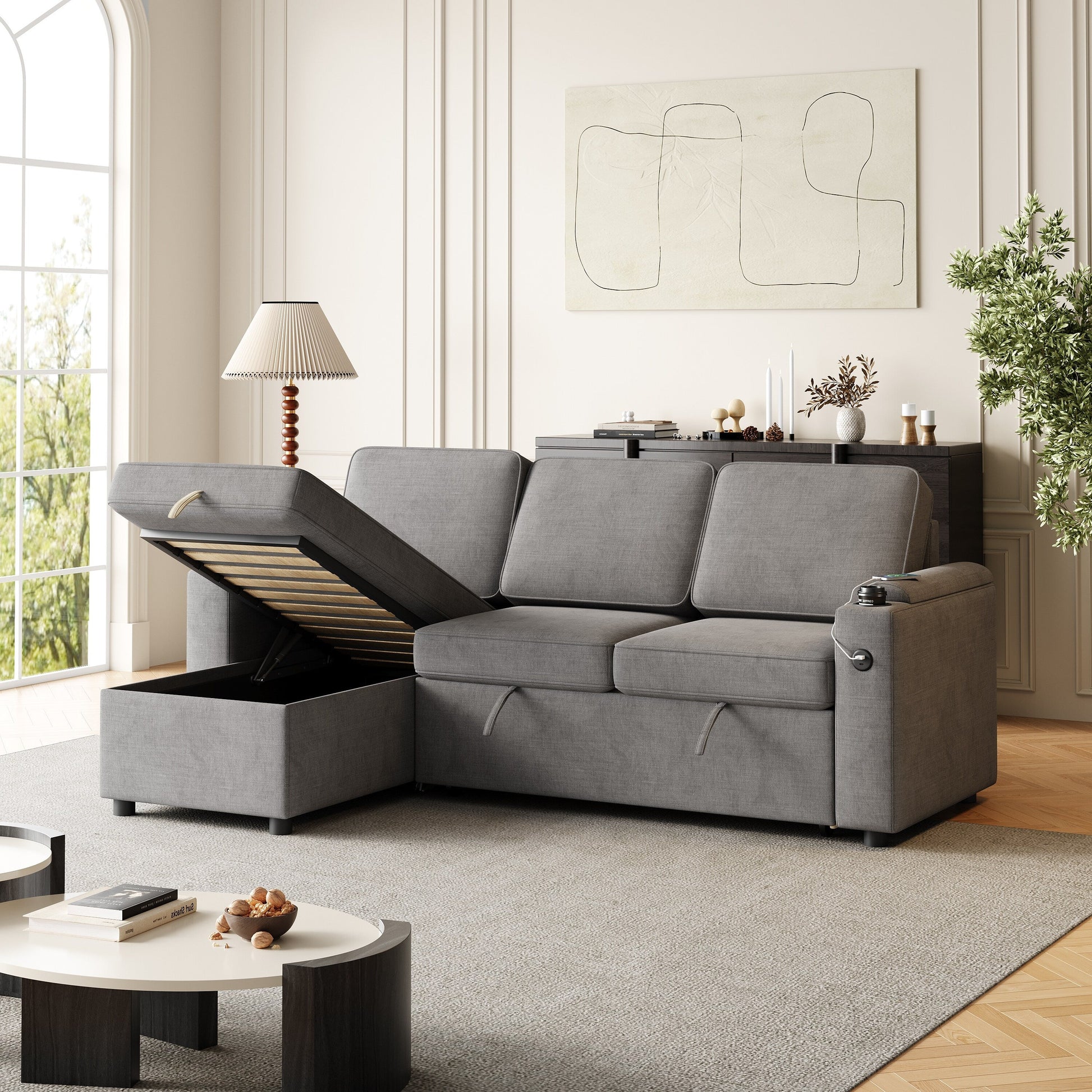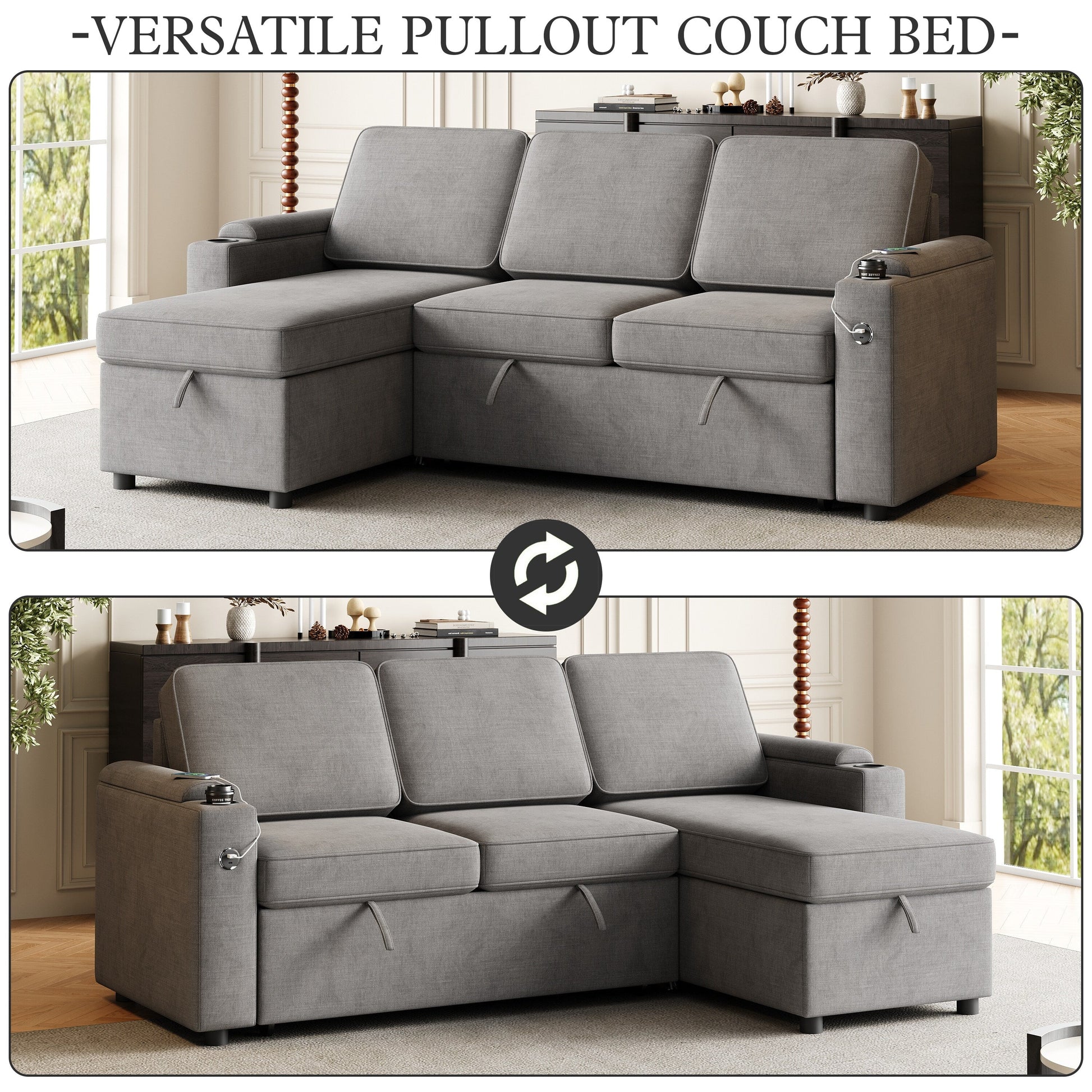 This 85.8-inch L-shaped pull-out sofa bed features a reversible chaise, built-in storage, and USB/Type-C charging ports. Easily converting from a sofa to a bed, itâs ideal for compact living spaces while offering hidden compartments and cup holders for added convenience.