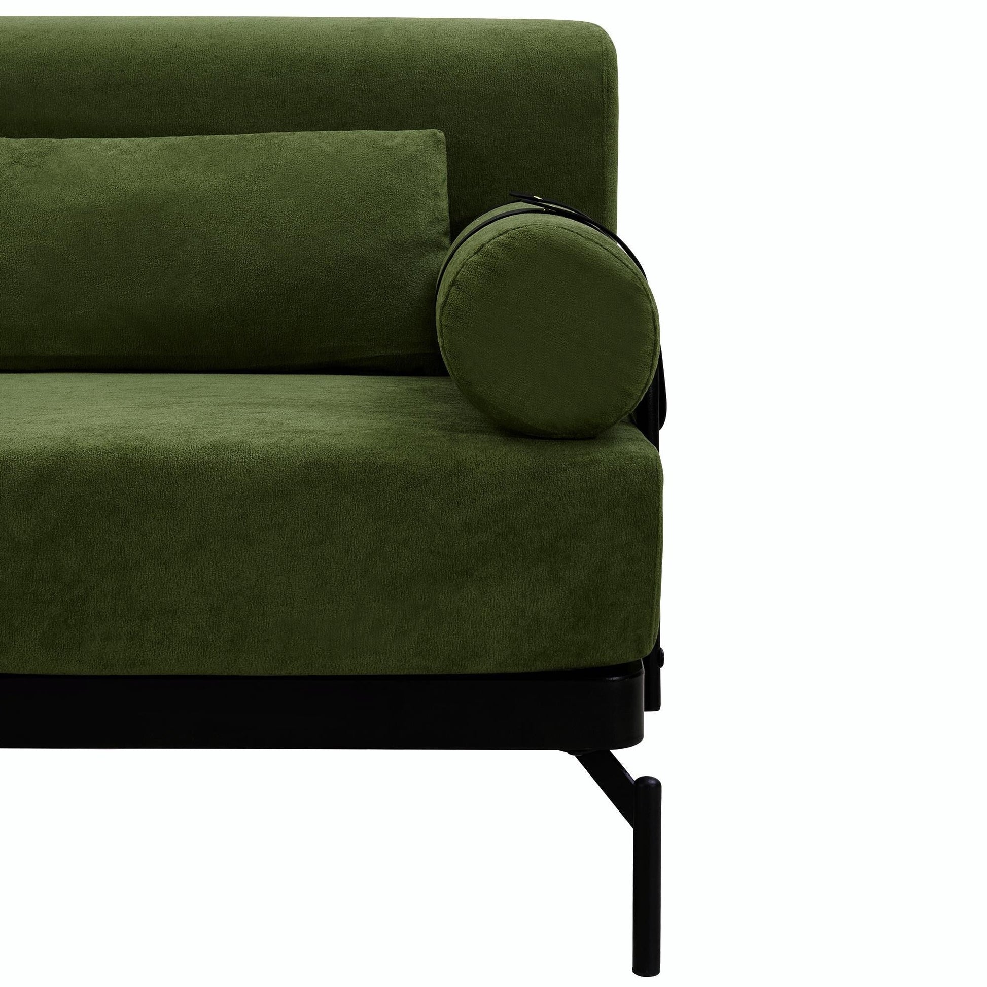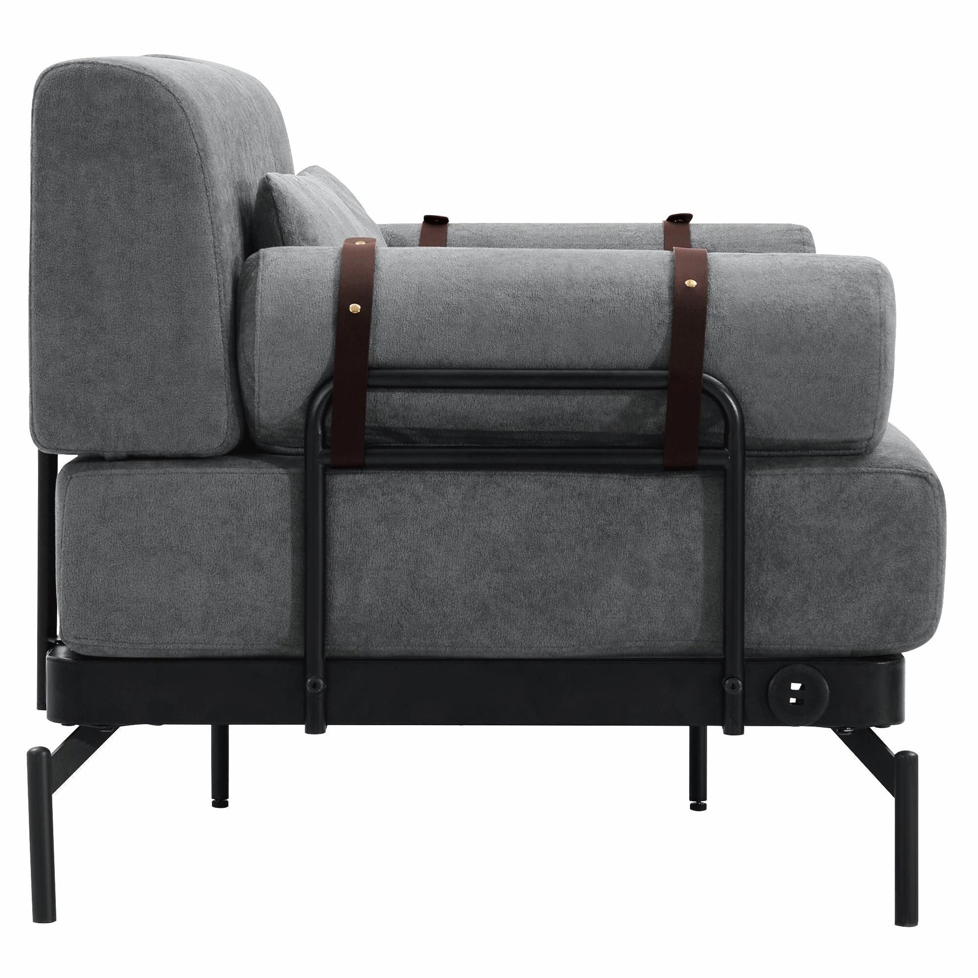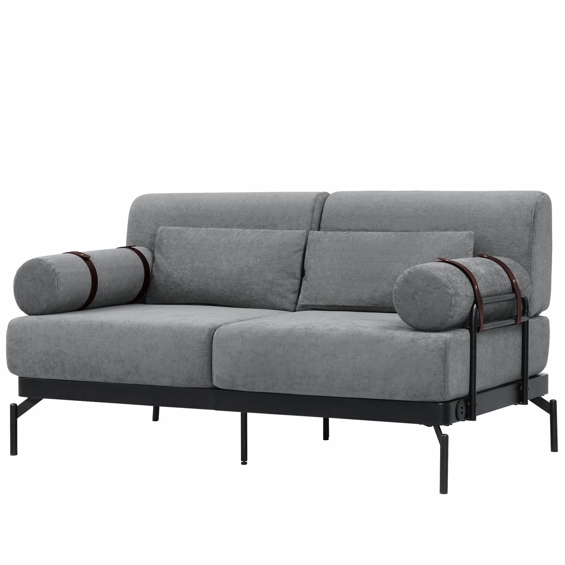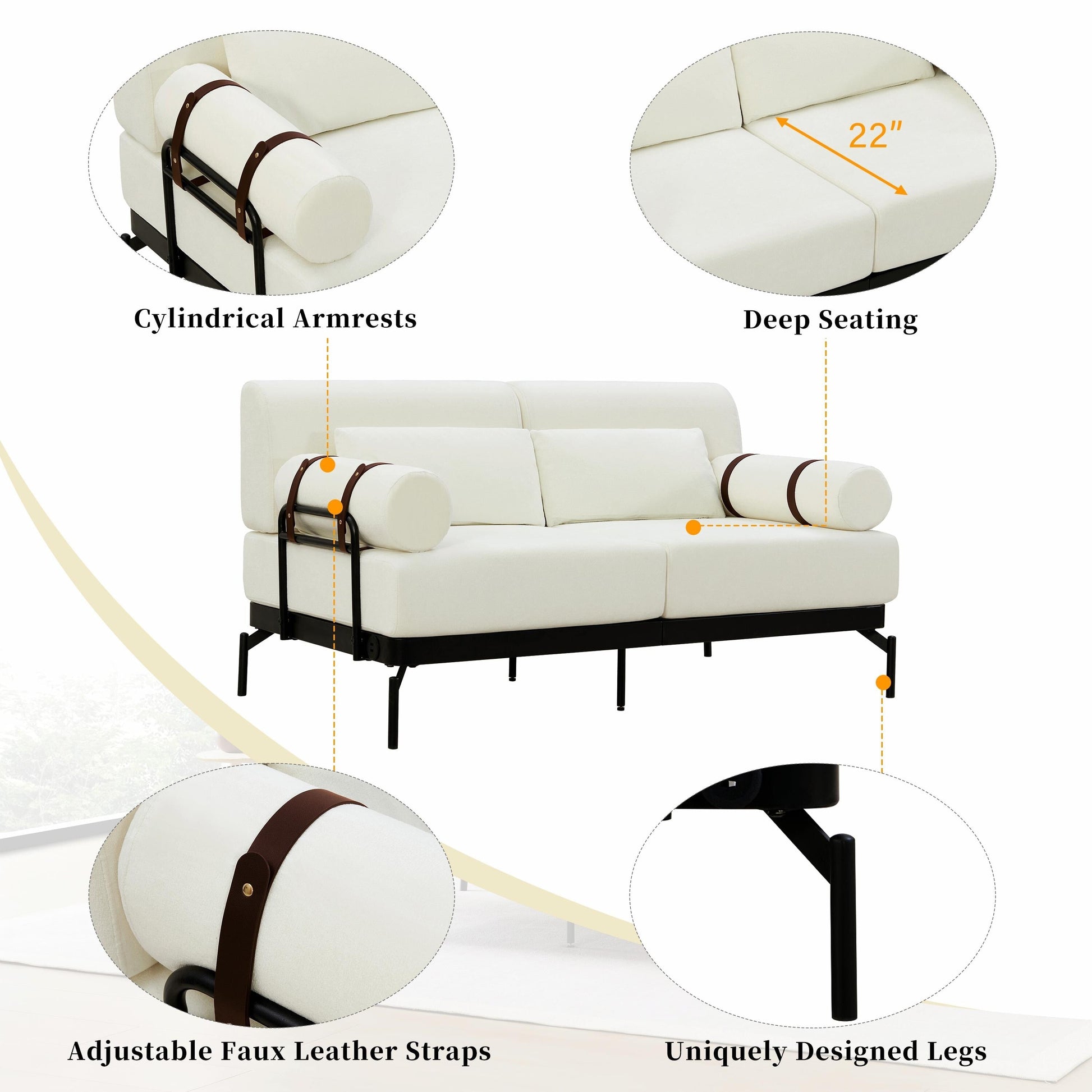 Unique Cylindrical Armrest Design: This sofa stands out with its uniquely designed cylindrical armrests wrapped in adjustable faux leather straps. This modern, bold design adds an architectural accent, offering both aesthetic appeal and practical support.