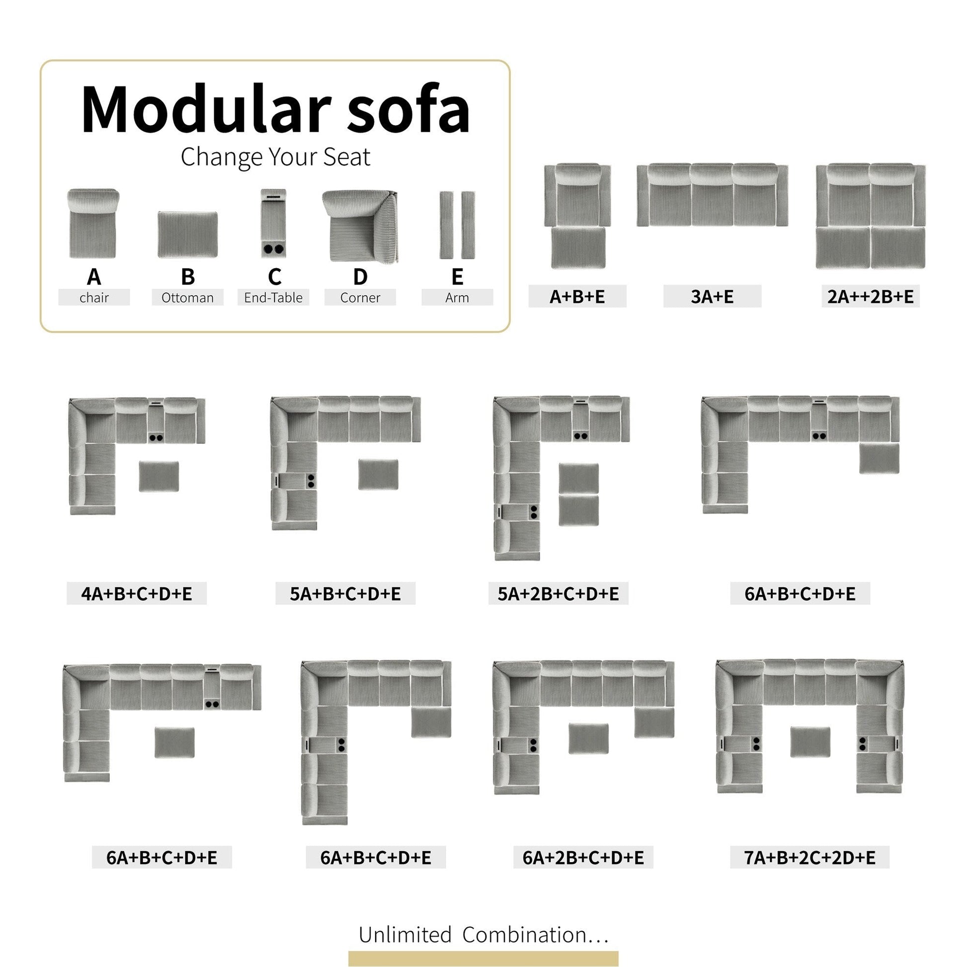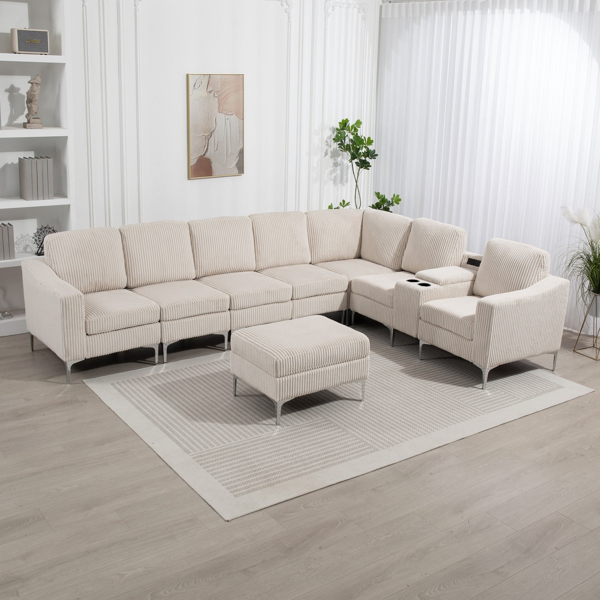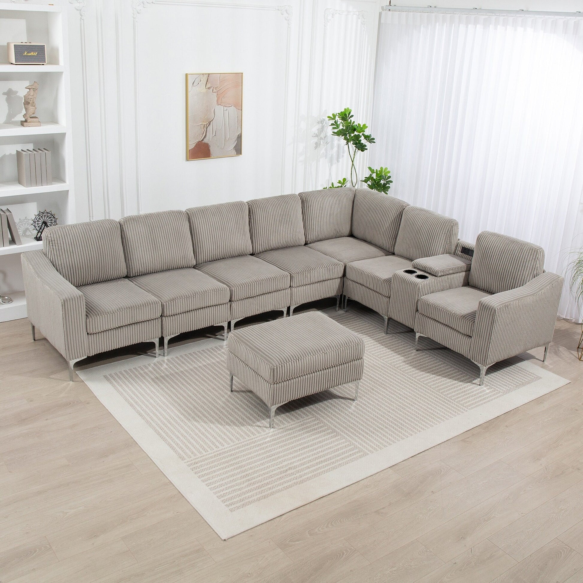 This modular corduroy sectional sofa brings classic style and flexible comfort to any space. Designed with clean lines and soft cushions, it adapts easily to various room layouts. Features include a convertible ottoman, USB charging ports, and storage spaceâideal for modern living.