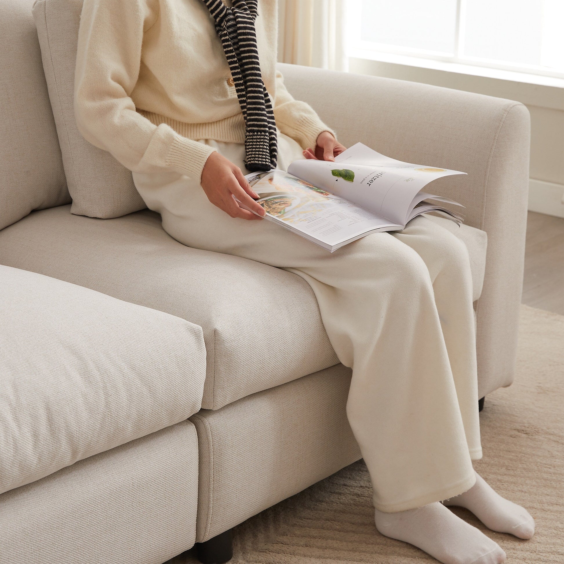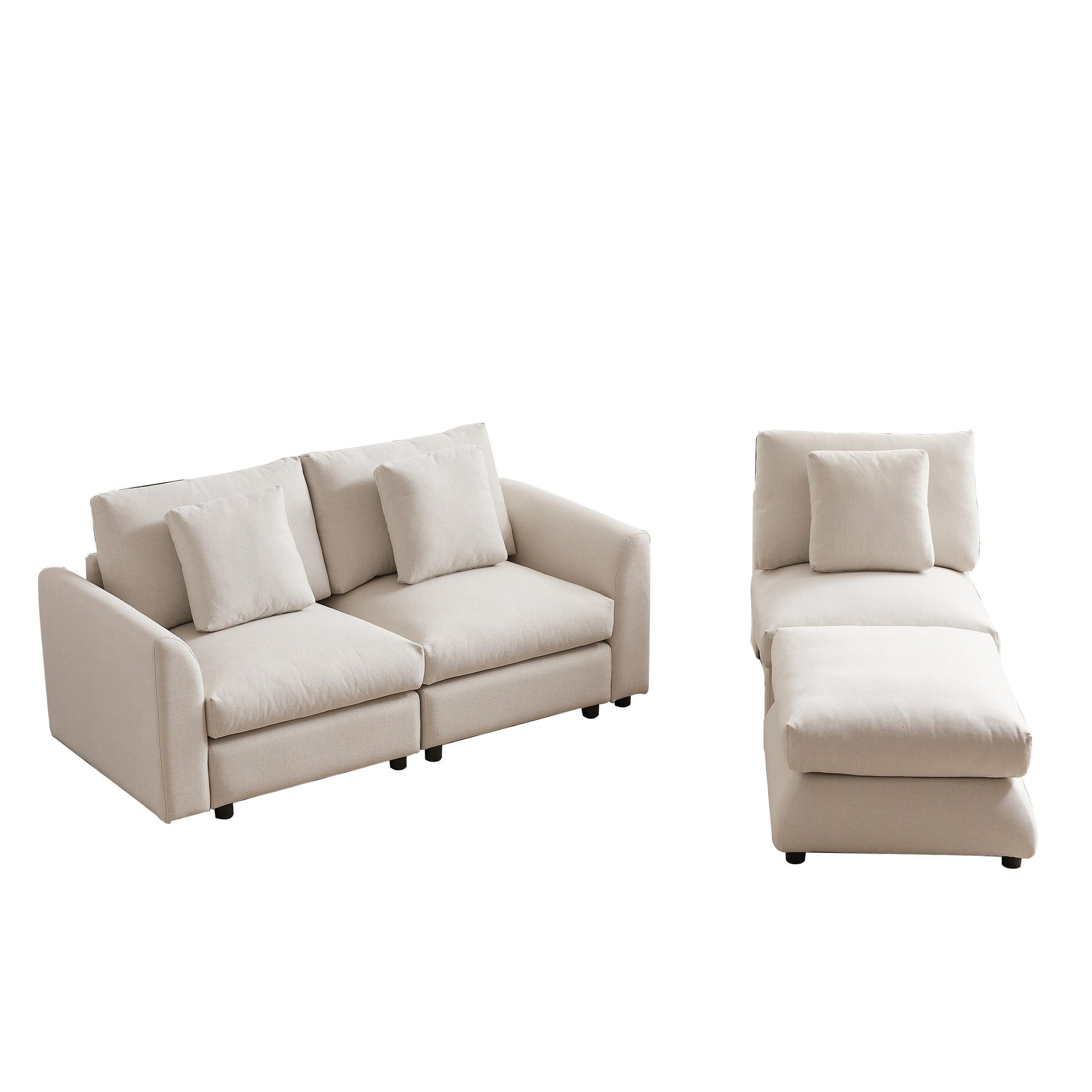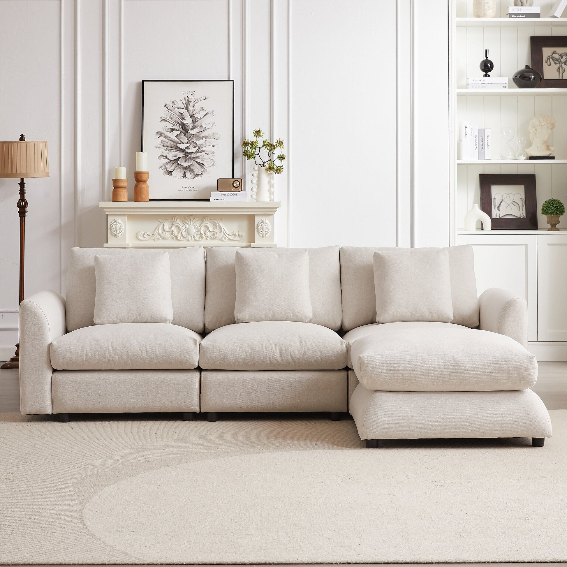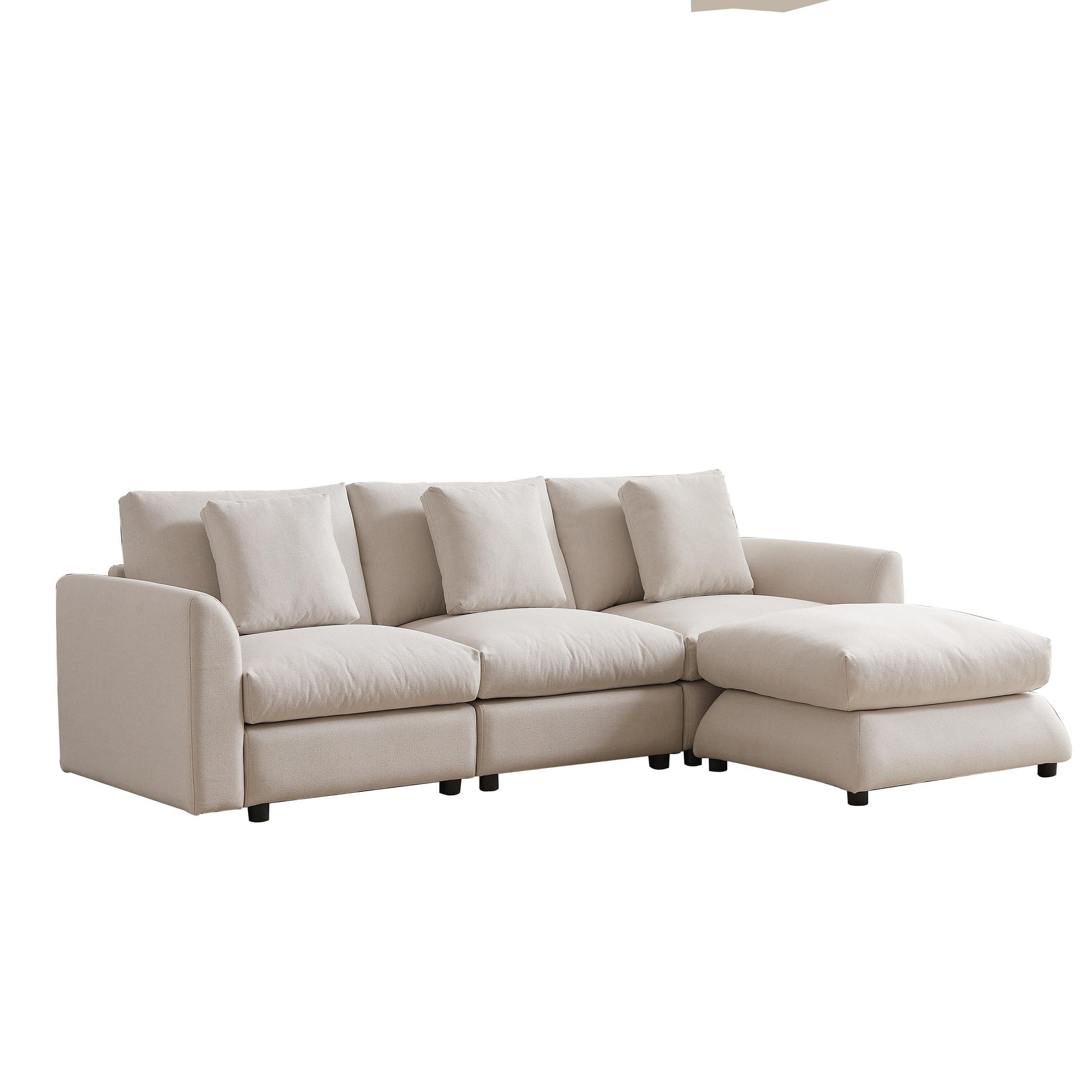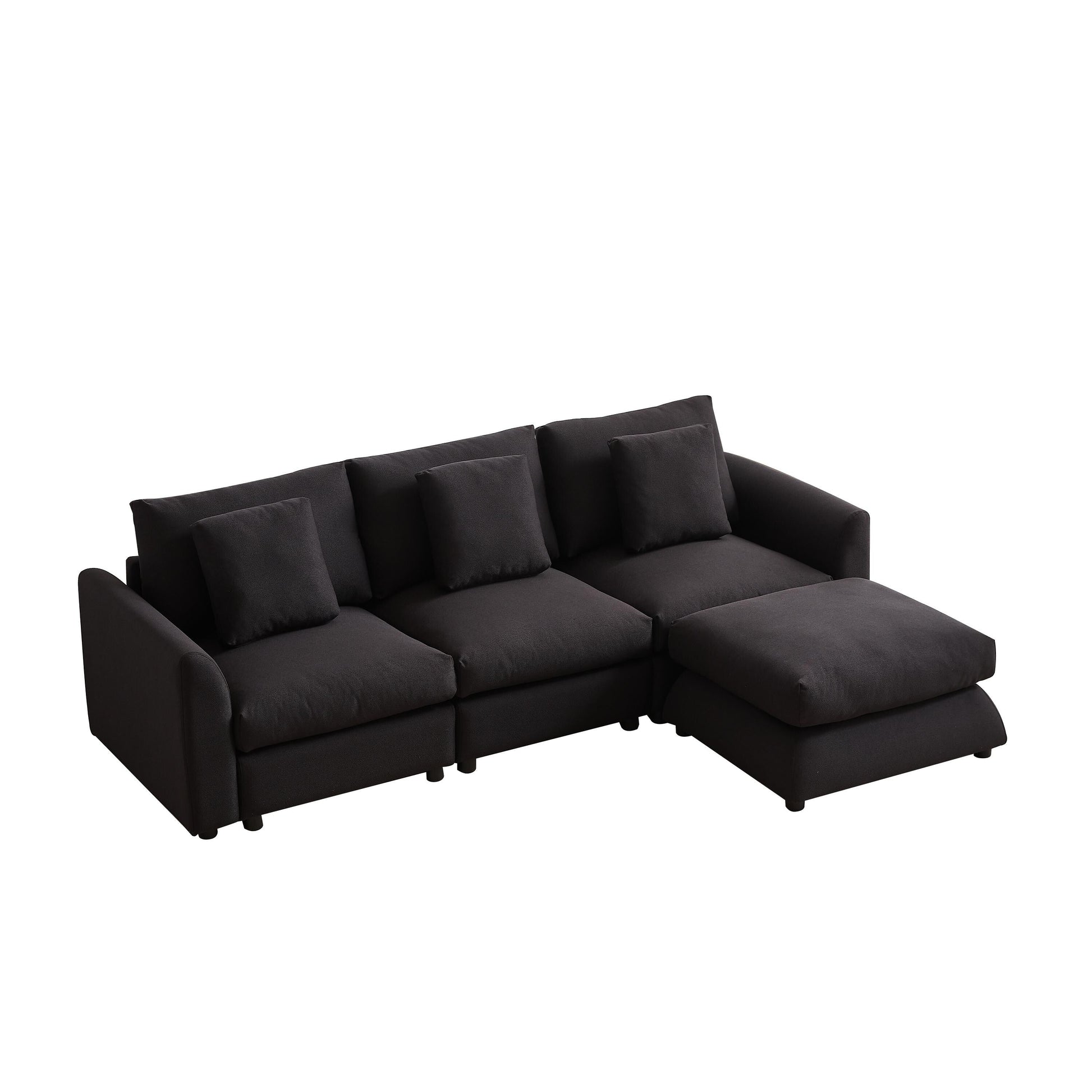 This 102.2-inch modular L-shaped sofa features a clean, modern look with three back cushions and three pillows for customizable comfort. Its movable ottoman and versatile layout make it a functional choice for living rooms, apartments, or studios.