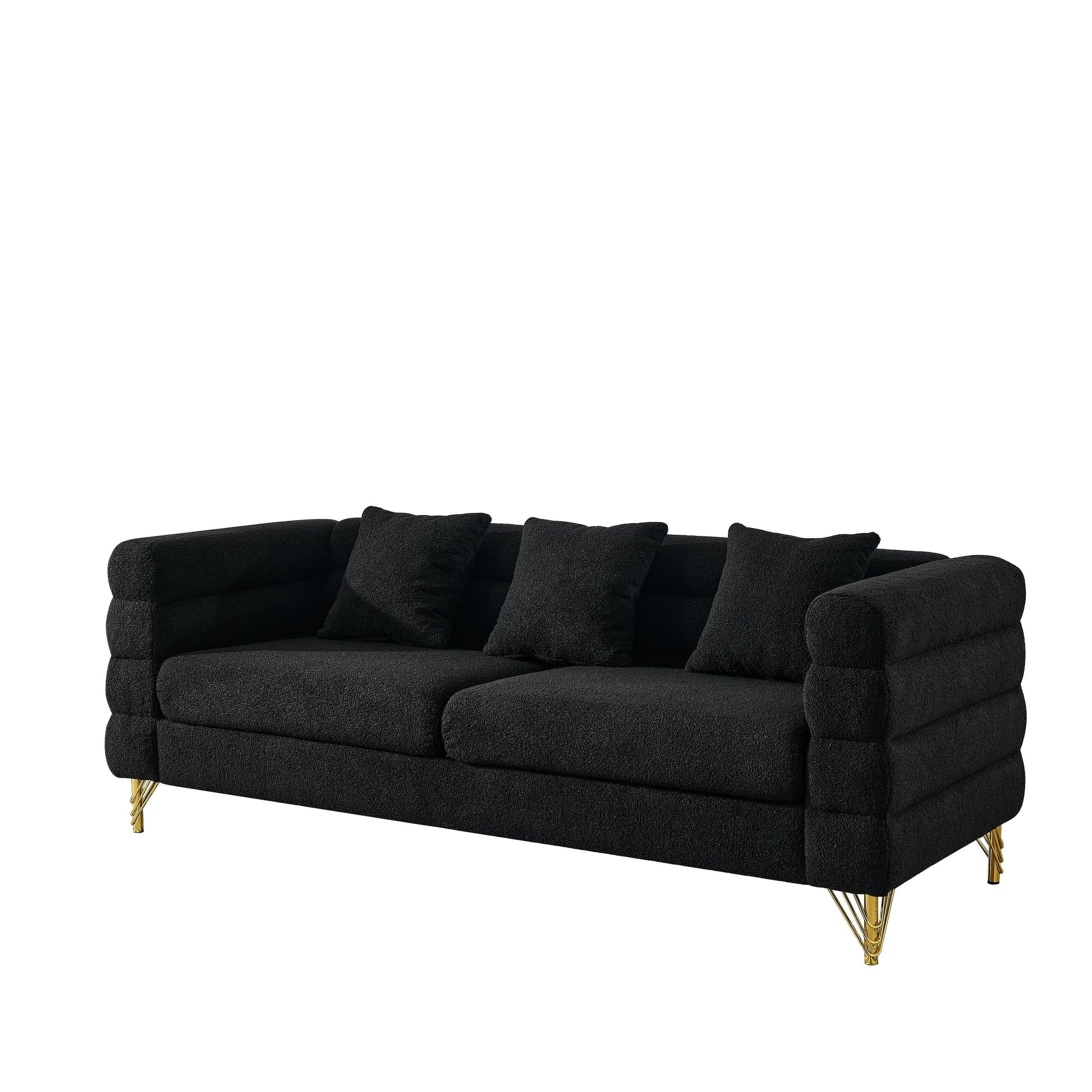 This 81-inch modern 3-seater sofa features a soft curved silhouette, metallic legs, and three matching lumbar pillows. With deep seating, durable construction, and a contemporary look, it brings both comfort and function to living rooms or bedrooms.