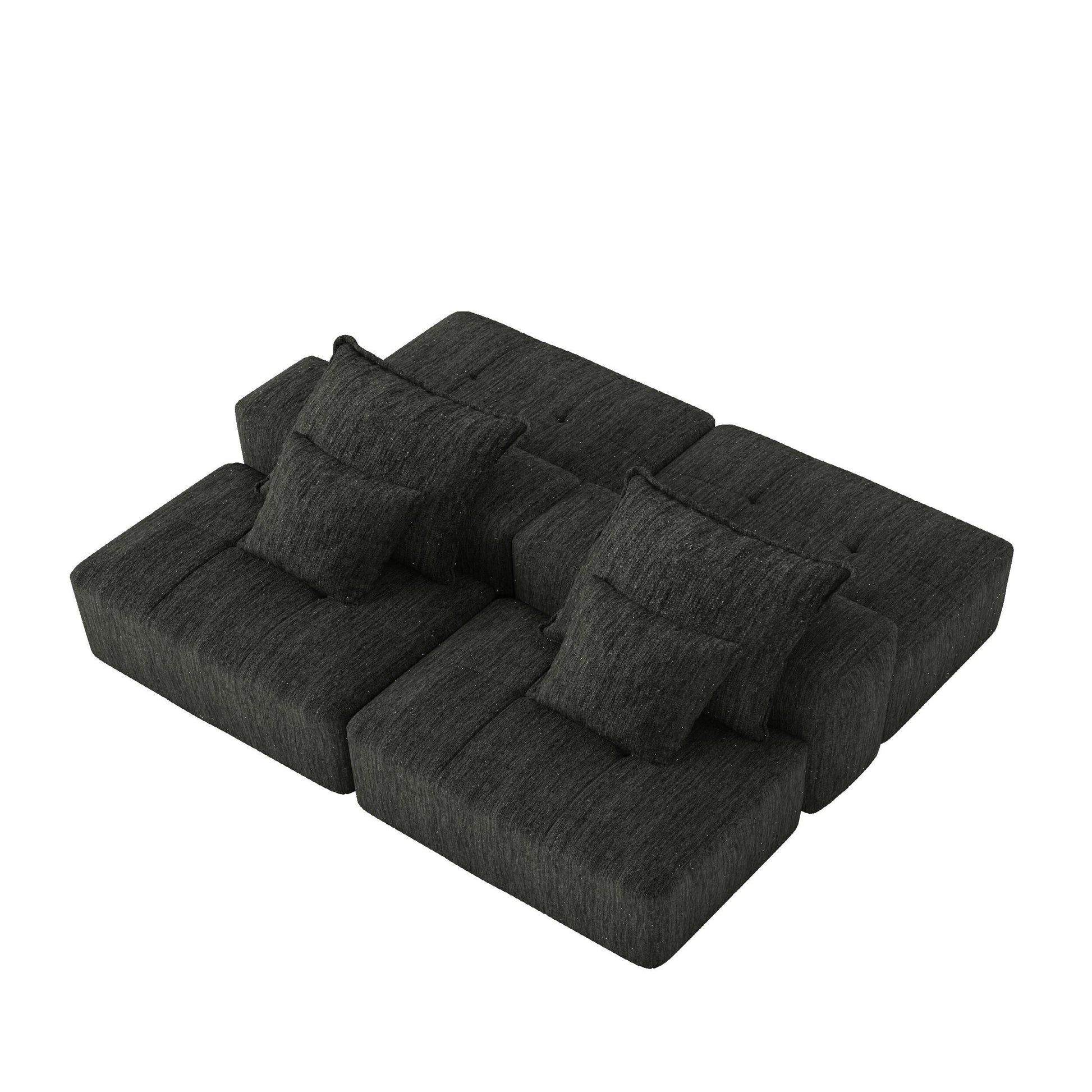This oversized modular sofa features shimmering chenille fabric, quilted cushions, and a tool-free setup. With two ottomans and a customizable layout, it blends comfort and function in a modern design that suits both compact and spacious living areas.