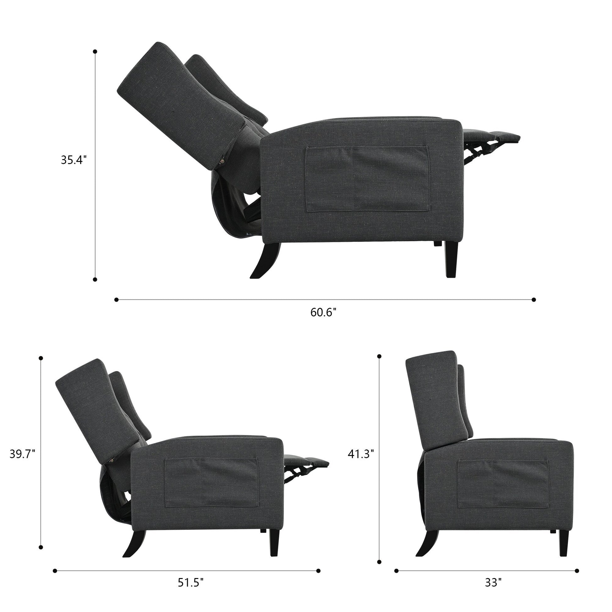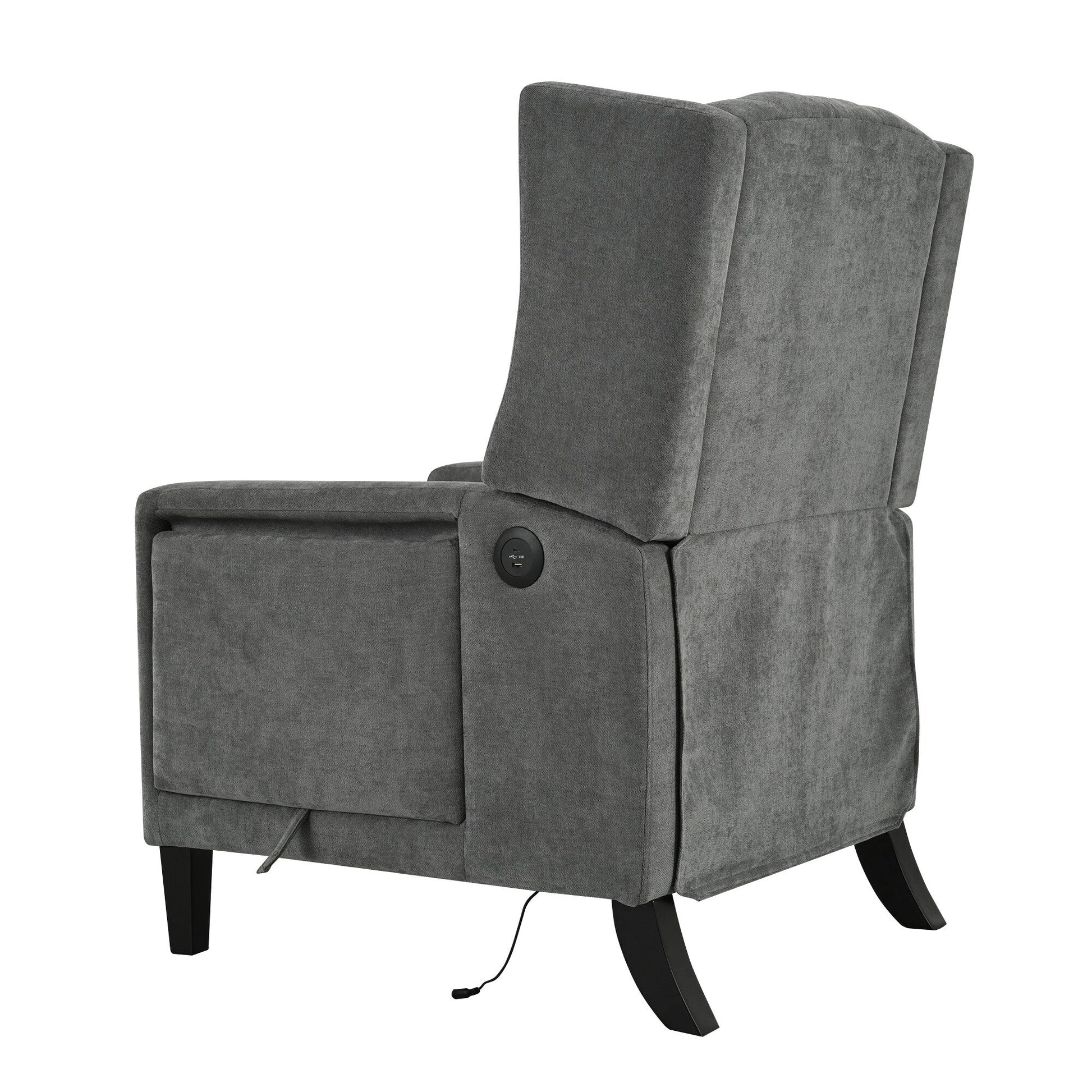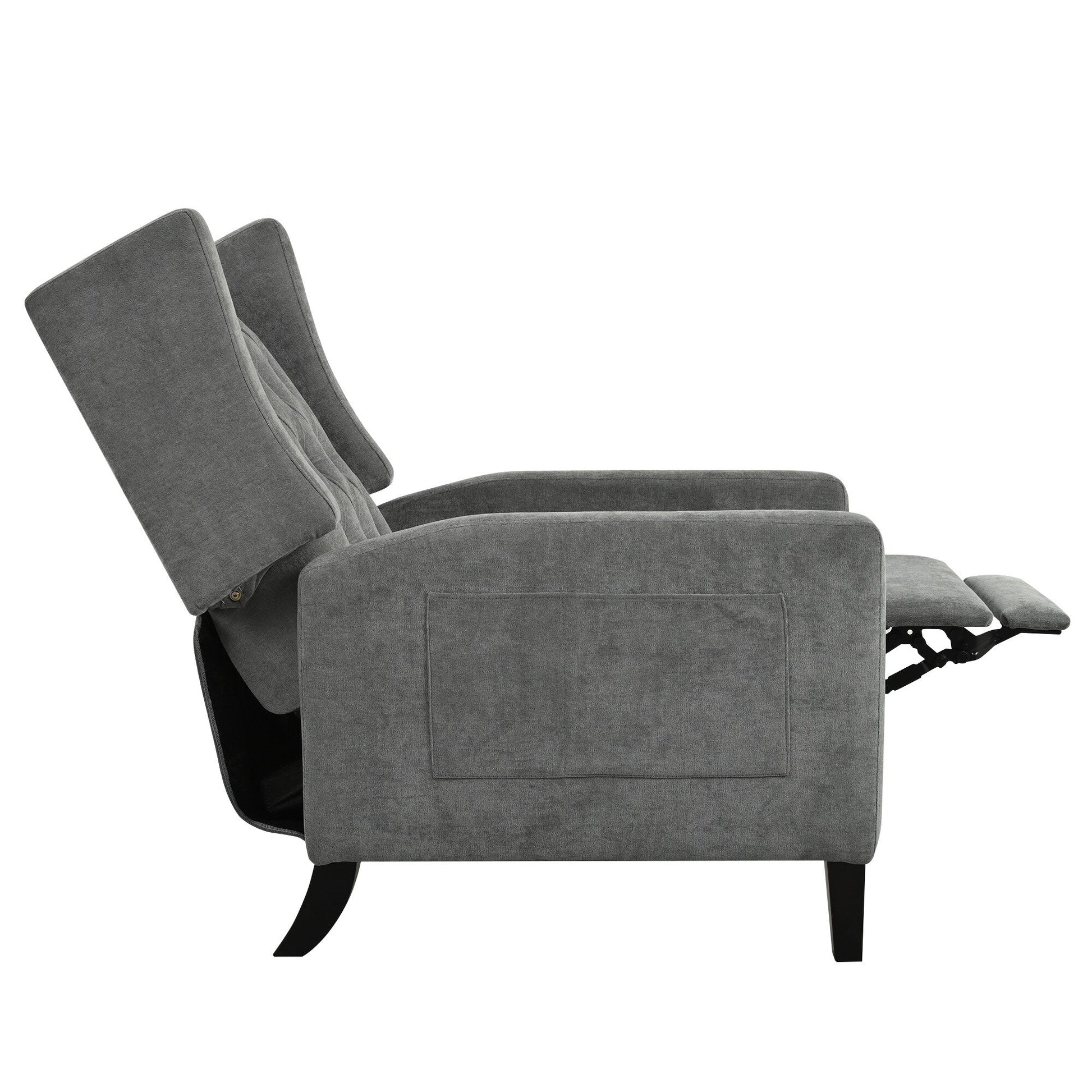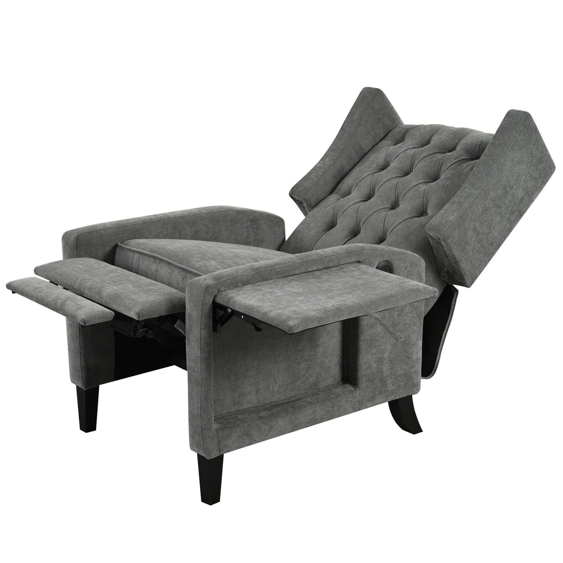 • This manual push-back recliner features a tufted diamond button design that adds elegance to any room. Upholstered in soft fabric with high-density foam, it offers a cozy seating experience. The foldable side table and built-in USB port provide added convenience for reading or relaxing. Crafted with a sturdy solid wood frame and smooth reclining mechanism, this chair fits well in living rooms, bedrooms, dorms, or offices.
