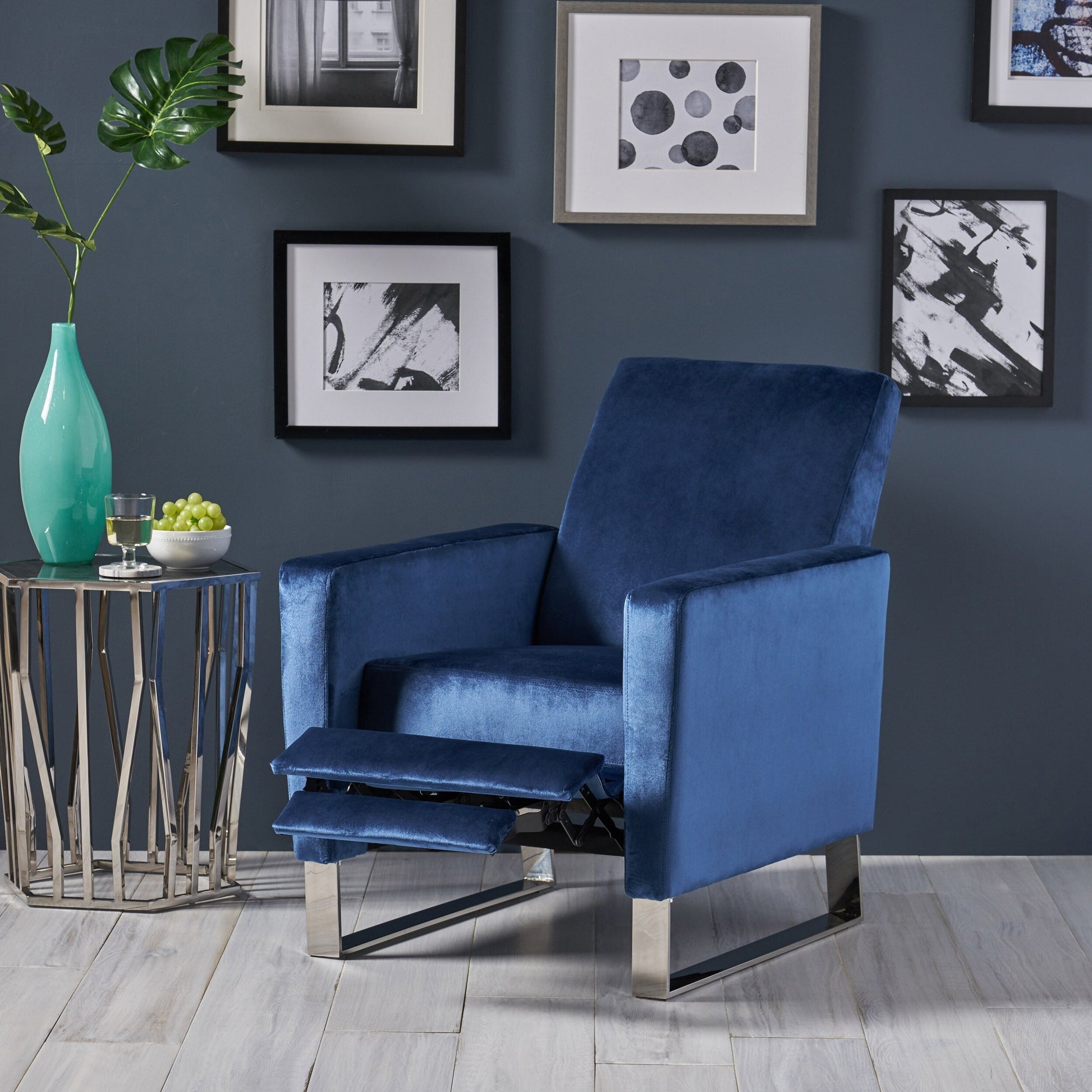 • MODERN GLAM: Mix modern with glam for an impressive recliner chair that will instantly transform your home décor. With a gorgeous velvety texture accented with silver legs, this sleek piece pairs clean lines and fresh colors for a gorgeous addition to any room.