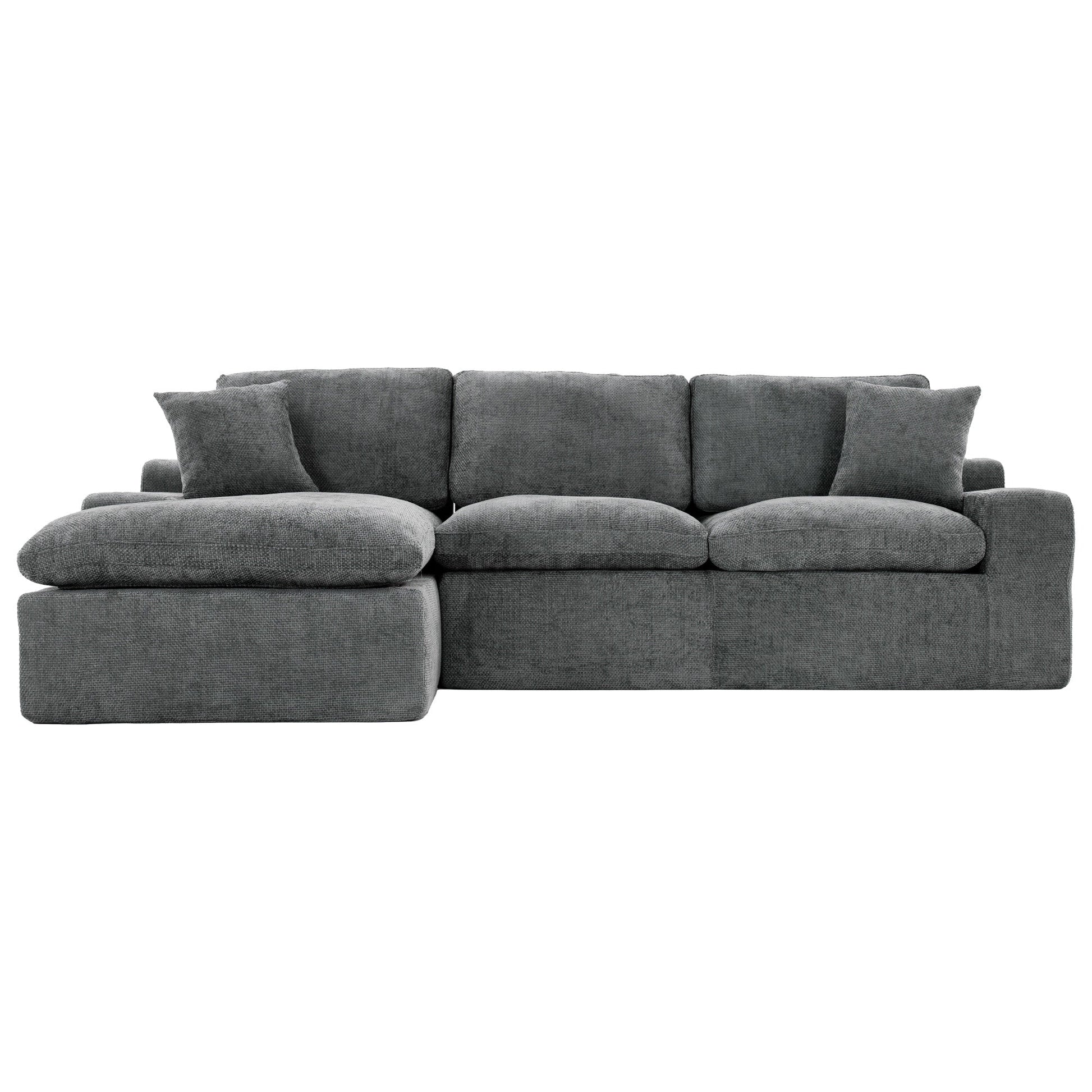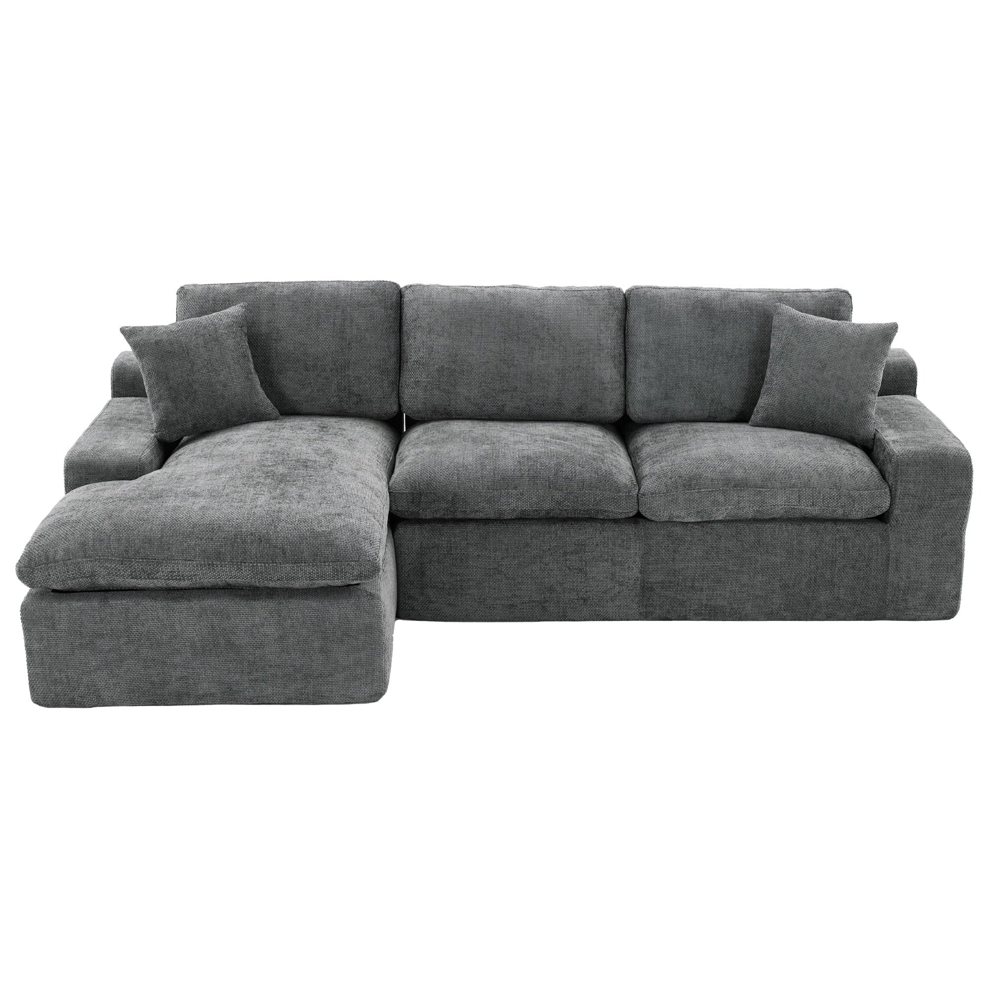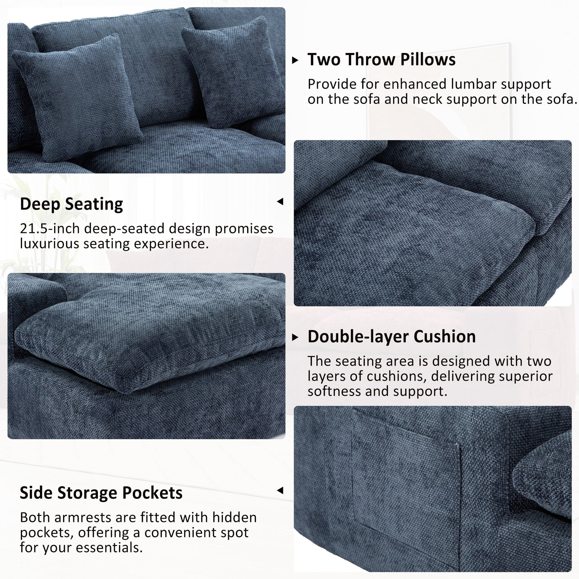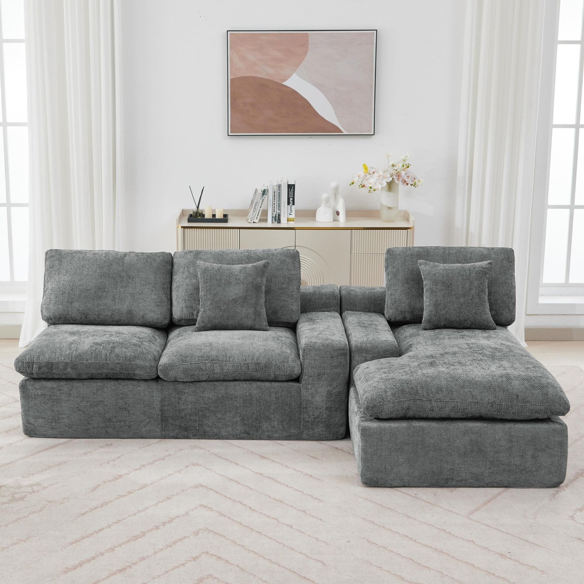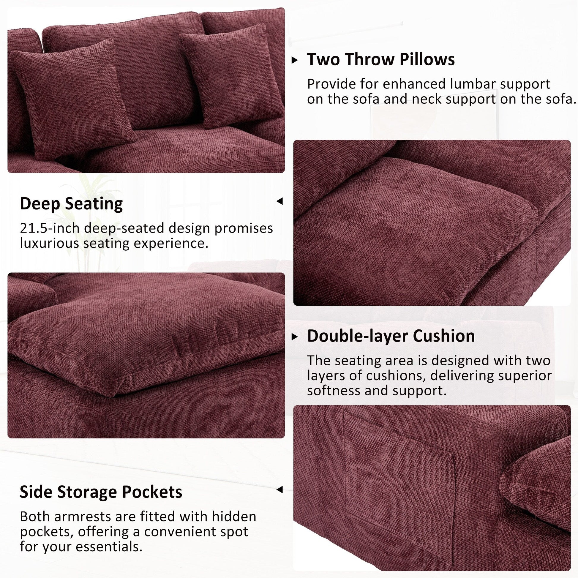 This modular cloud sectional sofa offers versatile configurations to fit any living space. Featuring double-layer cushions with soft compressed foam and sturdy support, it provides balanced comfort. Upholstered in durable chenille fabric, it includes deep 21.5-inch seats, hidden side storage pockets, and two matching pillows for added convenience and style.