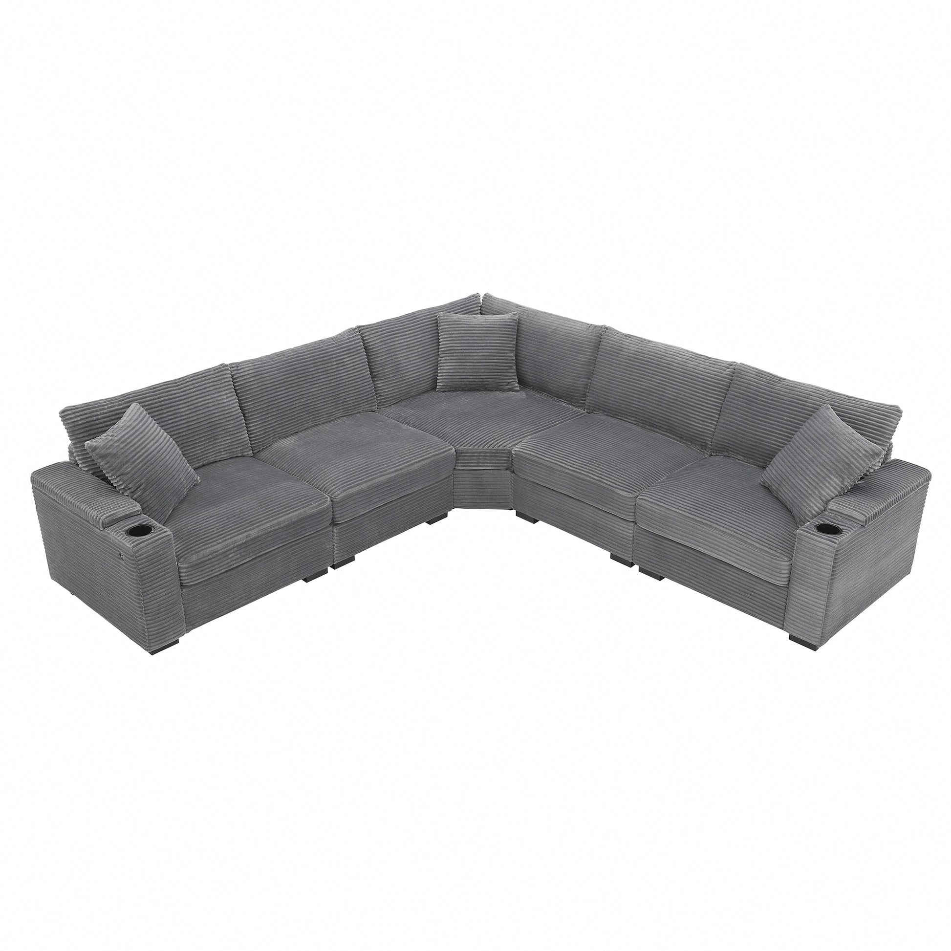 This 5-seat modular corduroy sofa offers a blend of comfort and practicality with hidden armrest storage, built-in cup holders, and USB charging ports. The L-shaped layout can be rearranged to fit various spaces, while the soft ribbed fabric adds a cozy and stylish touch to any living room or apartment.