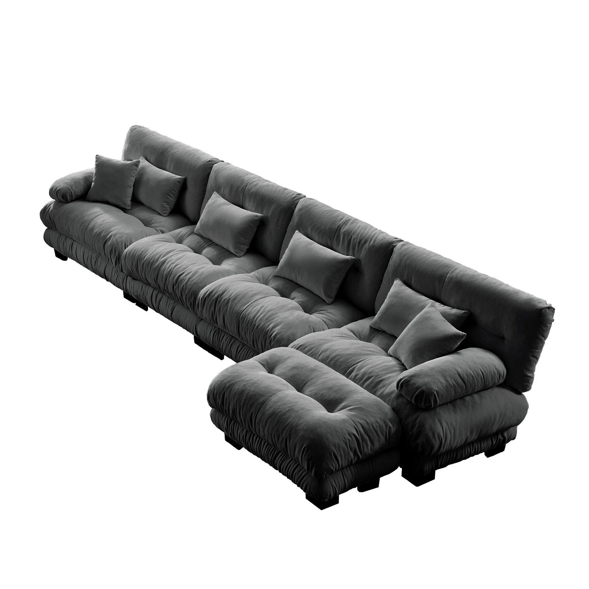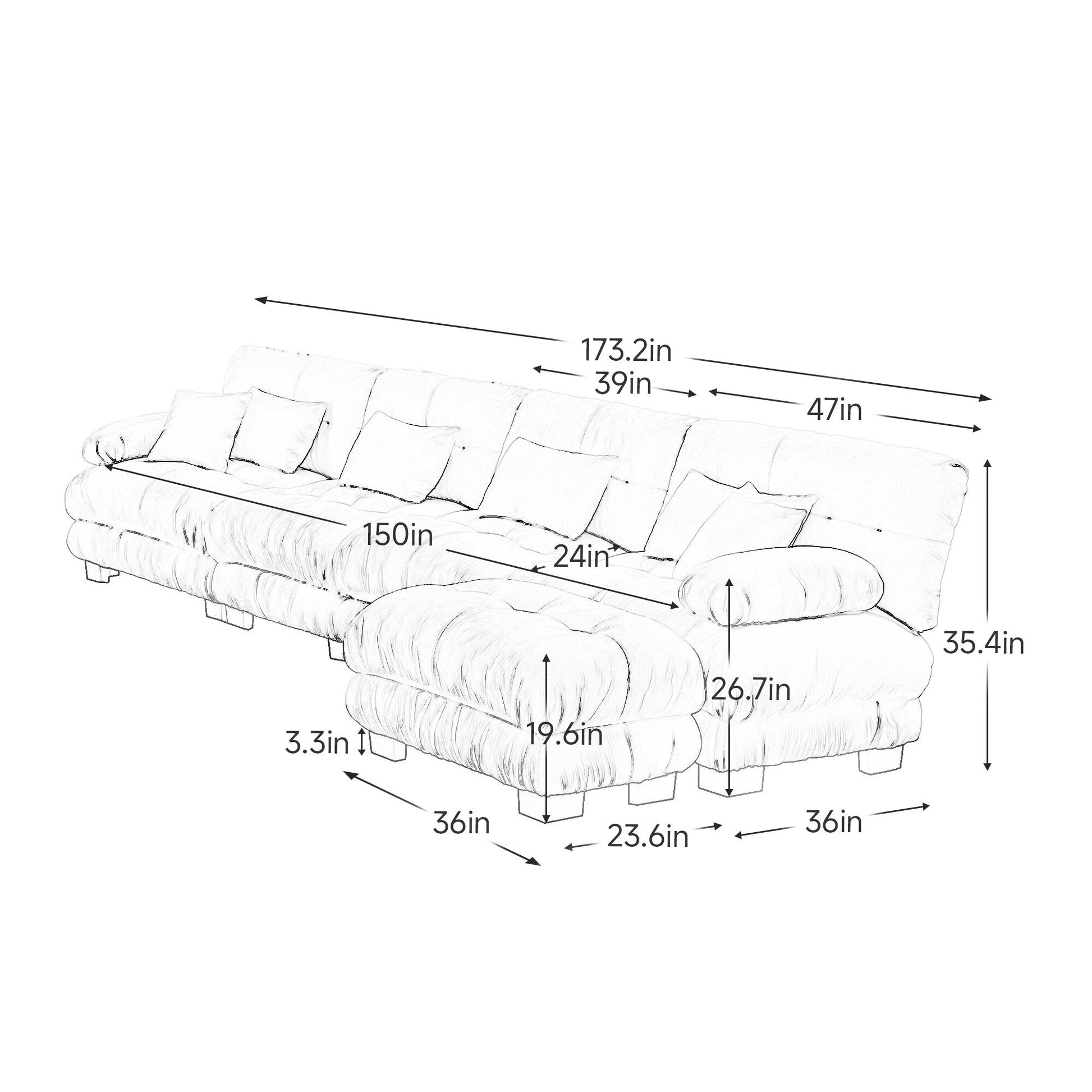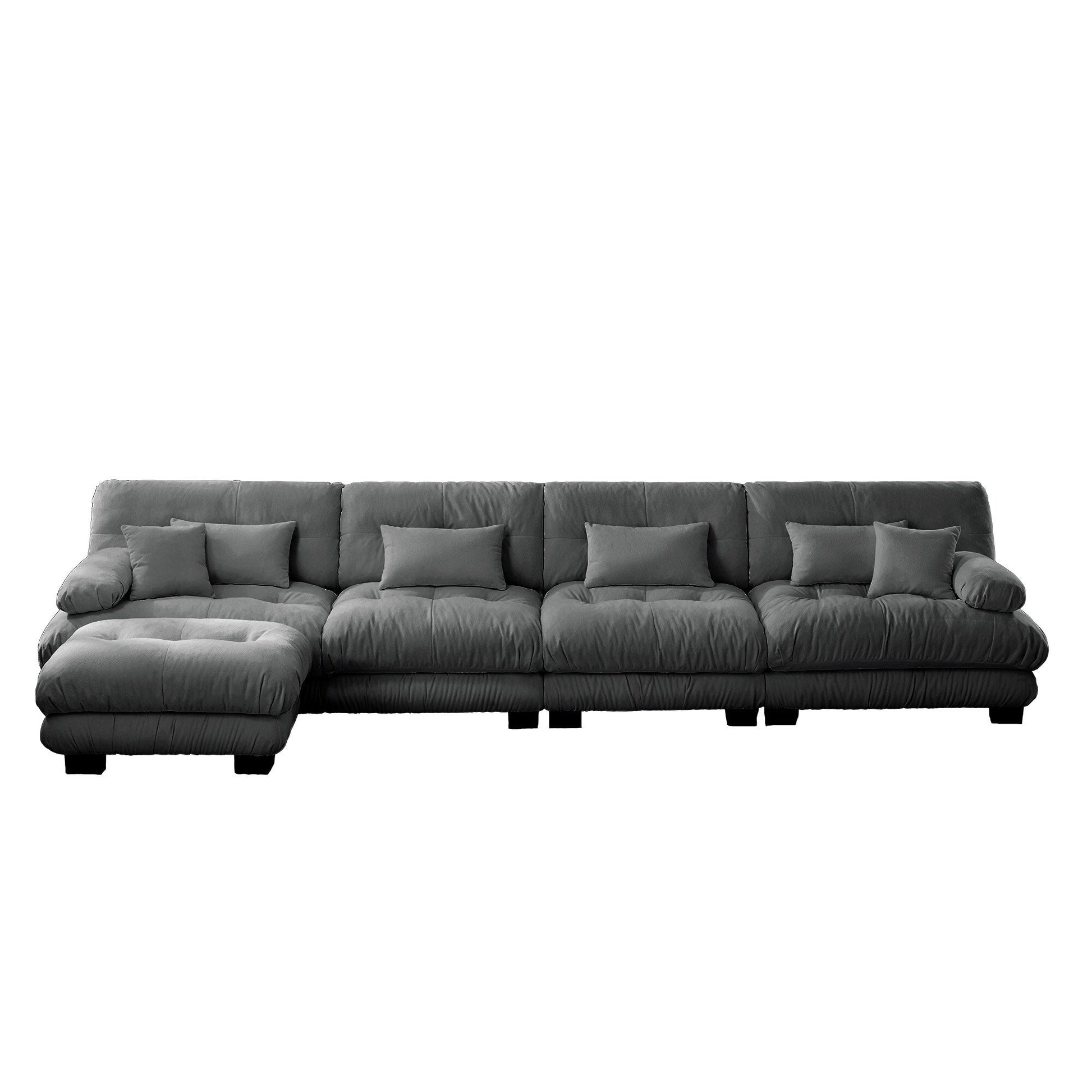 This modular L-shaped chenille sofa features deep seating, cloud-like comfort, and flexible arrangements. Soft cushions and rounded pillow armrests enhance relaxation, while included ottomans allow easy reconfiguration for your space needs.