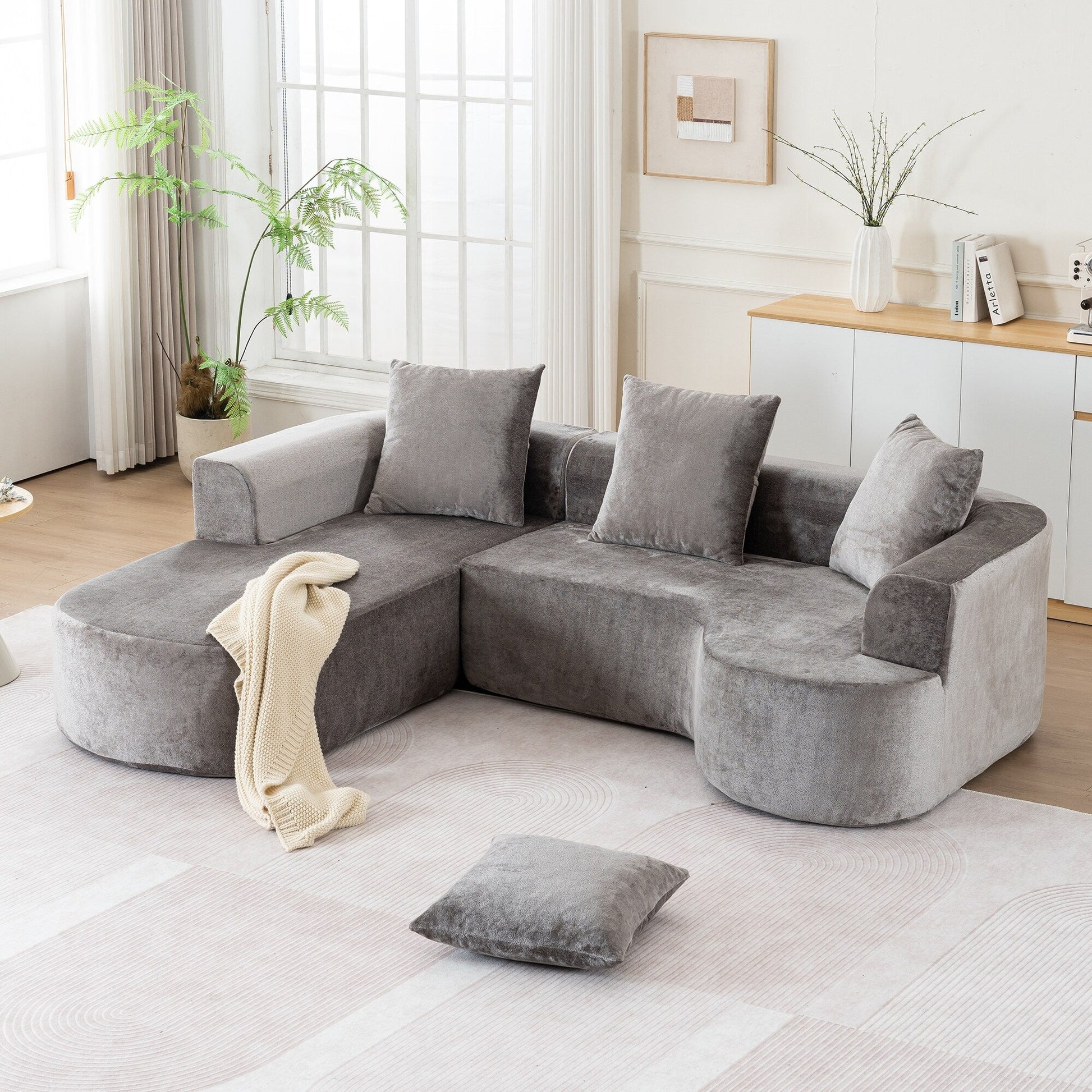 This modular L-shaped floor sofa features soft corduroy upholstery, deep seating, and high-resilience foam with spring reinforcement. Delivered vacuum-packed and assembly-free, it expands in 72 hours to offer a cozy, flexible layoutâideal for living rooms, apartments, or guest spaces.