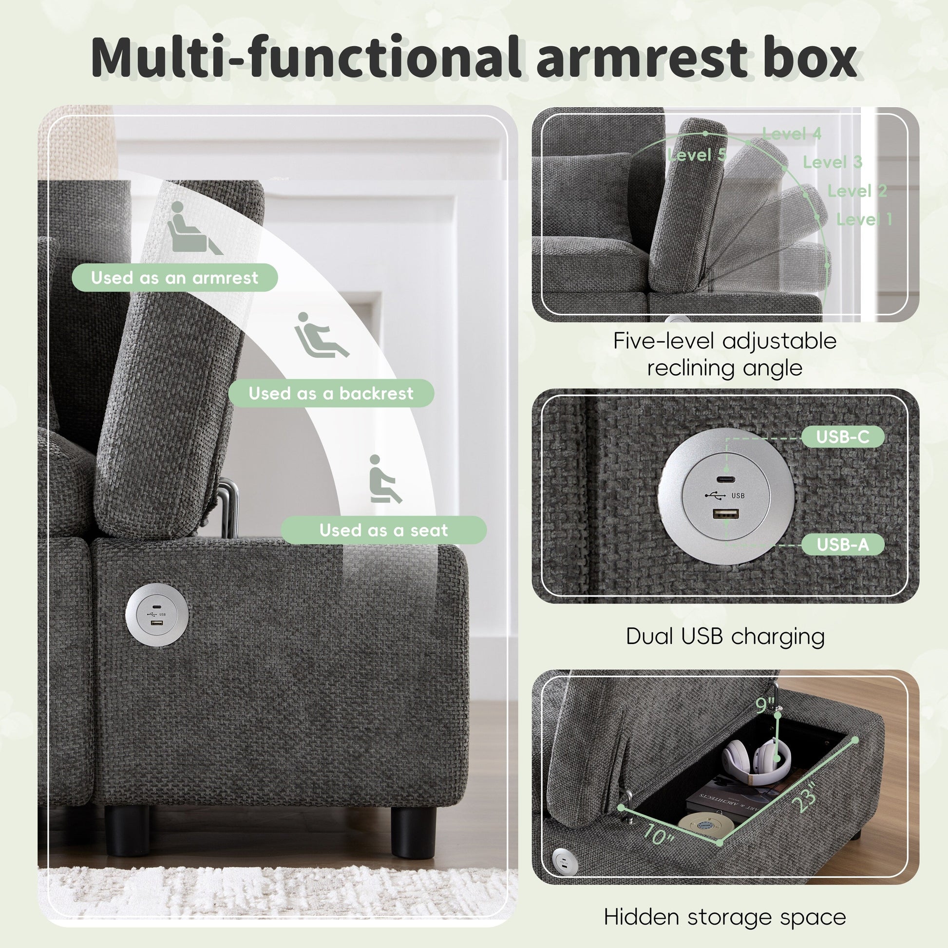 • Adjustable Charging Armrest: Armrest adjusts to 5 angles and includes USB and Type-C ports.