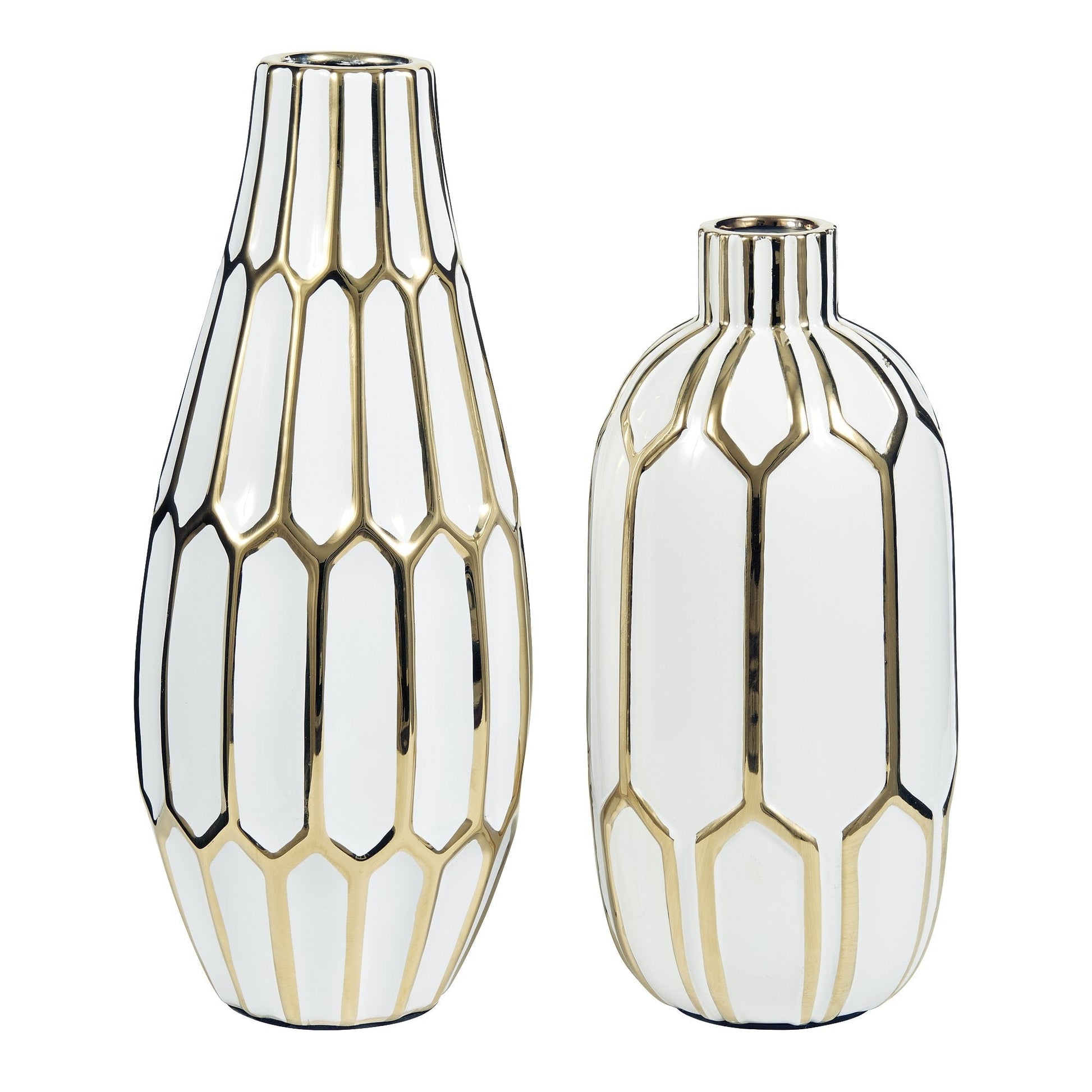 Lend a sophisticated vibe to your study, living room, or study with these elegant vases. These two vases' ceramic material and glossy finish make them weather-hardy enough for indoor or outdoor use, and their elongated geometric motif and white and gold palette lend your space a refined yet luxurious vibe.