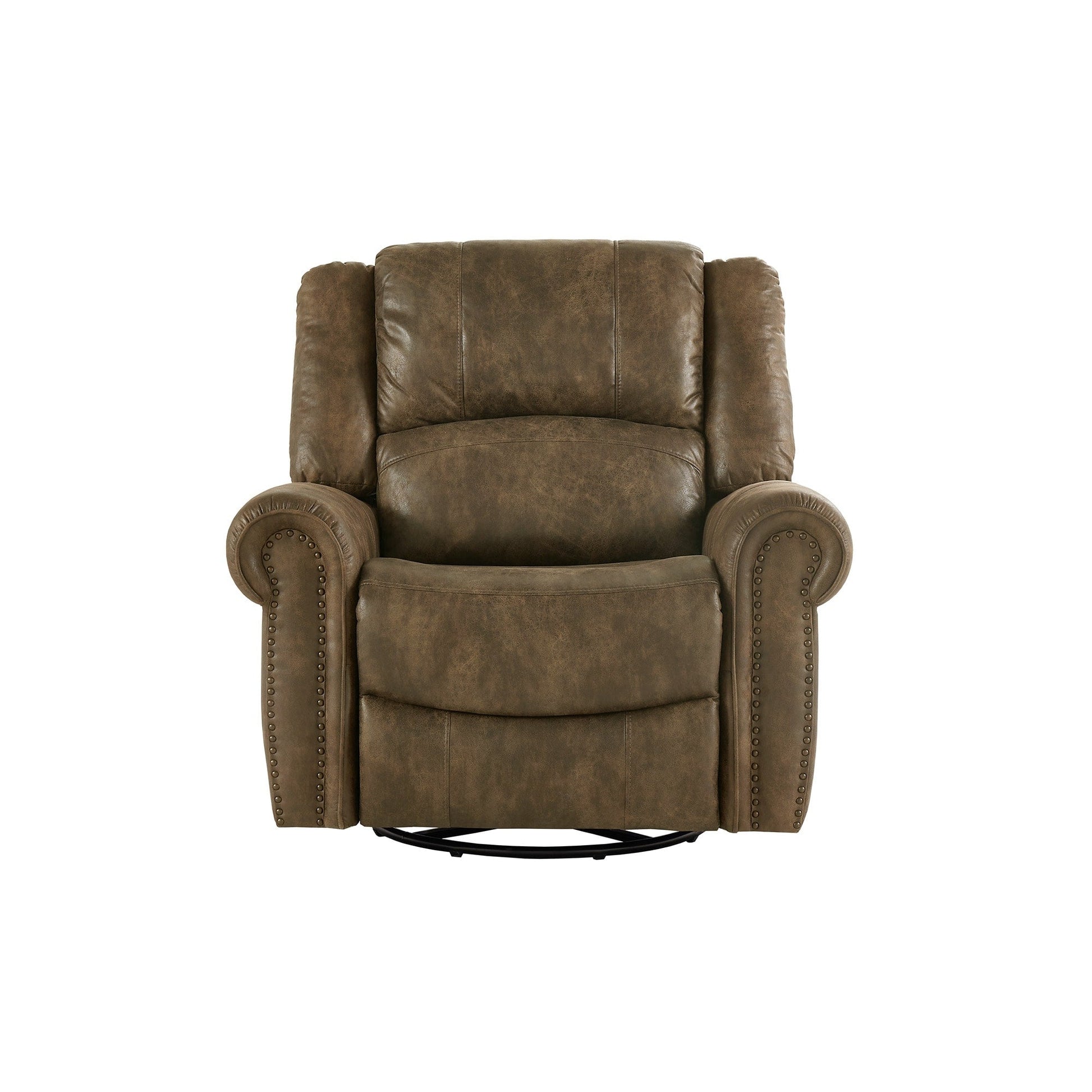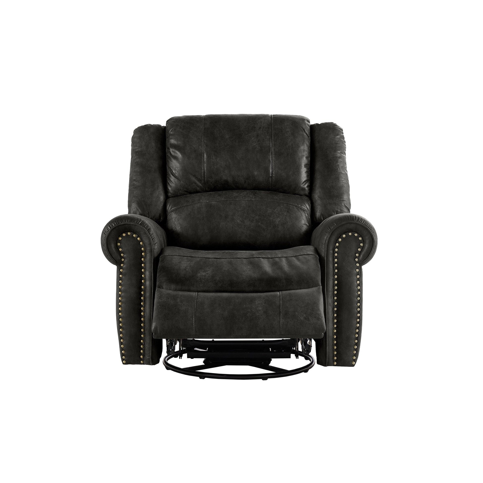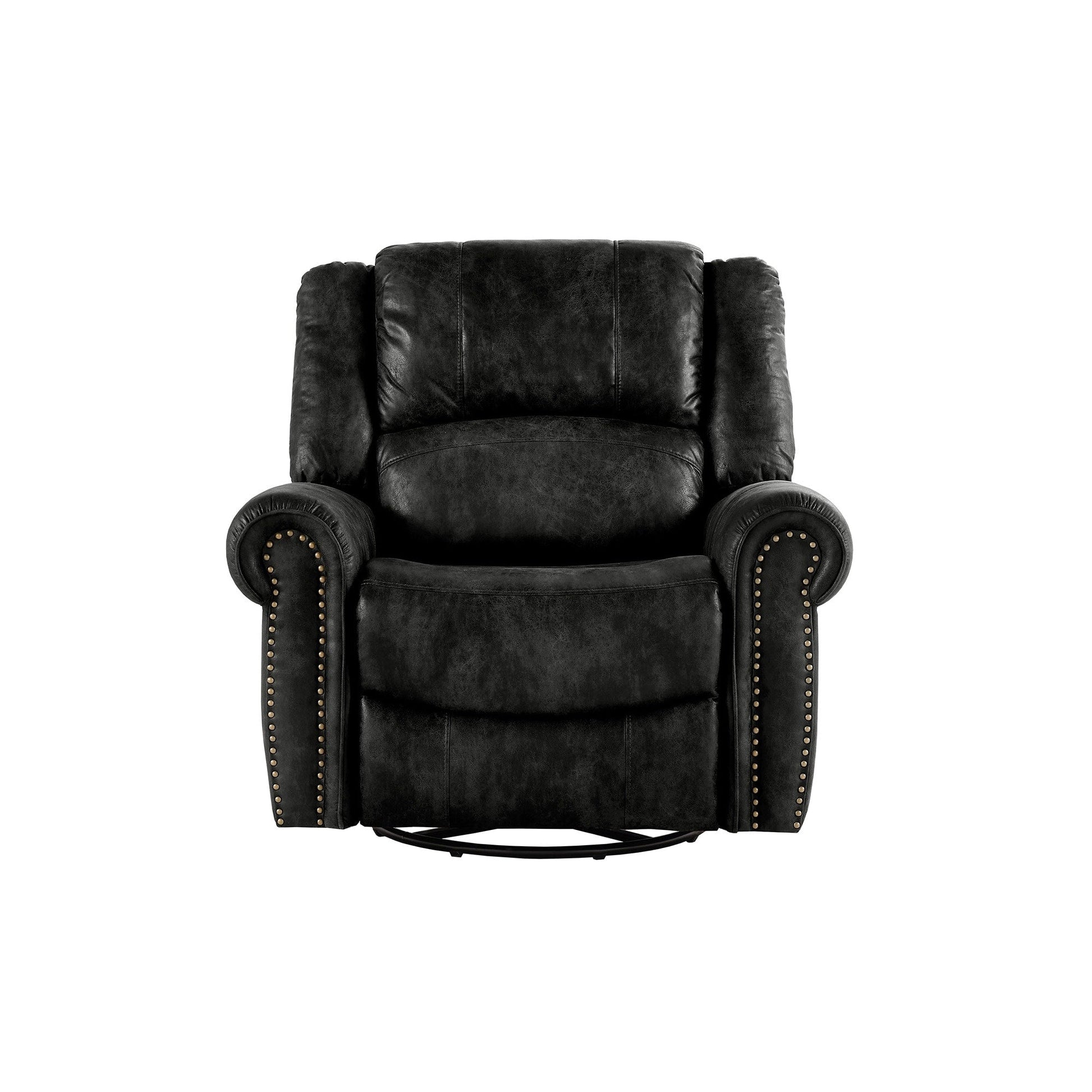 The Polished Microfiber Nailhead Swivel Glider Recliner blends timeless design with everyday comfort. Upholstered in polished microfiber with plush polyurethane foam padding, this recliner offers luxurious support and durability. The sturdy black iron swivel base and smooth gliding motion ensure ultimate relaxation, while the easy 2-step assembly means it's ready to enjoy in no time. Nailhead trim details and classic rolled arms add a touch of elegance to any space.