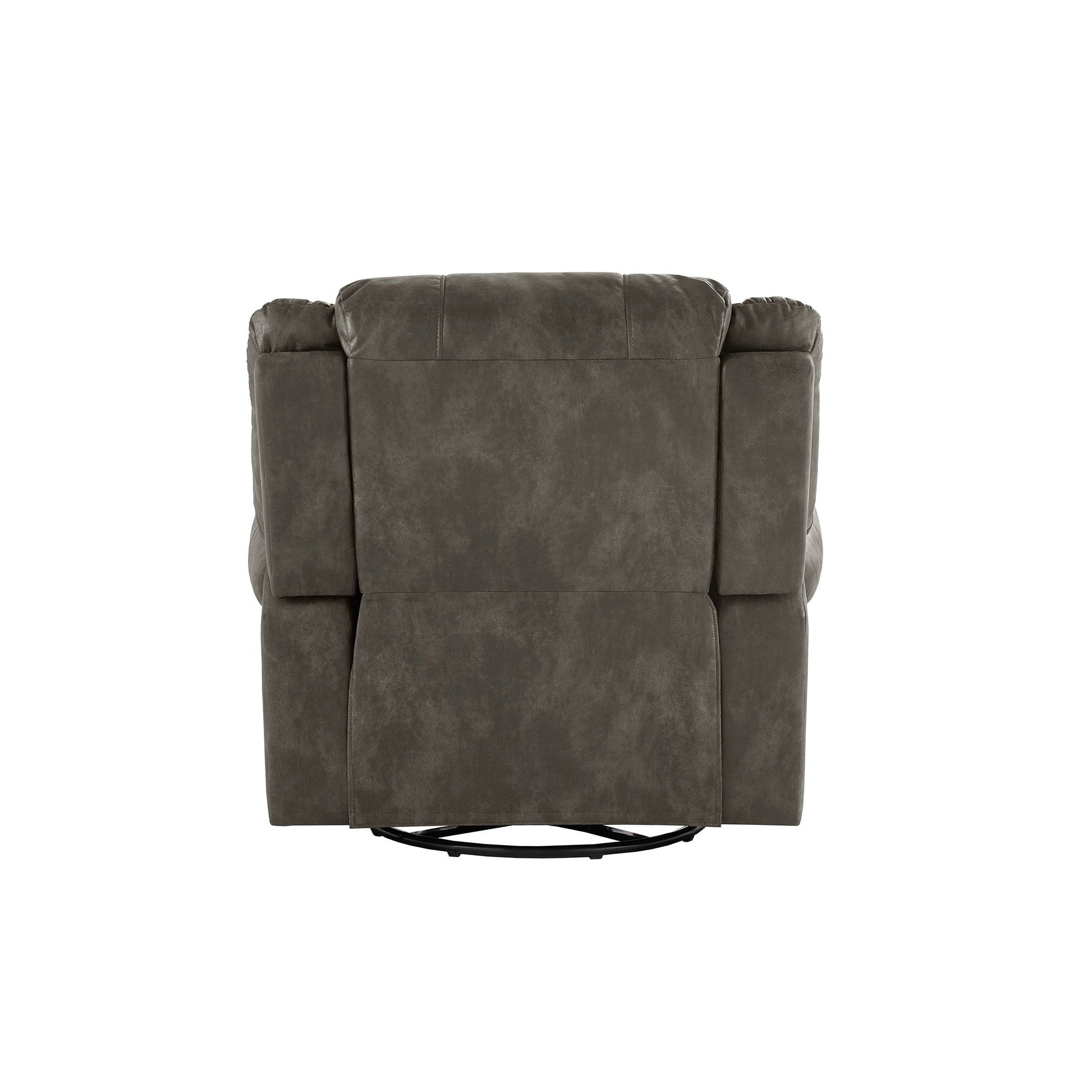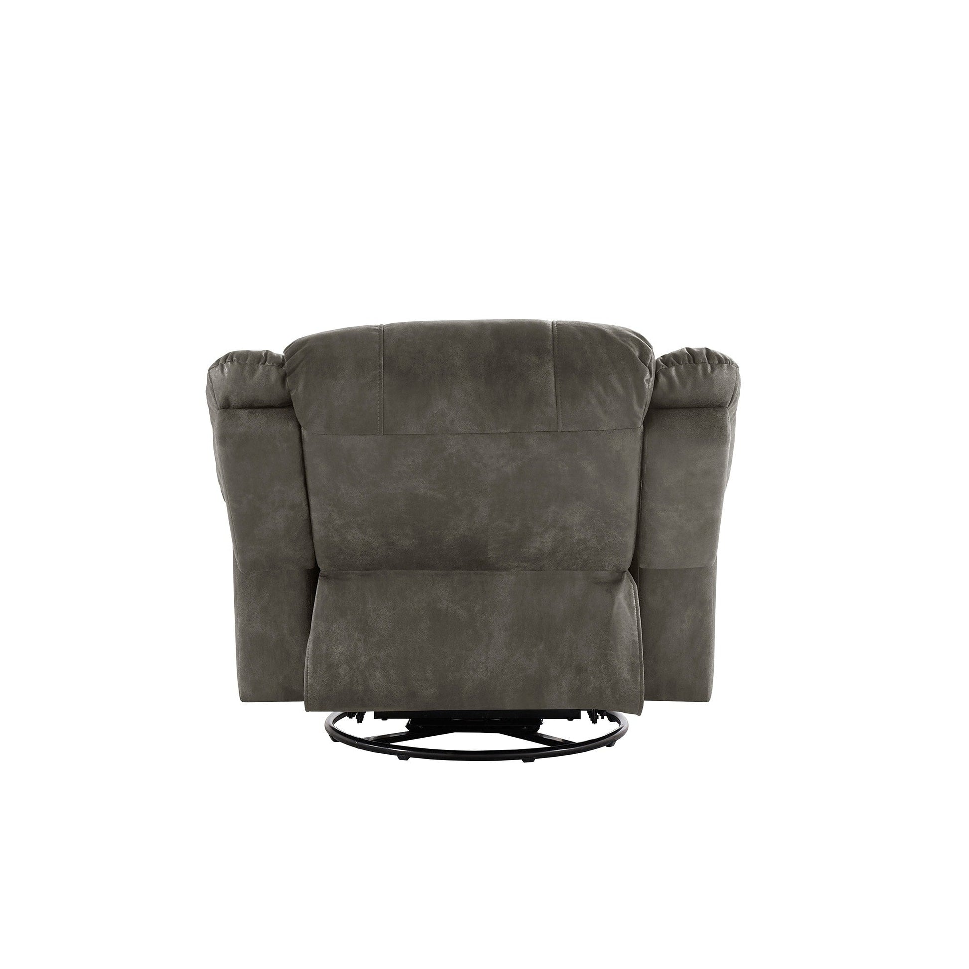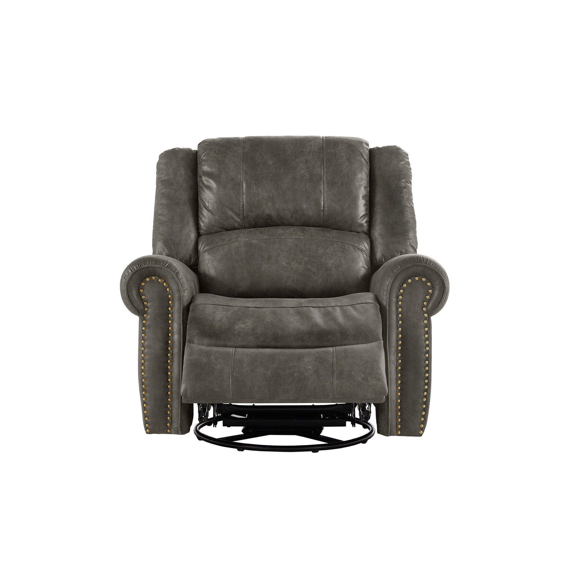 The Polished Microfiber Nailhead Swivel Glider Recliner blends timeless design with everyday comfort. Upholstered in polished microfiber with plush polyurethane foam padding, this recliner offers luxurious support and durability. The sturdy black iron swivel base and smooth gliding motion ensure ultimate relaxation, while the easy 2-step assembly means it's ready to enjoy in no time. Nailhead trim details and classic rolled arms add a touch of elegance to any space.