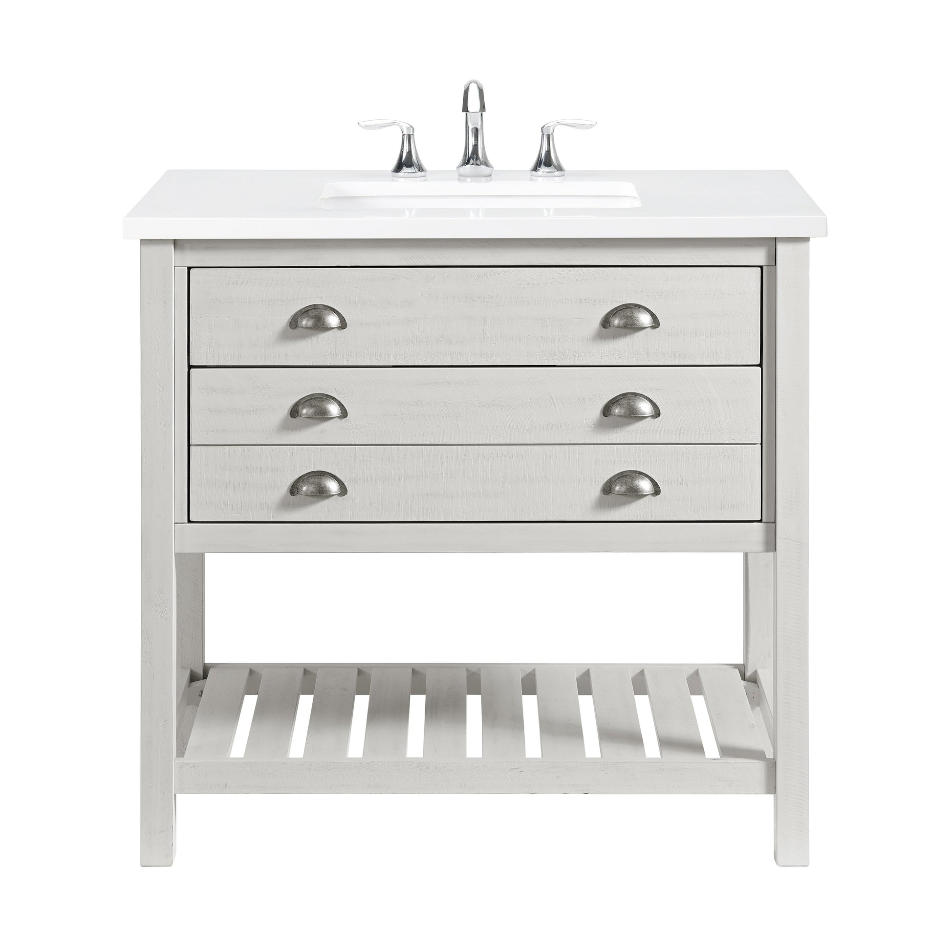 Transform your bathroom into a coastal farmhouse oasis with the Monterey 37' single bathroom vanity. Crafted from durable solid pine wood base, this single sink vanity features a solid white cultured marble top with pre-drilled holes for an 8' faucet (faucet not included). One nicely sized split drawer and a top tilt down drawer offer plenty of storage space for toiletries. A bottom slat shelf provides additional storage space for towels, linens, and other items.