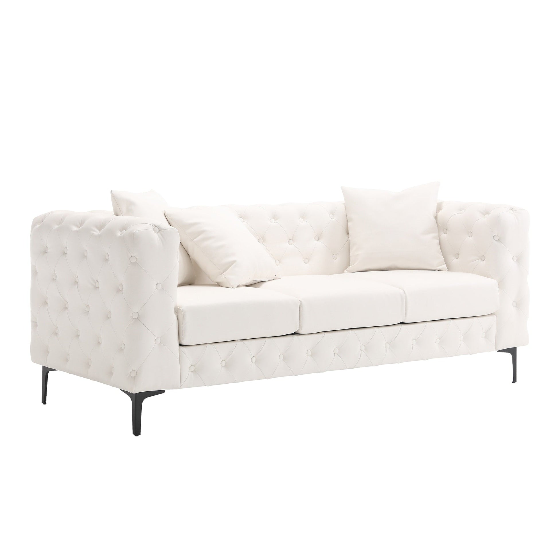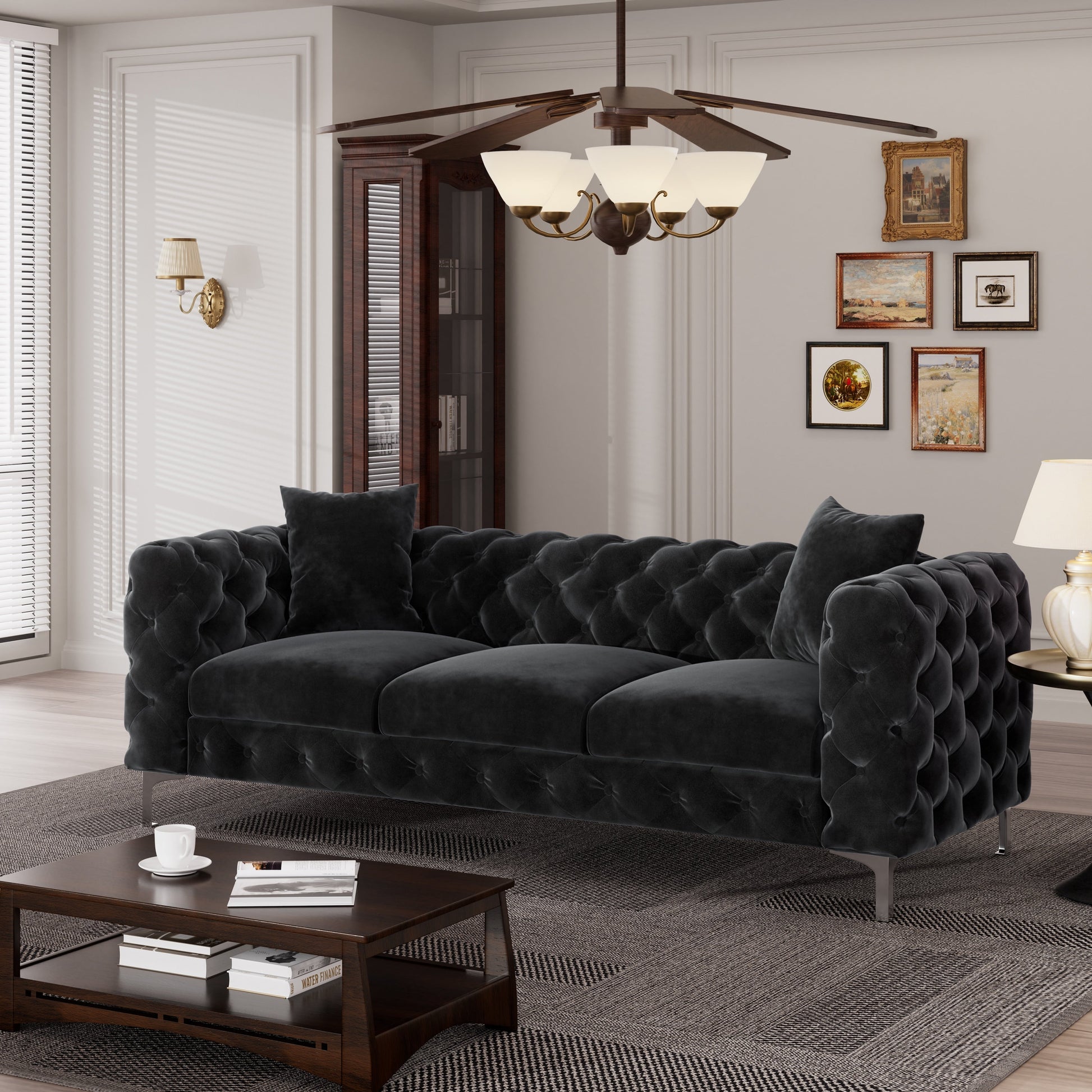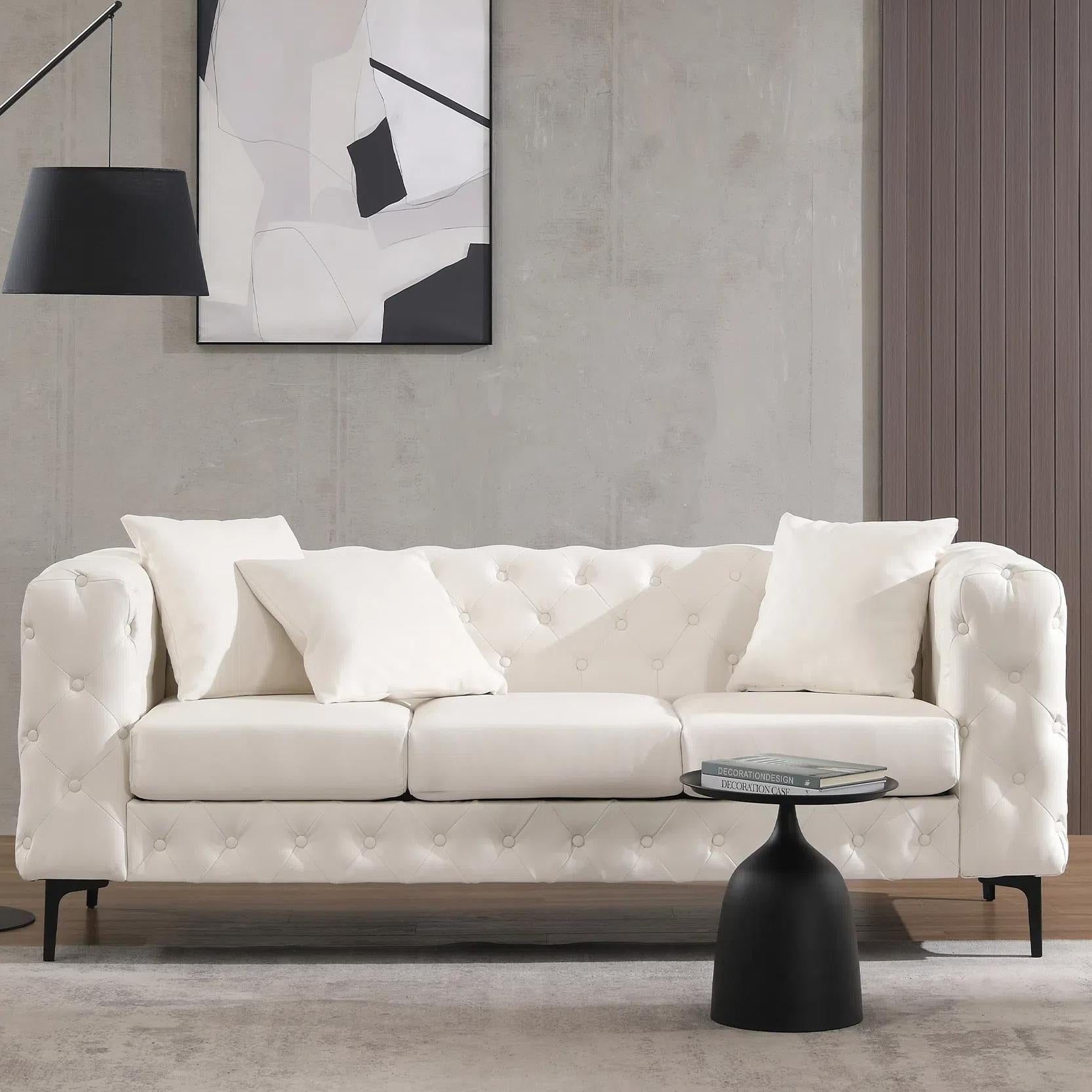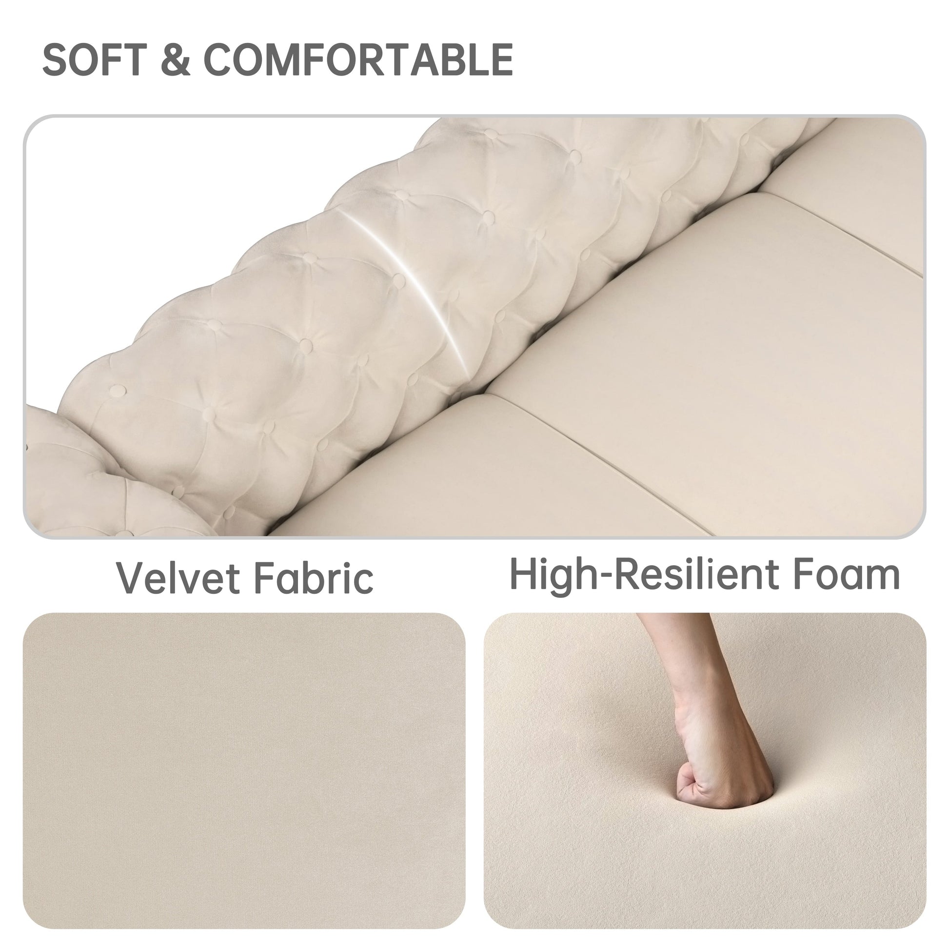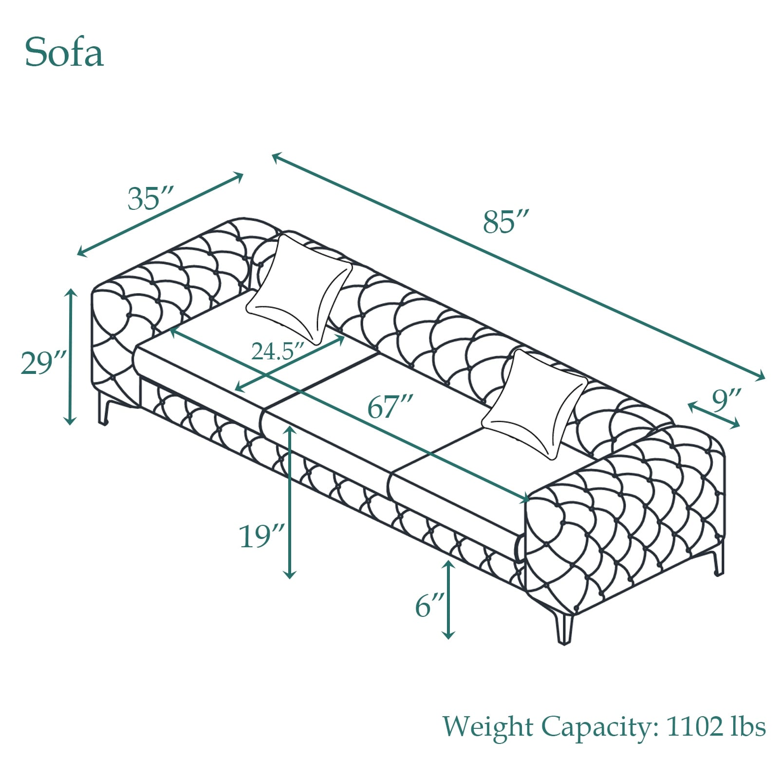Indulge in the sophistication and luxury of this Modern Button Tufted Sofa. Inspired by 1930s British design, this sofa boasts a regal yet resilient appeal with its soft upholstery, overstuffed construction, and high resilience foam. The deep button tufting and iron legs add a touch of glamour to this eye-catching piece, making it a stunning addition to any space.