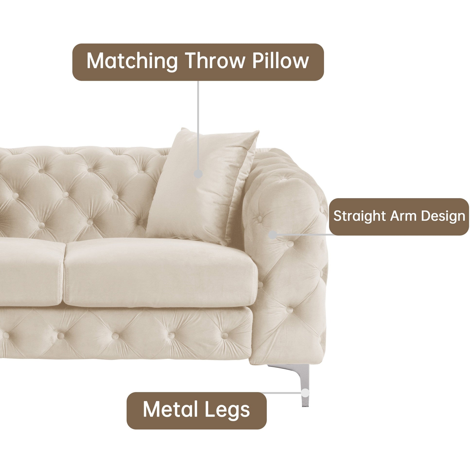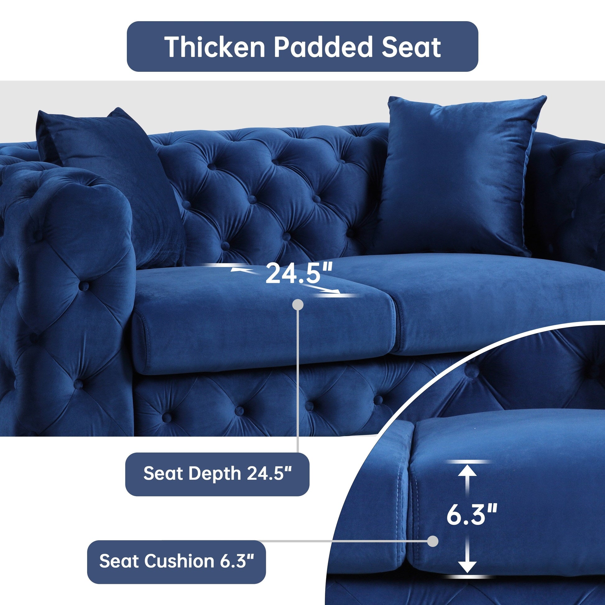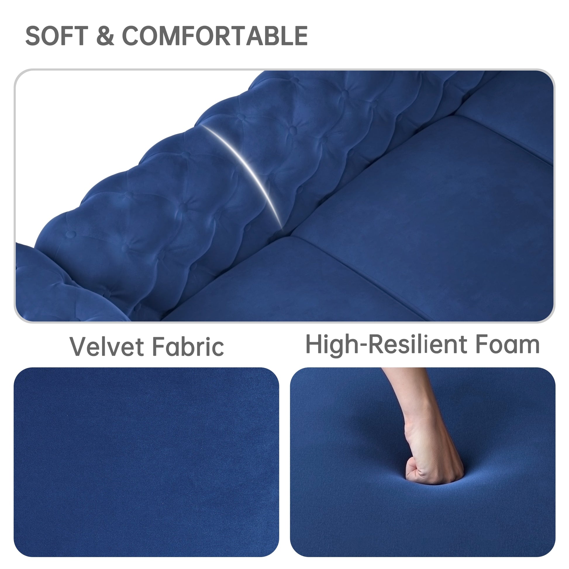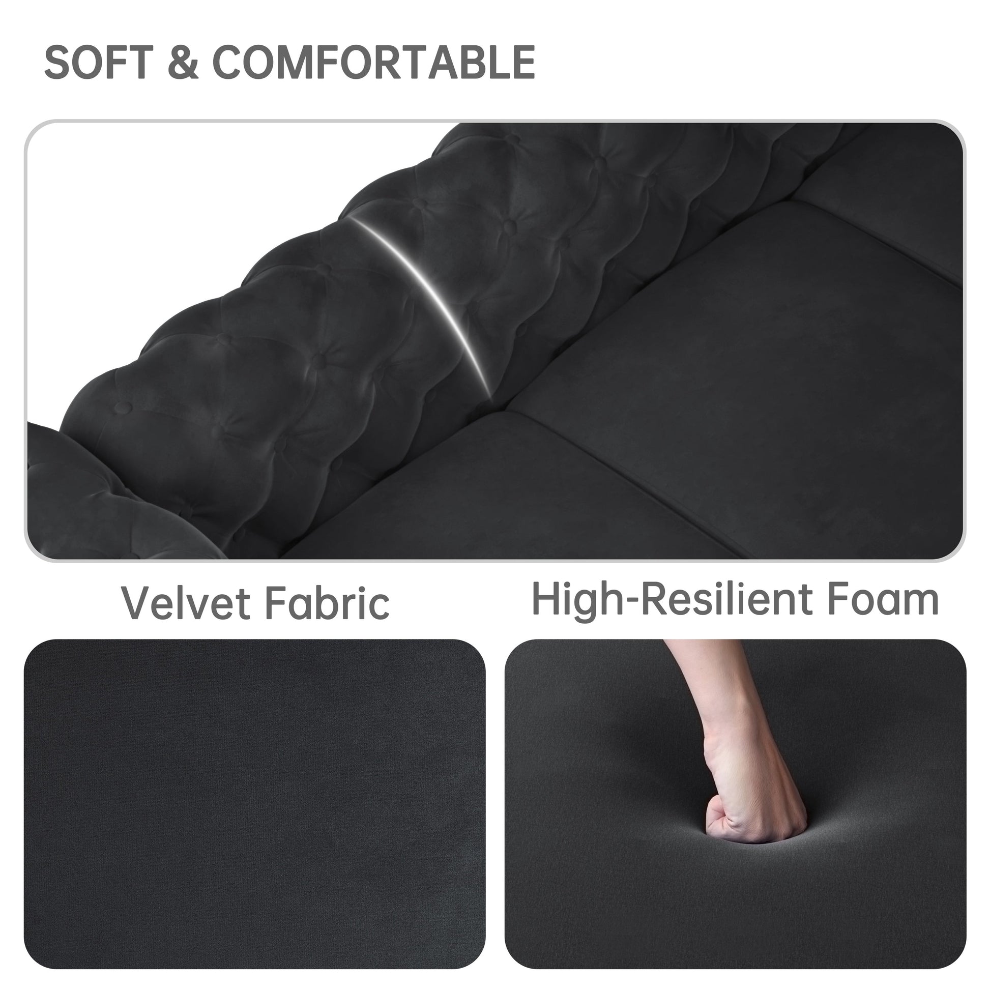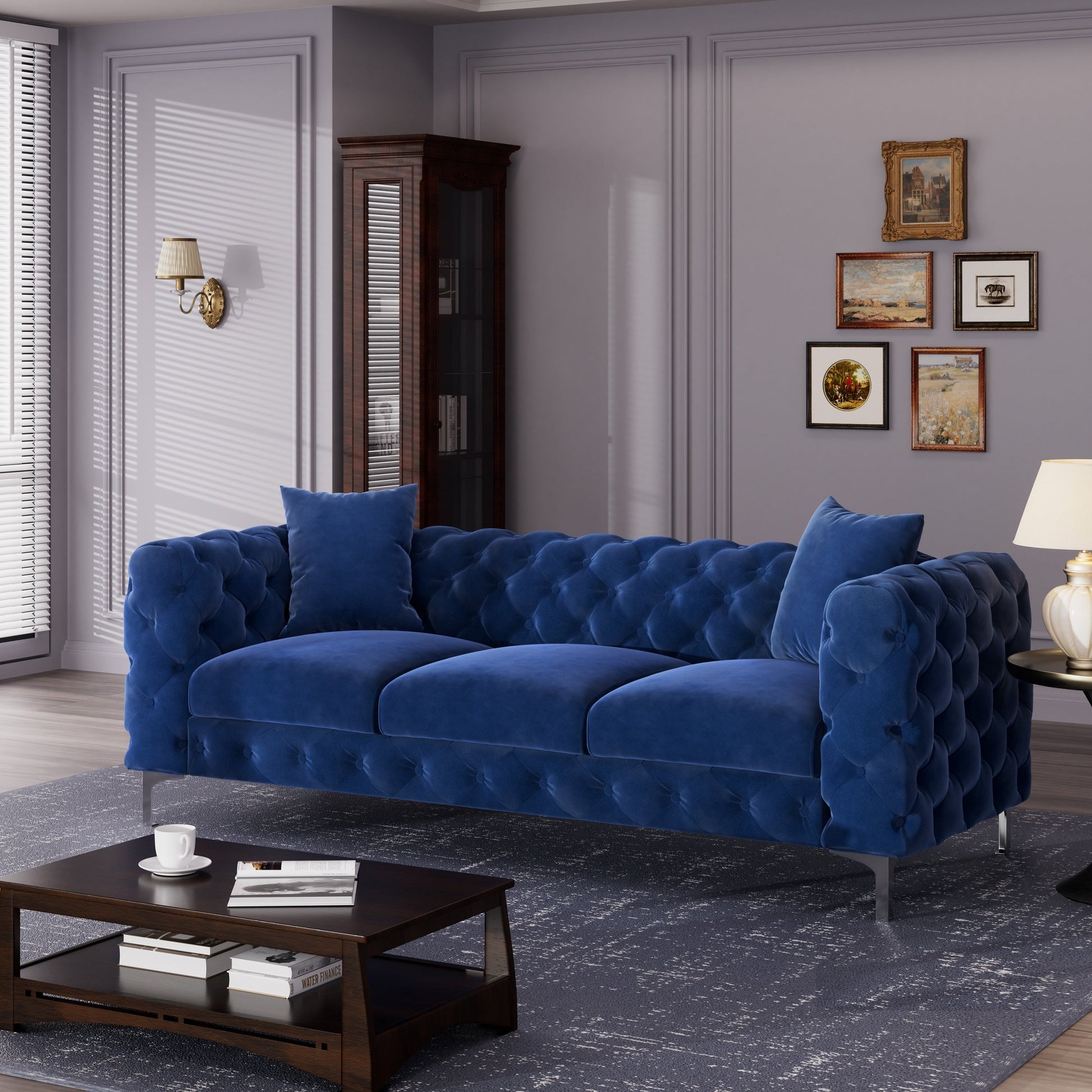 Indulge in the sophistication and luxury of this Modern Button Tufted Sofa. Inspired by 1930s British design, this sofa boasts a regal yet resilient appeal with its soft upholstery, overstuffed construction, and high resilience foam. The deep button tufting and iron legs add a touch of glamour to this eye-catching piece, making it a stunning addition to any space.
