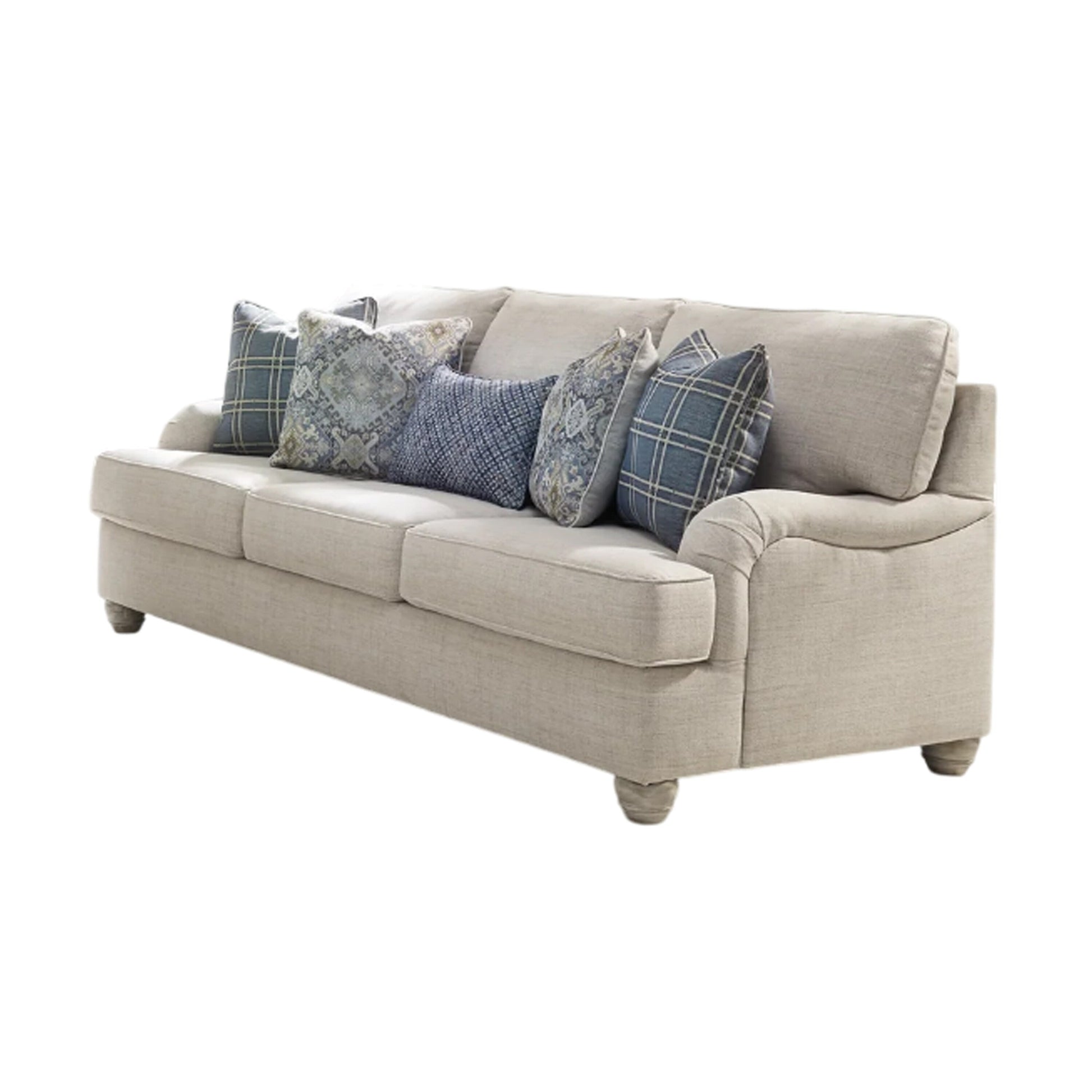 Enhance your living space with this inviting sofa, designed for ultimate comfort. Built with a durable corner-blocked frame, it features soft polyester upholstery in a beige finish. Reversible seat cushions provide versatility, while high-resiliency foam ensures long-lasting support. It is supported by turned feet with a faux wood finish, granting stability. Check out our Moyi collection for more.