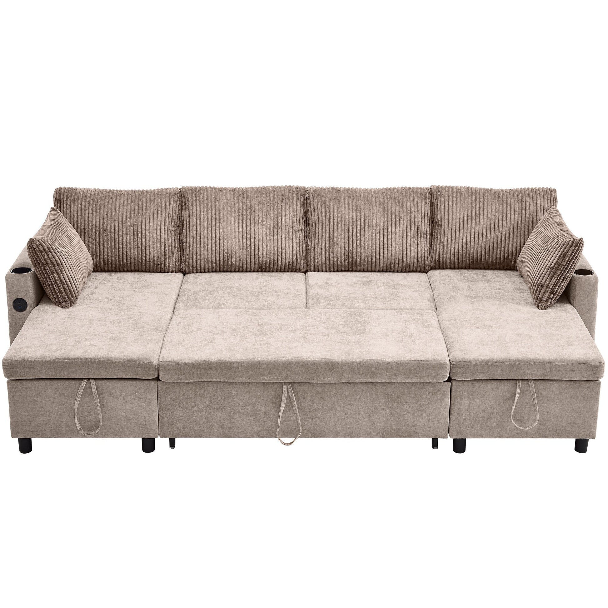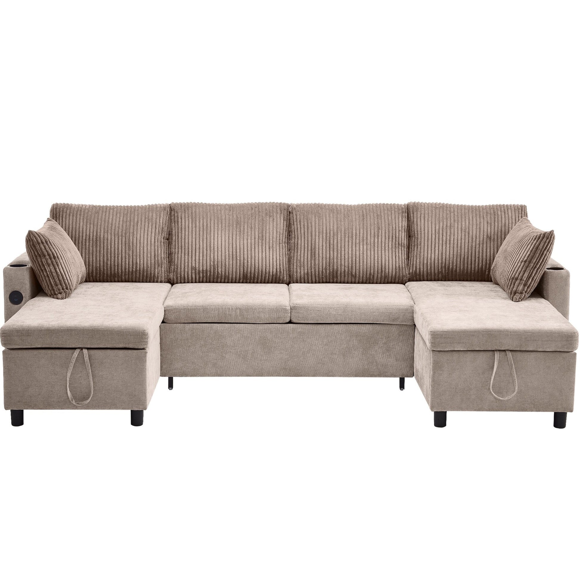 This multifunctional sectional sofa easily transforms into a pull-out bed or U-shaped seating. With built-in USB ports, cup holders, and double chaise storage, it blends comfort, convenience, and space-saving designâideal for hosting guests or everyday lounging.