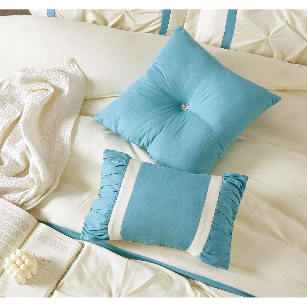 Turn your bedroom into a slumber retreat with this beautiful and elegant comforter set featuring white handcrafted pintucking accented with grey. The perfect color combination paired with embellishment makes a room refresh easy. Constructed of 100% polyester fabric and filling, this bed set comes with 1 comforter, 2 shams, 1 bed skirt, and 3 decorative pillows that flaunt excellent workmanship and quality. The complete bed set built to last, this bedding set is made with strict quality control standards and comes with everything you need for a complete bedroom makeover. Made with high strength polyester, this beautiful bedding set can be machine washed and dried on a low tumble setting for easy care.