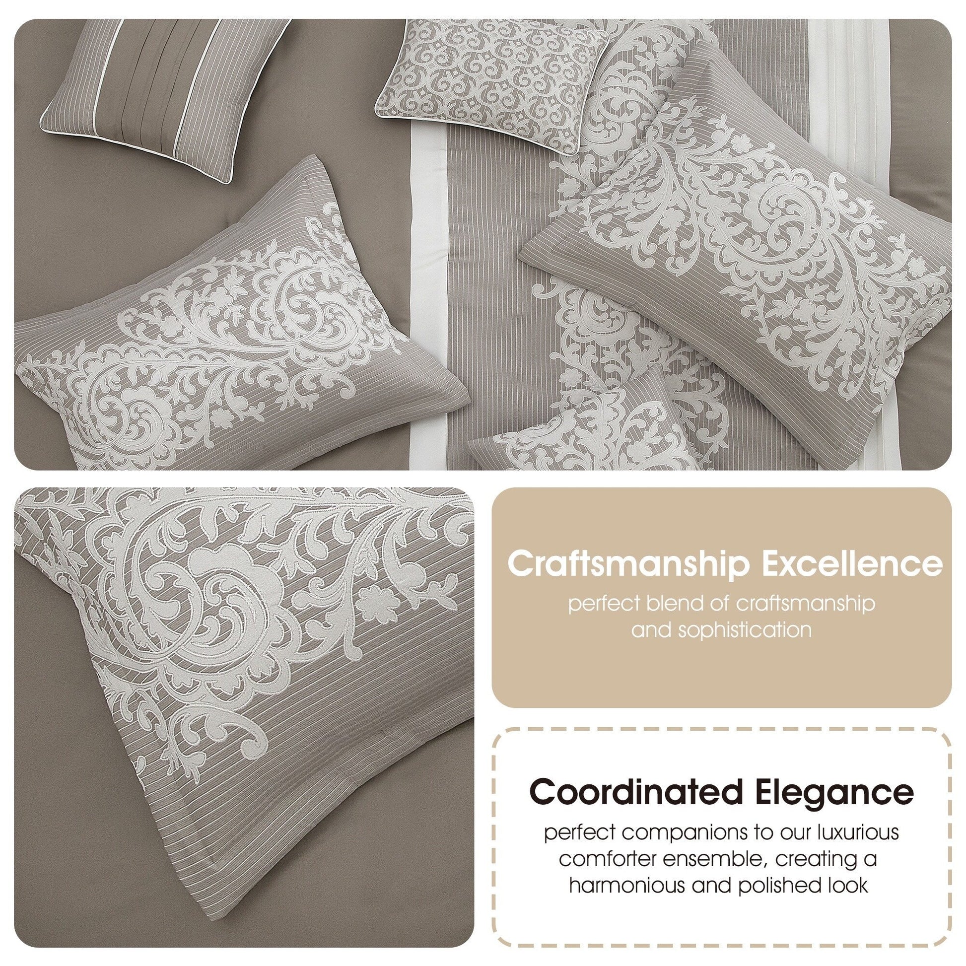 Transform your bedroom into a luxurious retreat with the Nanshing Salem Damask Jacquard 7-Piece Comforter Set. The beautiful engineered design of the comforter and shams adds dimension to the lavish look, while the high-quality 100% polyester construction ensures durability and long-lasting use. This complete bedding set includes a comforter, two shams, a bed skirt, and three decorative pillows that boast excellent workmanship and style. With strict quality control standards, this bedding set is guaranteed to provide you with everything you need for a complete bedroom makeover. Machine washable on a low tumble setting for easy care.