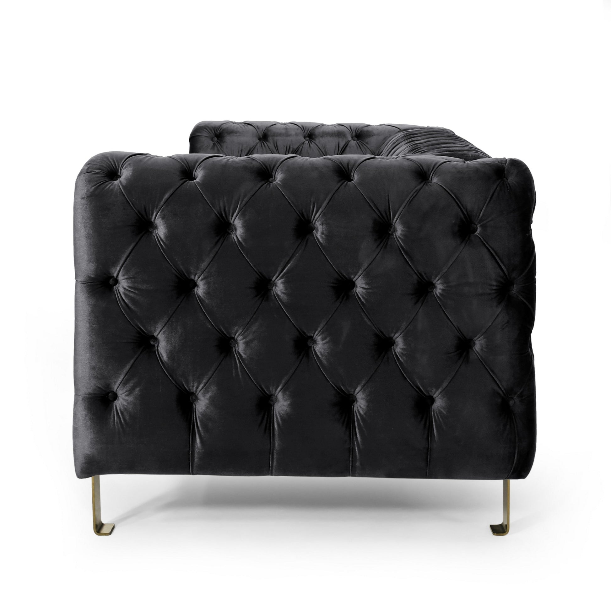Make a statement in your contemporary living space with our glam-style-inspired Nua sofa. Deep button tufting and diamond stitching highlight the Chesterfield design with tuxedo arms. The gold iron legs create a crispy contrast with stain-resistant black polyester velvet upholstery. Check out our Nua collection for more color options.?