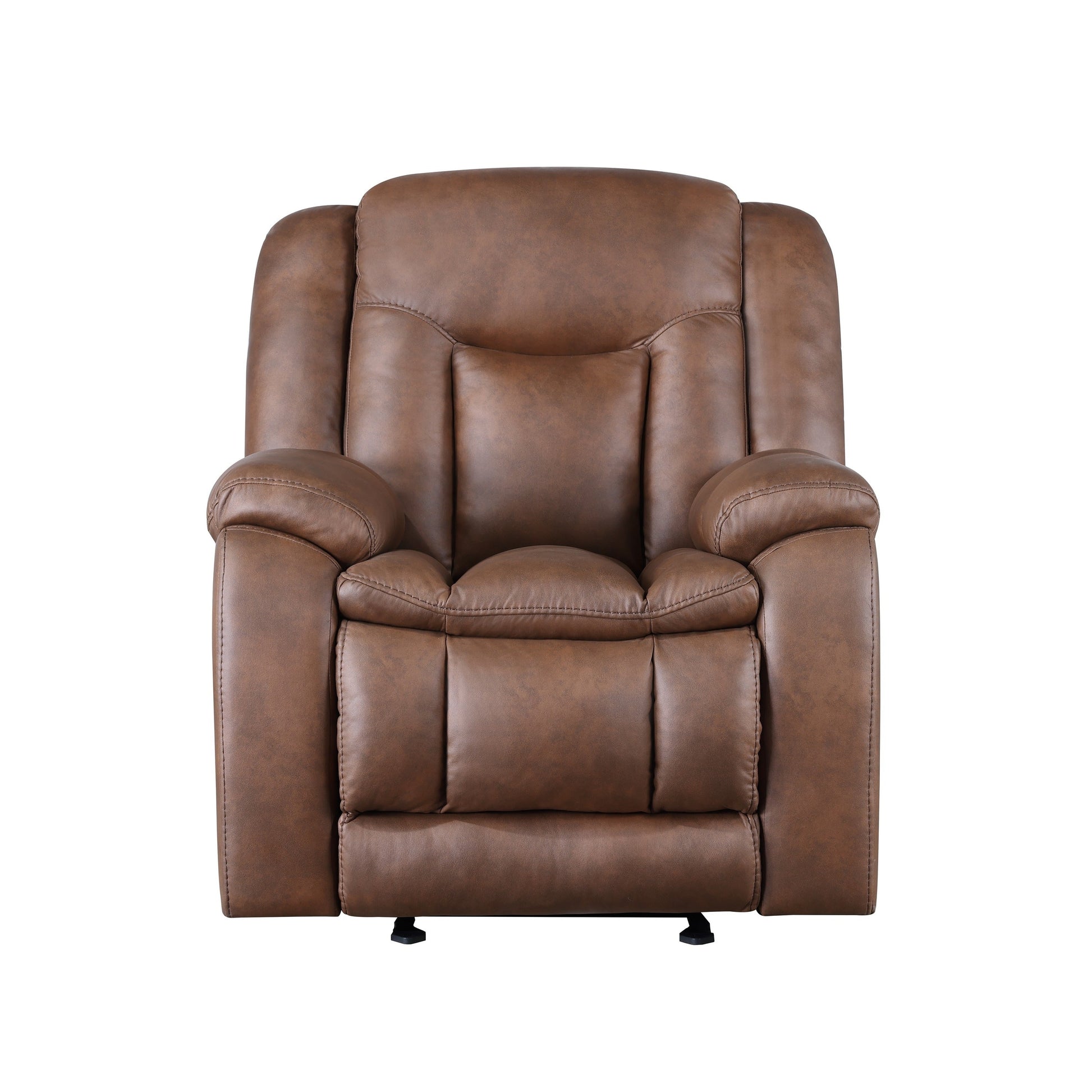 This power glider recliner chair combines superior comfort with modern convenience. Upholstered in saddle brown leather-look faux leather, its plush, contoured cushions, and double-stitch detailing ensure durability. With a power-operated reclining footrest and smooth gliding, its thoughtfully integrated USB-C ports in the power switch add convenience. Check out our Olaf collection for more.
