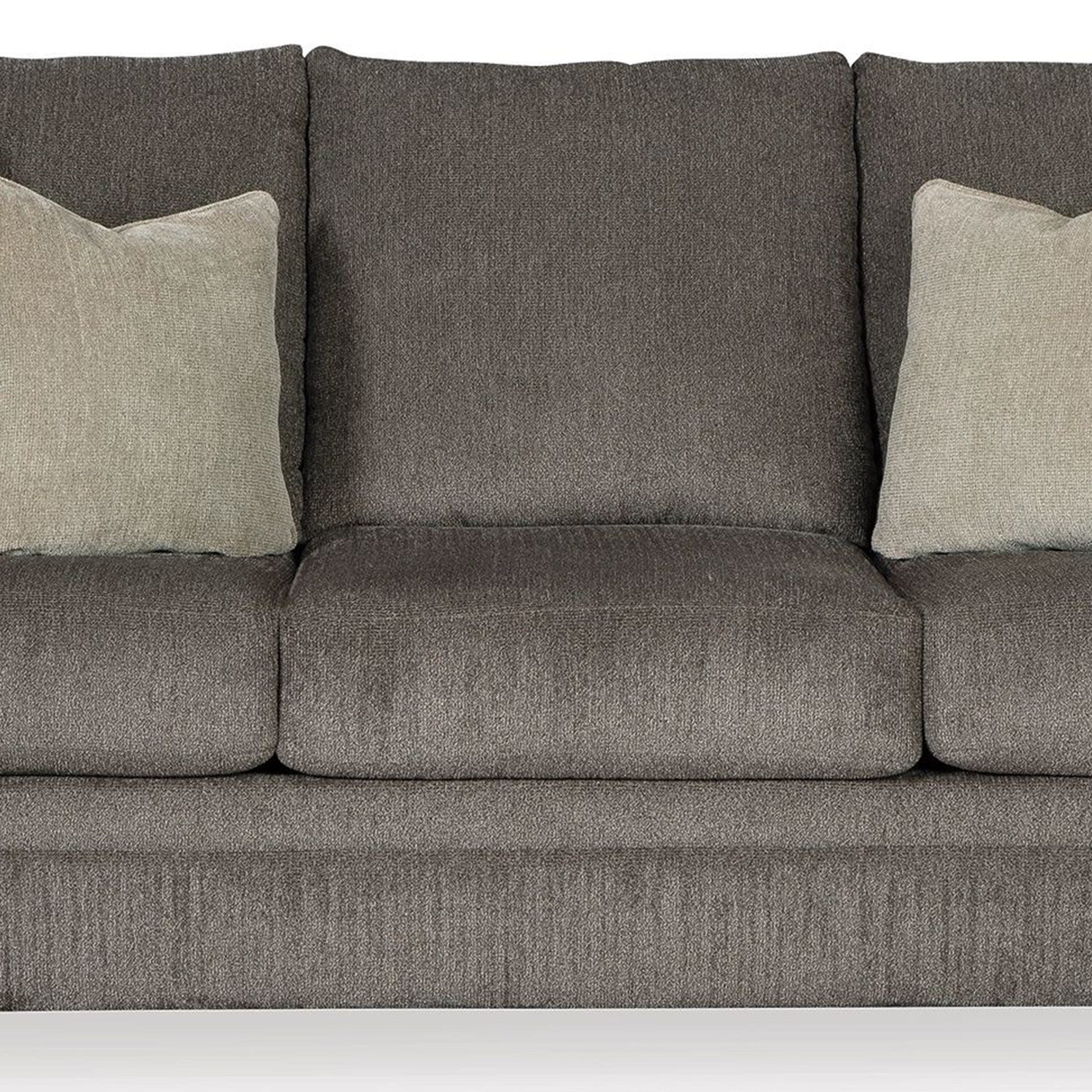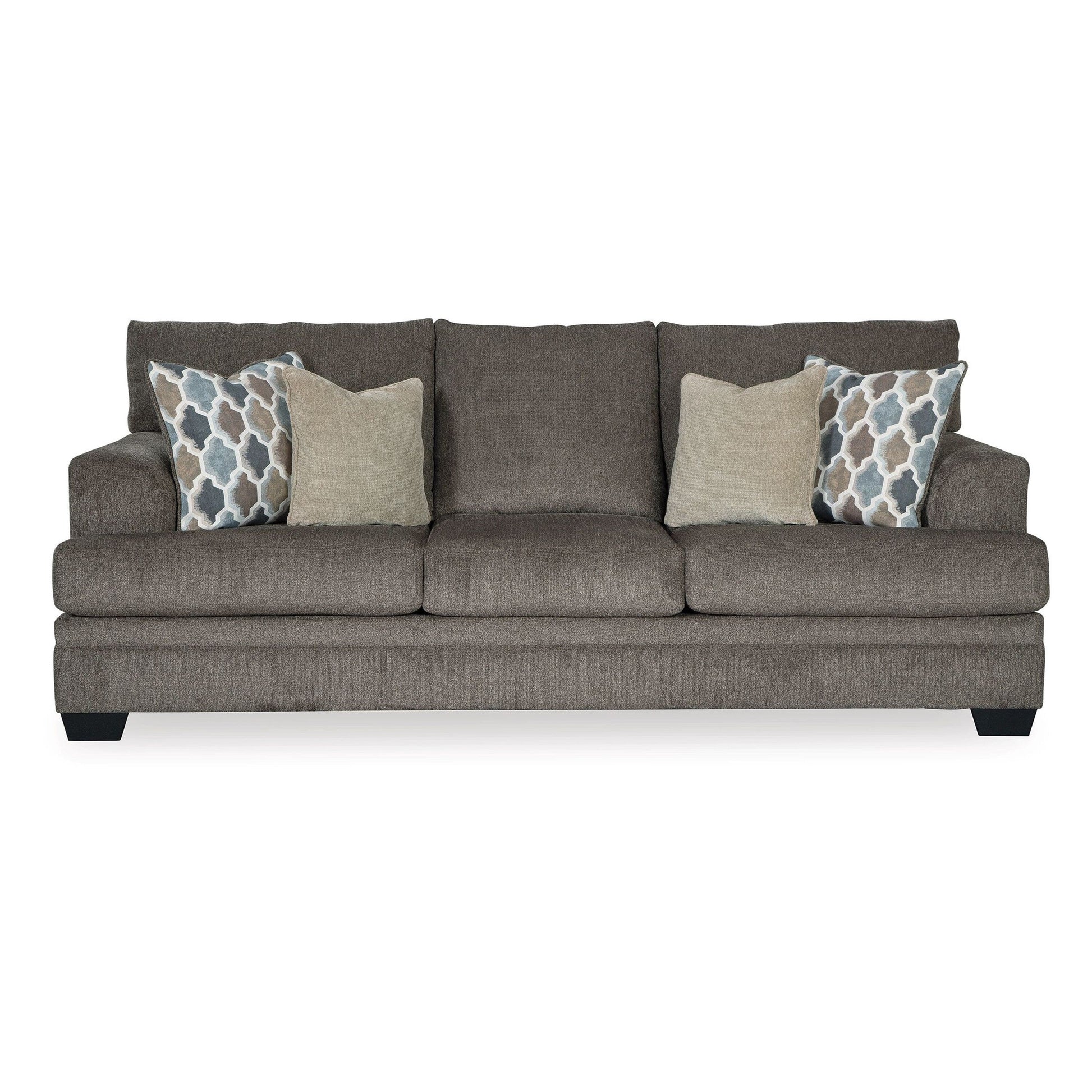 This sofa brings a perfect blend of style and comfort to your living space. Its sleek slate gray chenille upholstery adds a refined touch, while the plush cushions provide superior relaxation. Plus, the decorative pillows in blue, brown, and tan beautifully complement the neutral fabric, creating a sophisticated yet cozy ambiance. Check out our Orsten collection for more options.