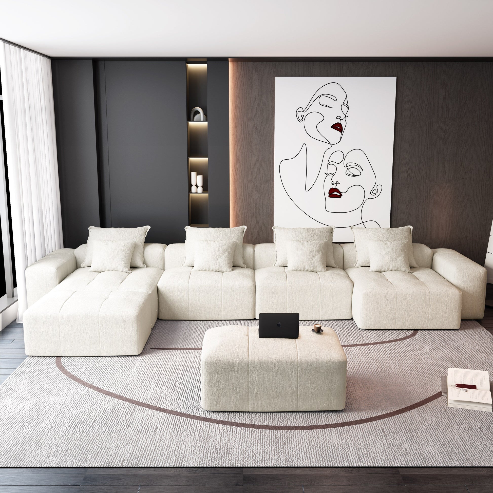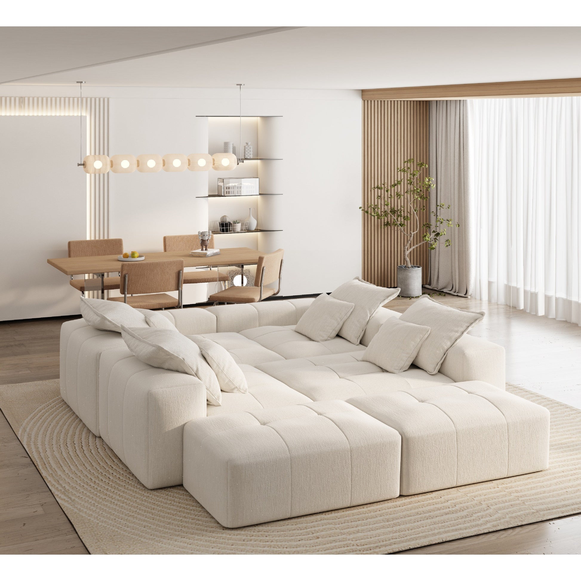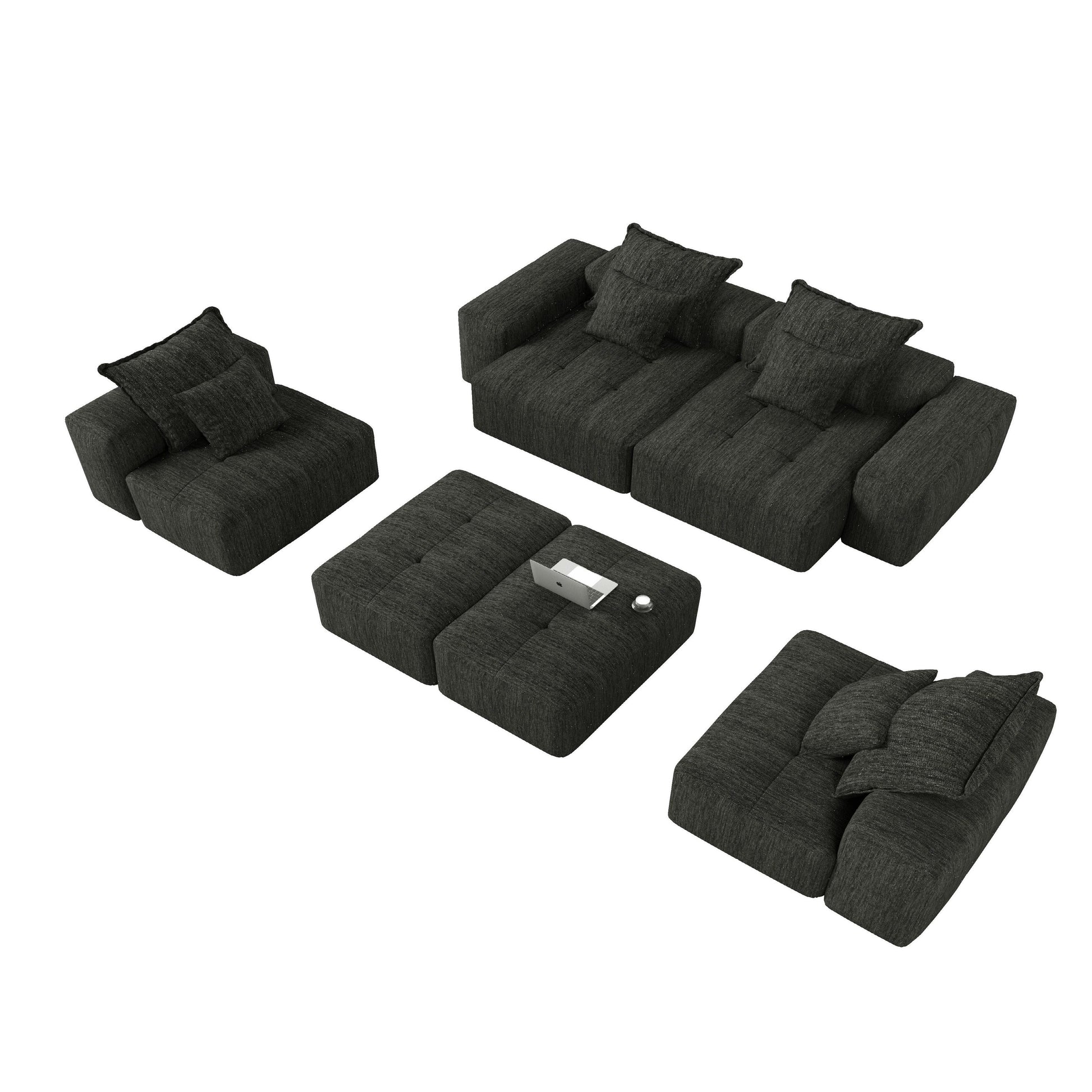 Elevate your living space with this oversized modular sectional, designed for flexibility and comfort. Featuring shimmering chenille fabric, quilted cushions, and eight included pillows, it offers multiple configurations to suit your room. No assembly requiredâjust unbox and enjoy its cozy, modern charm.