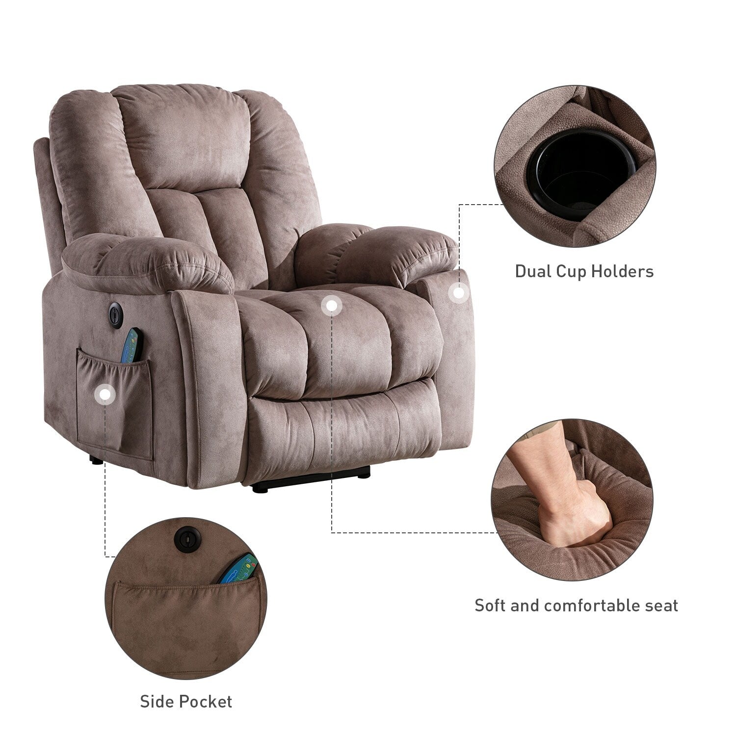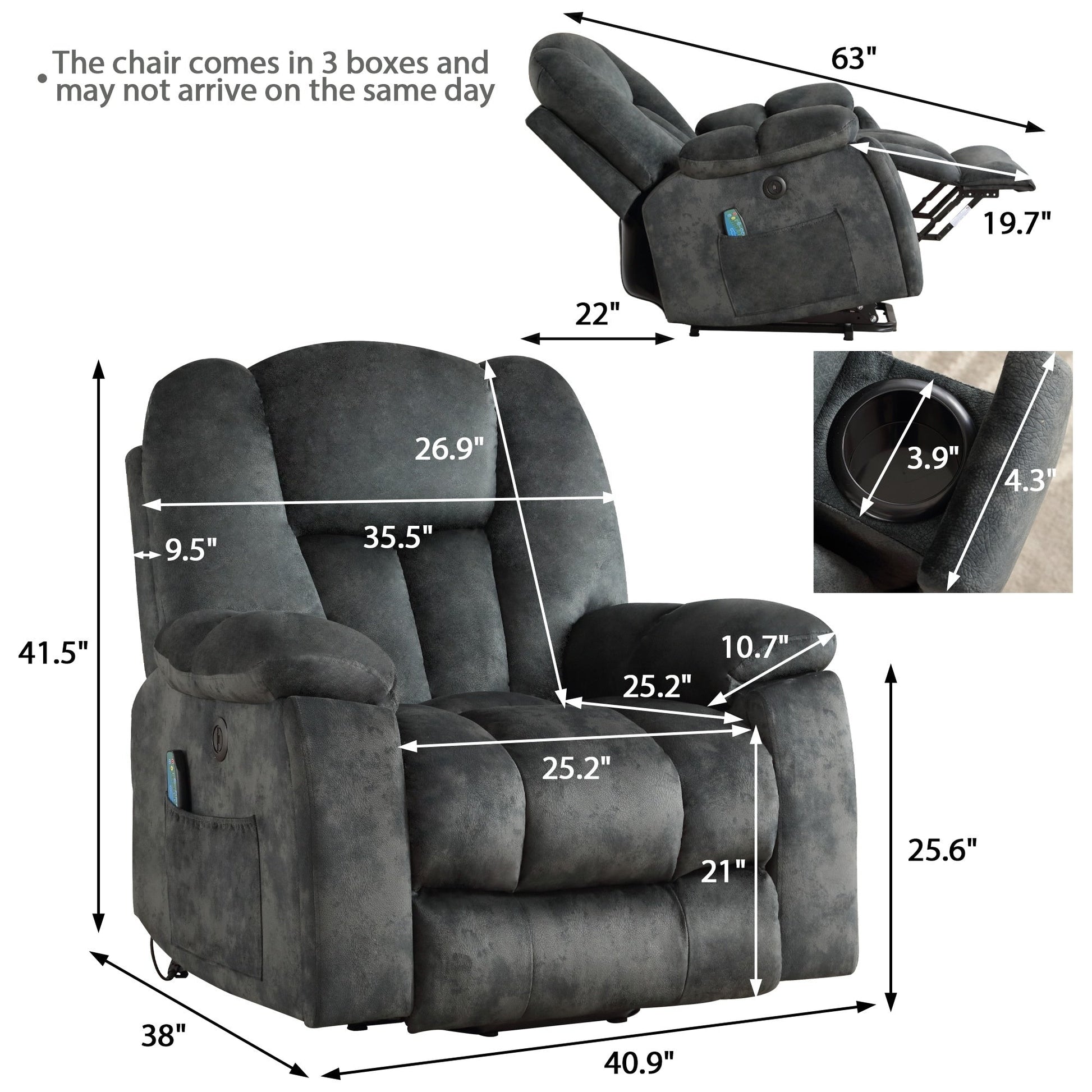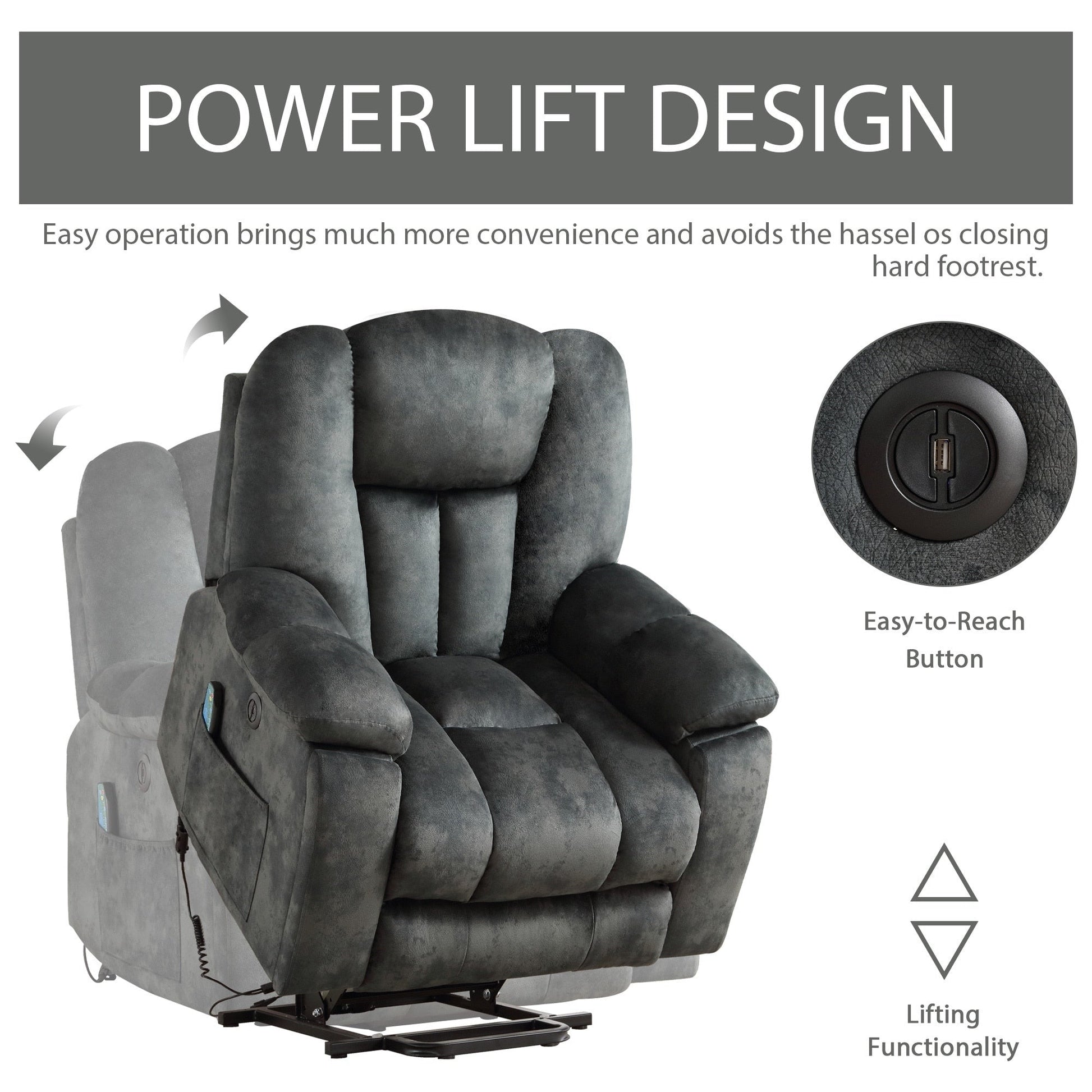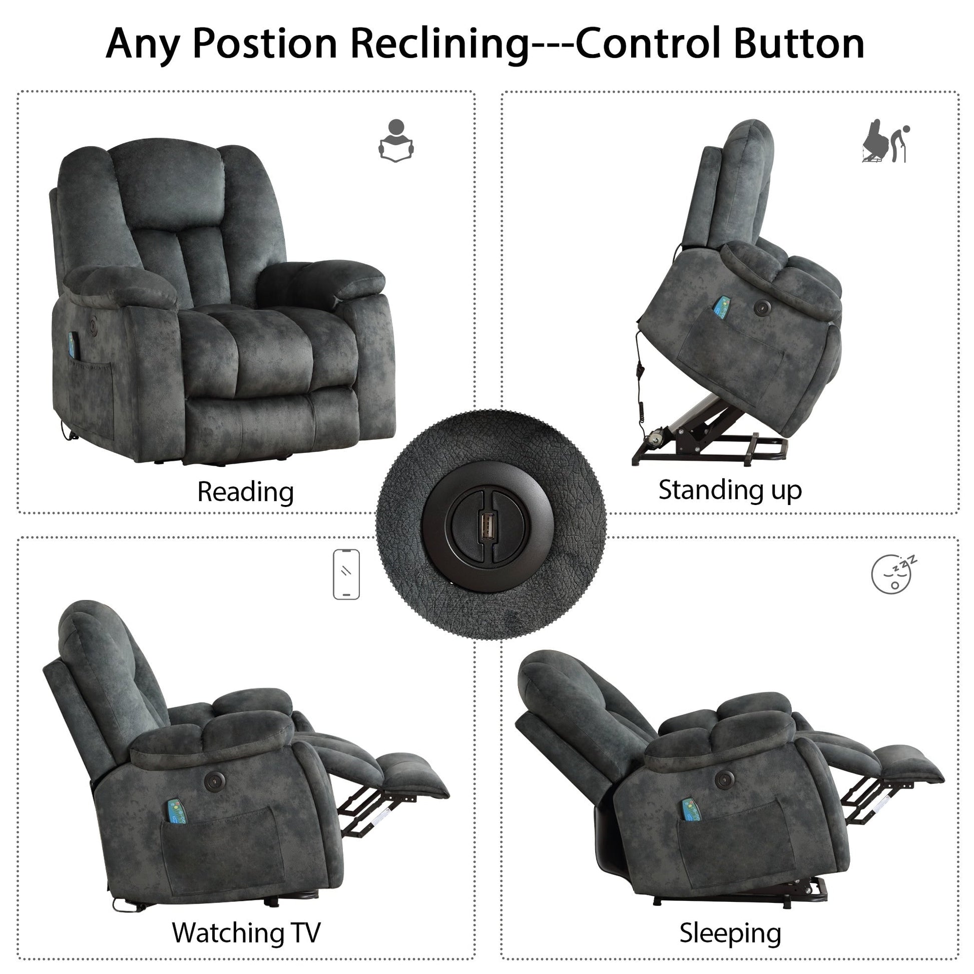 Experience ultimate comfort and relaxation with our Oversized Power Assist Lift Recliner chair with Massage. This chair offers 10 different massage modes, including lumbar heating, to relieve fatigue and make every day feel like a spa day. With a sturdy steel frame and anti-back-tipping design, it smoothly adjusts to any customized position for the ultimate lounging experience. The convenient USB port and side pockets make it easy to charge your phone and store magazines or books. Upholstered in soft and breathable velvet, this chair is perfect for seniors and patients in recovery.