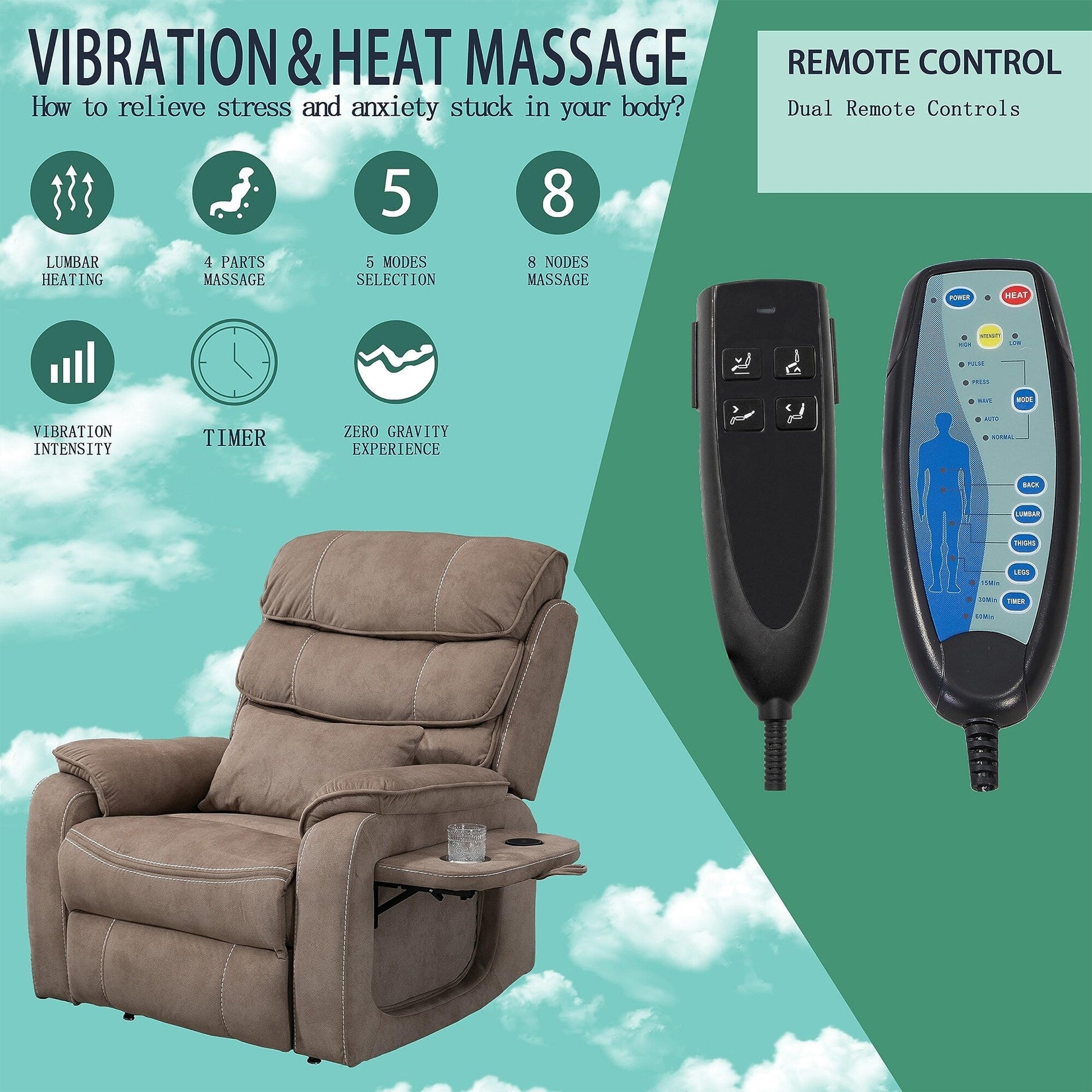 【Massage Heating】- 8 massage units and 5 different modes meet your demand for various massages (PLUSE, PRESS, WAVE, AUTO, NORMAL). This massage chair also comes with 4 areas of massage (BACK, LUMBAR, THIGH, LEG), 3 timers(15, 30, or 60 minutes), 2 massage intensities (HIGH, LOW), and an additional WAIST HEATING function which is for optimal comfort.