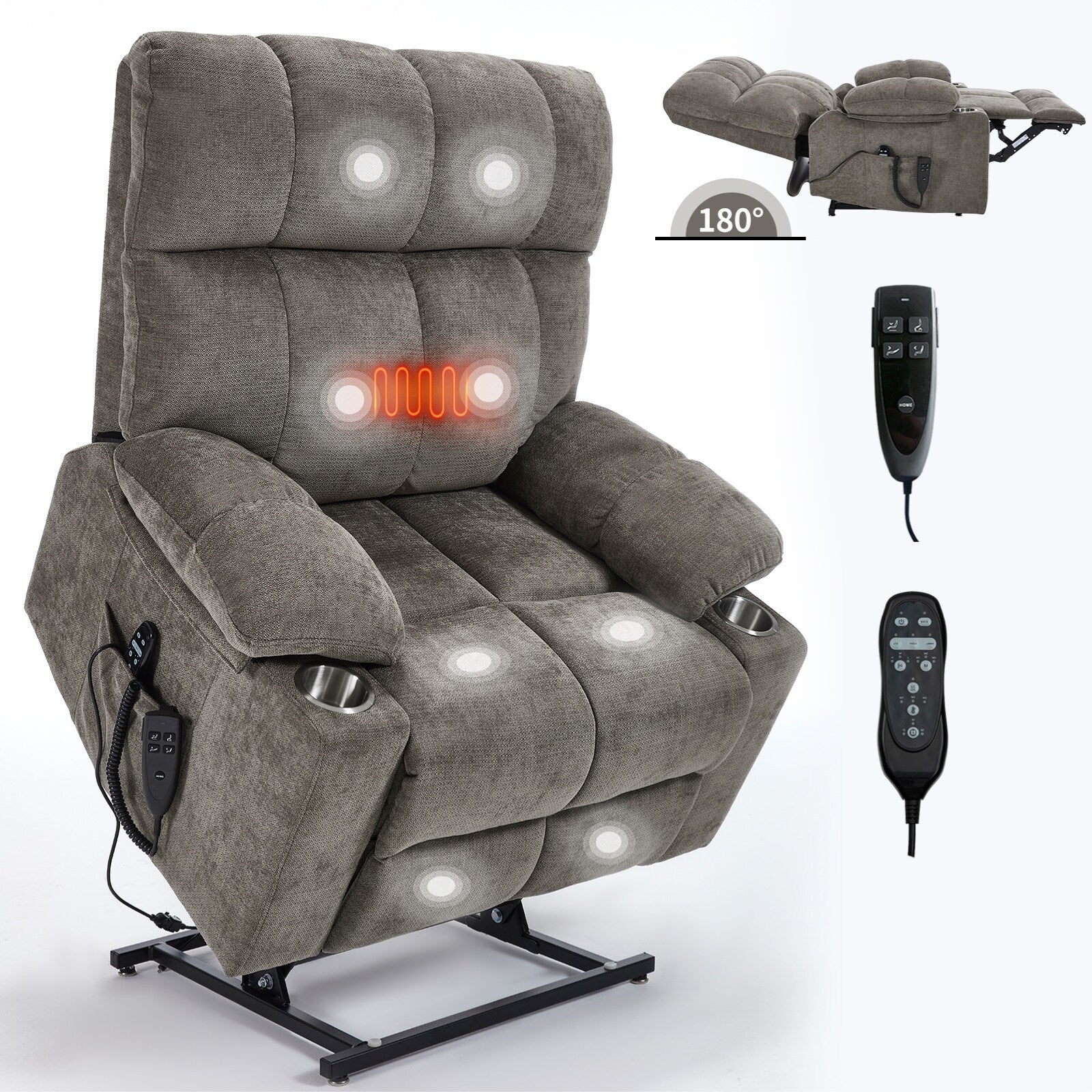 Oversized Power Lift Recliner Chair with Dual Motor, Massage & Lumbar Heat, Chenille Upholstery, Dual Cup Holders & Side Pockets