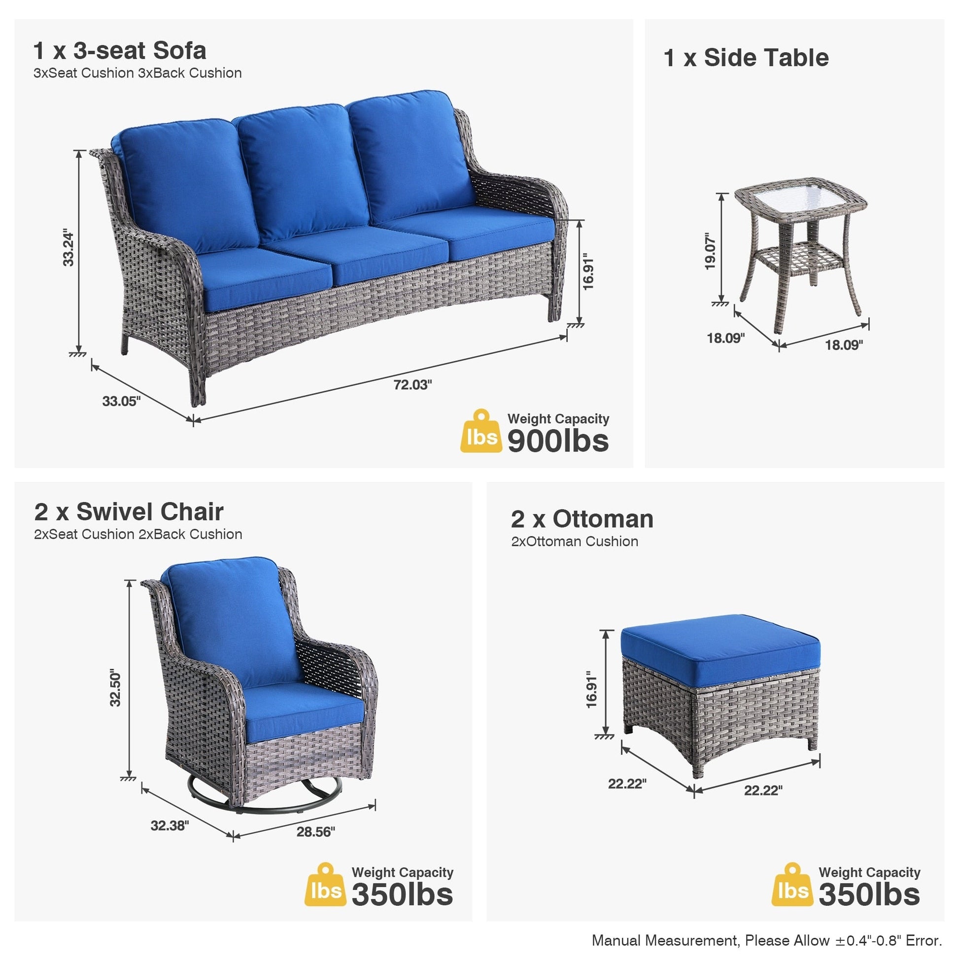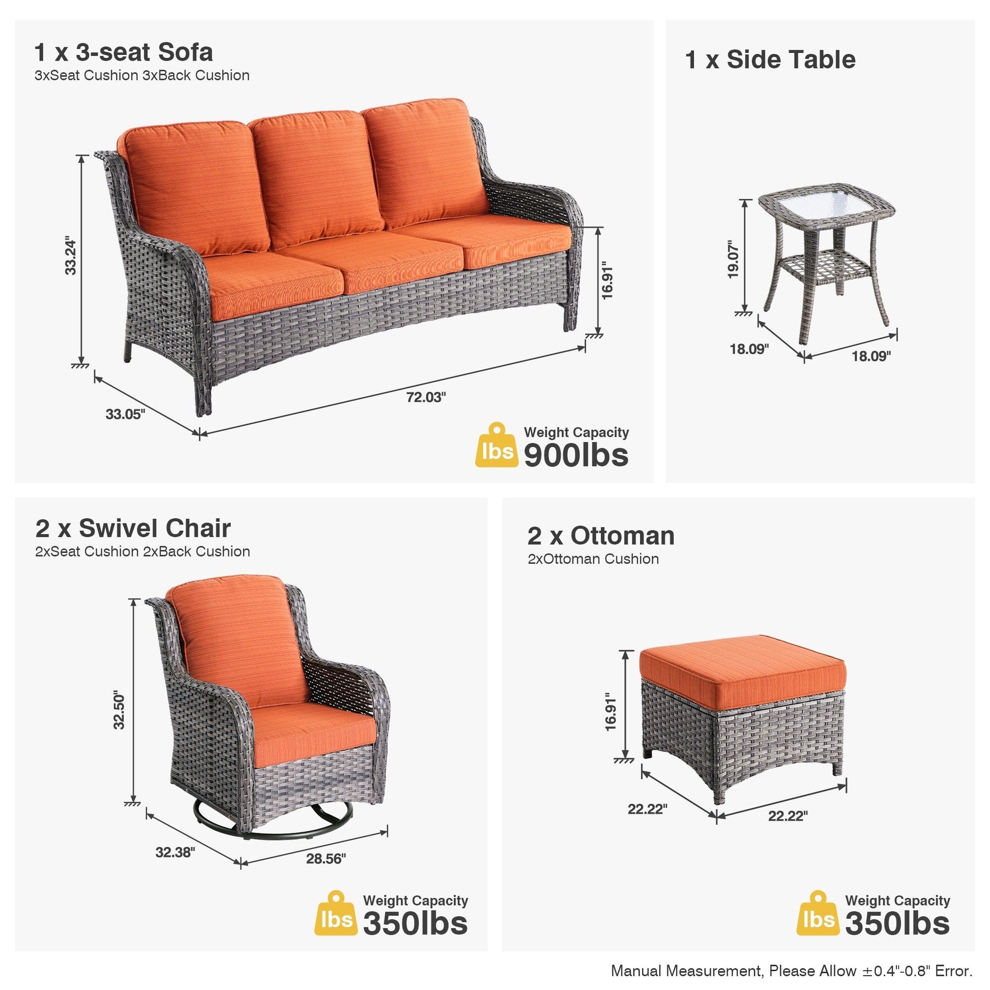 Includes 1 three-seat sofa, 2 swivel chairs, 2 ottomans, and a side table for ample seating and convenience