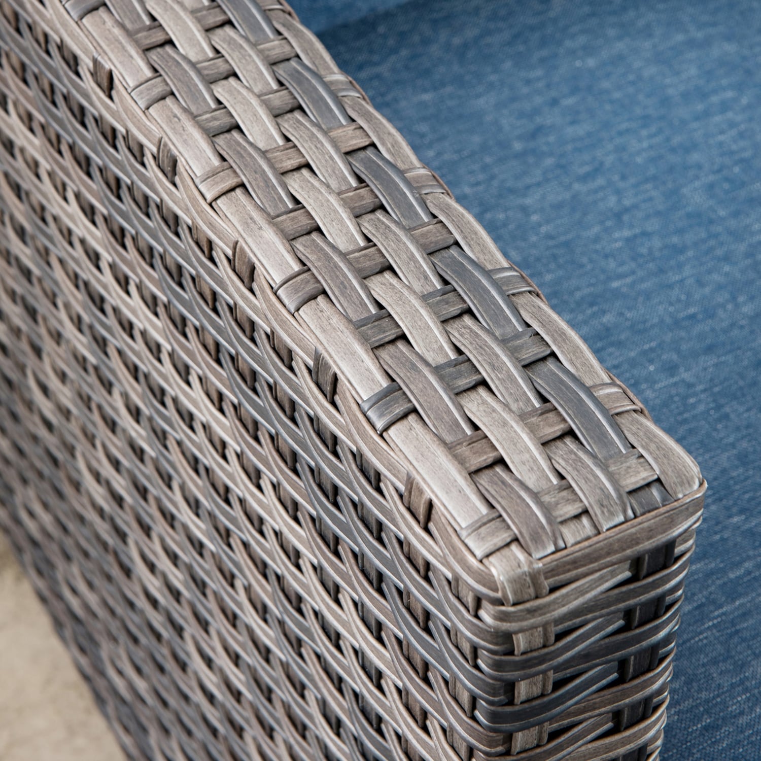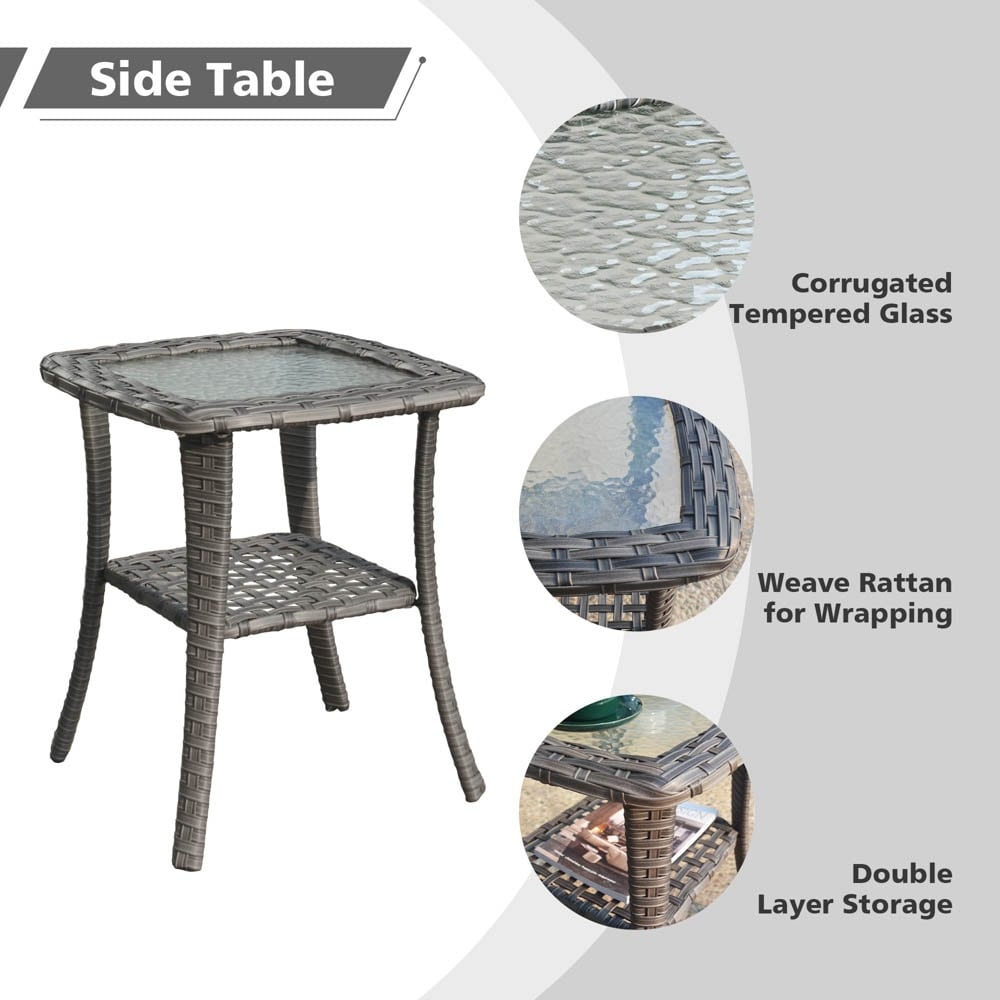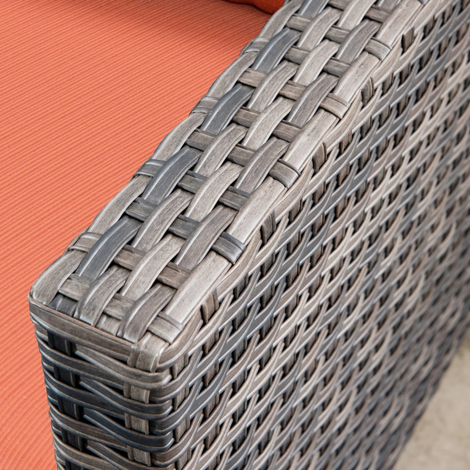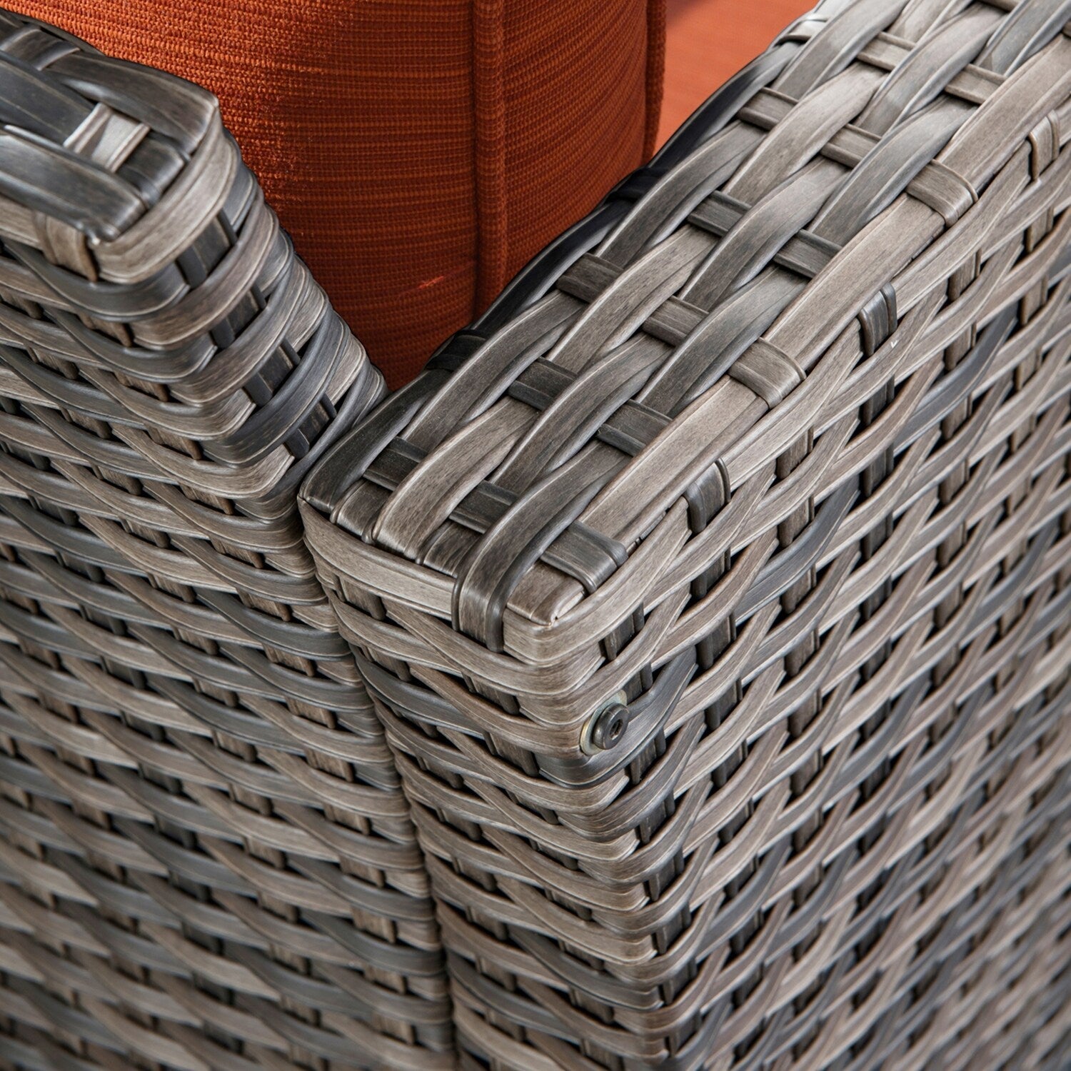 Create a cozy outdoor oasis with the OVIOS Wicker Sectional Sofa and Swivel Rocking Chair 6-piece Set. This set is designed for comfort and durability with powder-coated metal frames and grey PE rattan that can withstand any weather condition. The high-density sponge cushions and UV and water-resistant fabric cushions offer ultimate relaxation while the 2 rocking arm chairs with 360-degree swivel bases, 3-seat sofa, 2 ottomans, and side table with tempered glass top and open shelf provide ample seating for up to 5 guests. Choose from red, blue, beige, or grey cushions to match your style.
