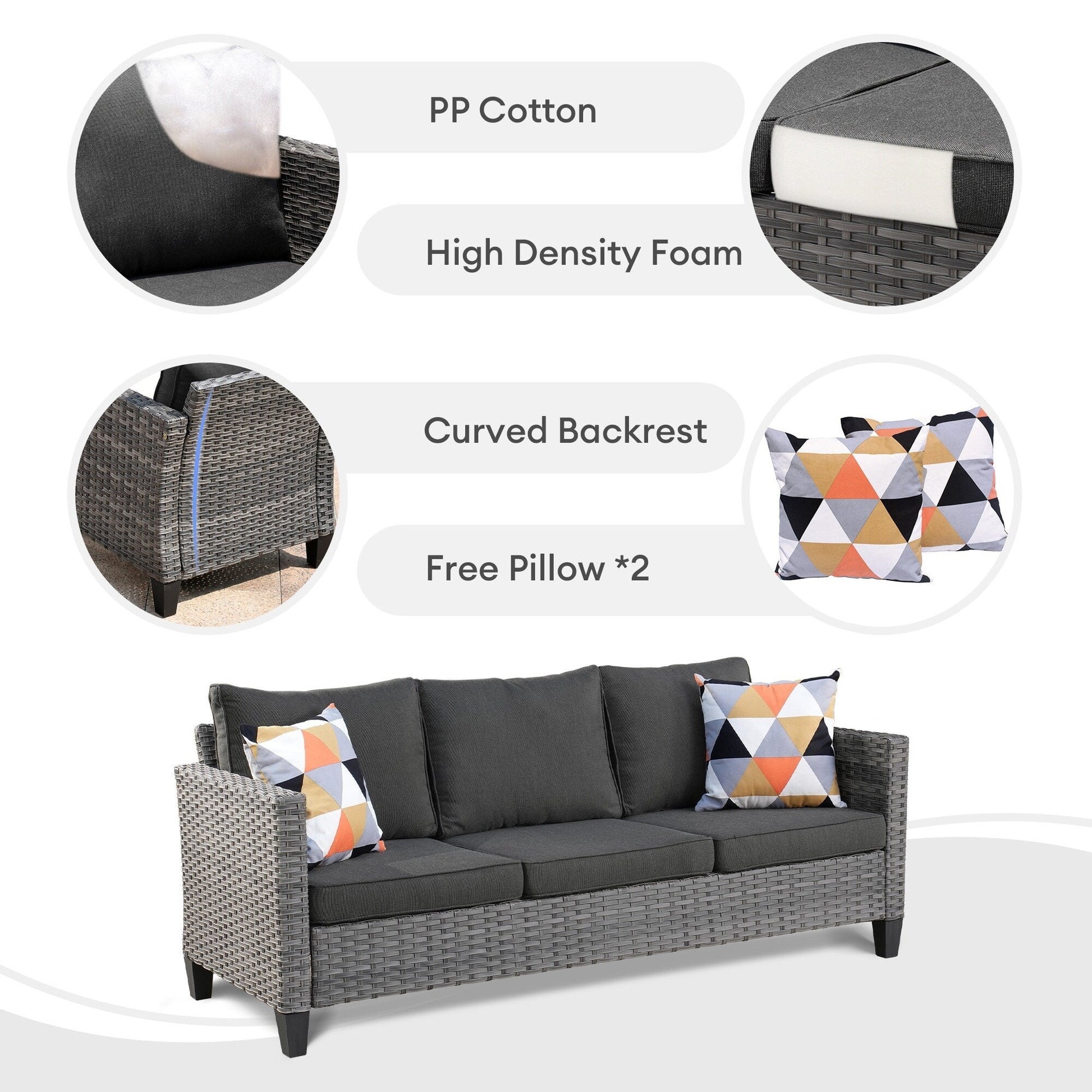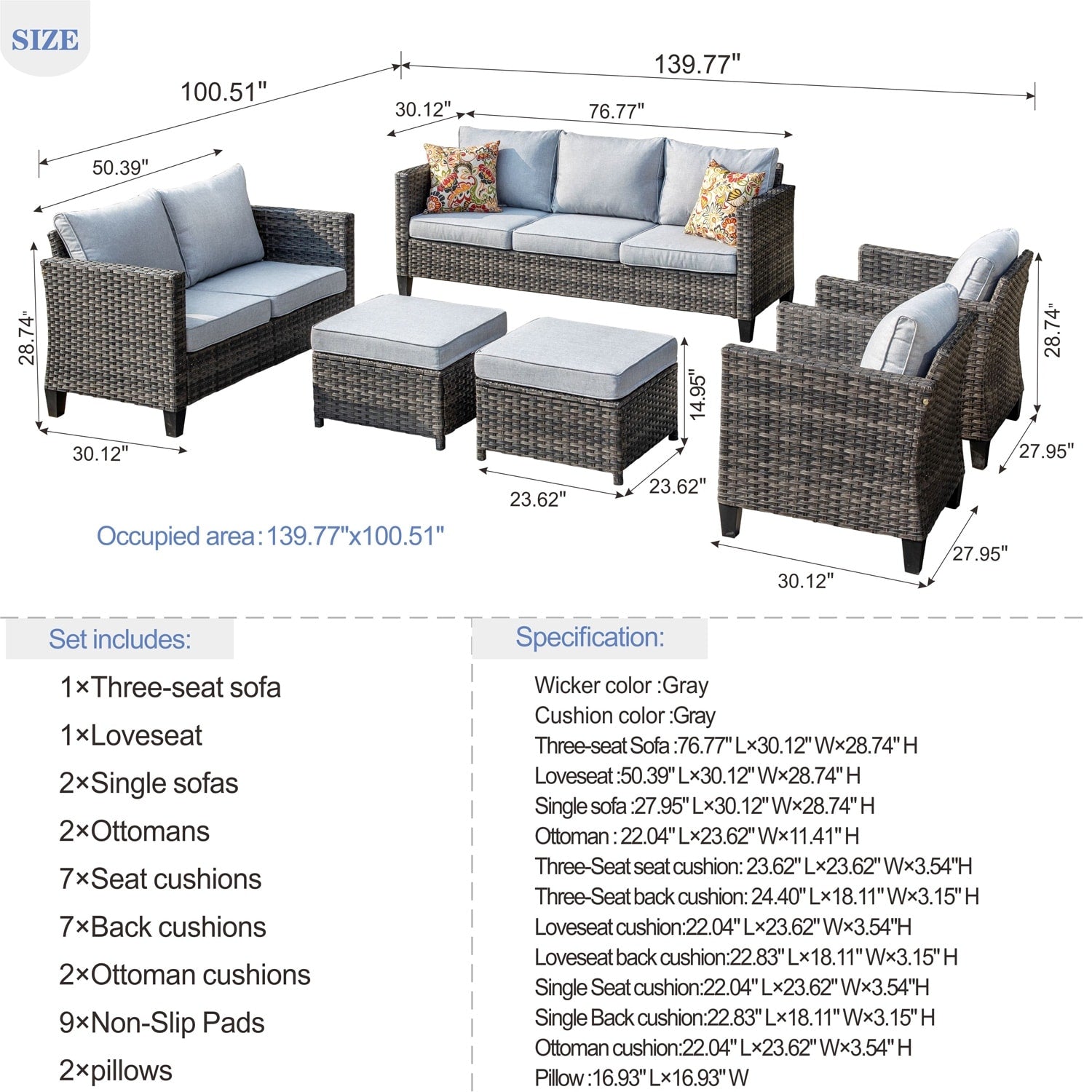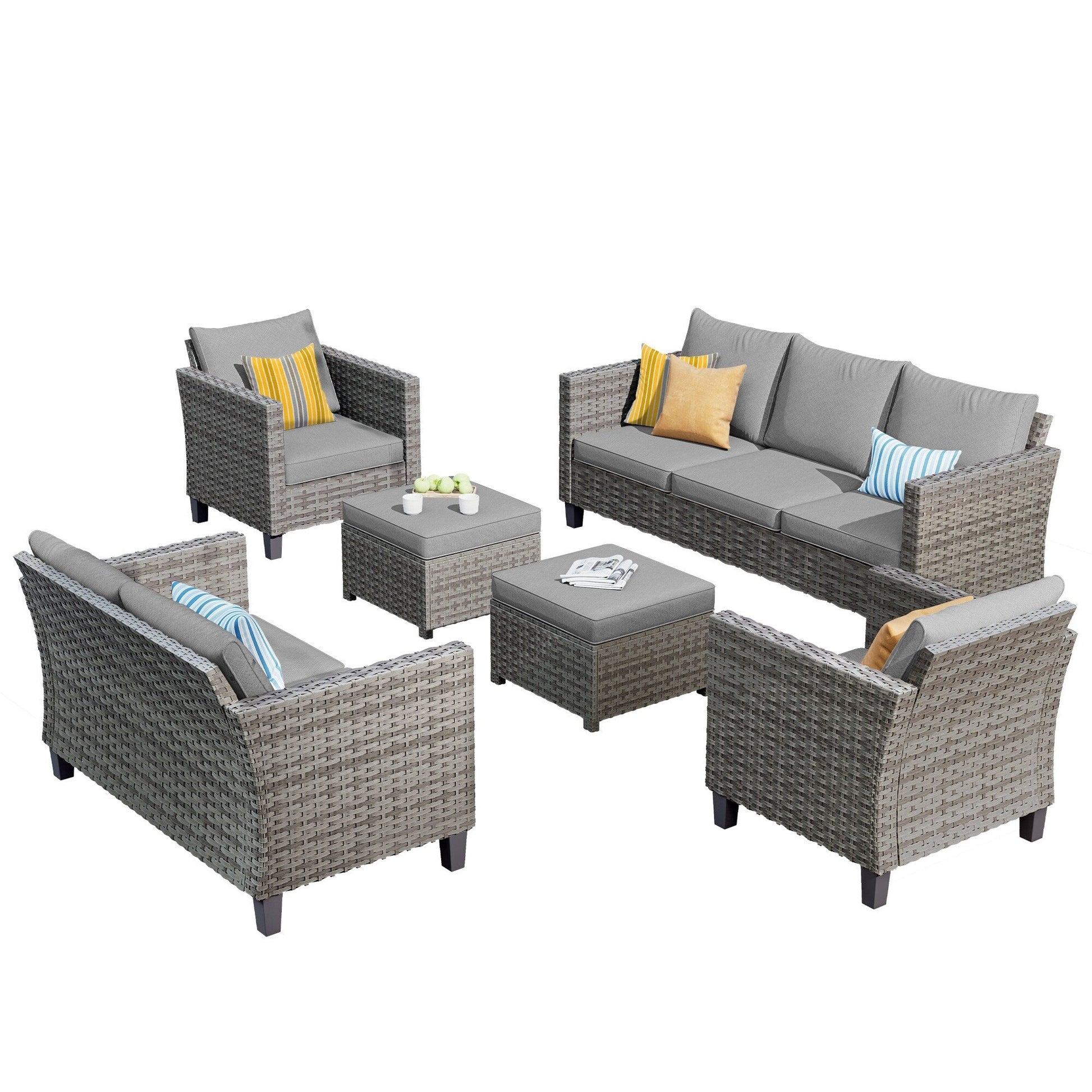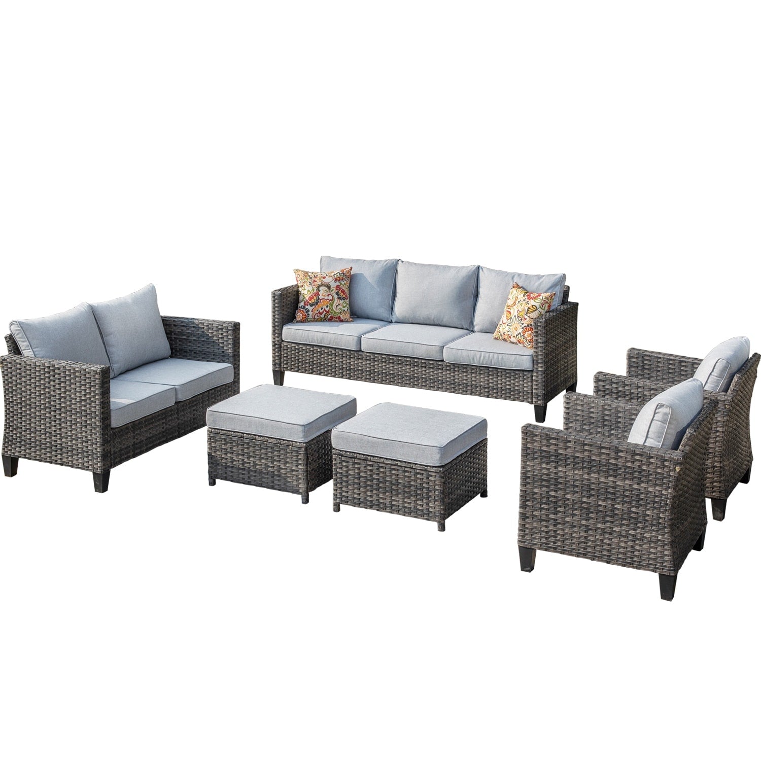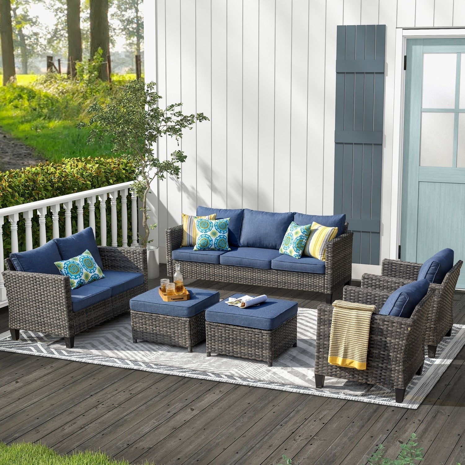 Elevate your outdoor living space with the OVIOS 6-piece Patio Wicker Furniture Loveseat Conversation Set. This stunning ensemble includes two sizes of loveseats, two chairs, and two matching ottomans, perfect for creating a relaxing oasis in your backyard. With handwoven wicker, high-density foam, and polyester construction, this set is both durable and stylish. Enjoy the comfort of spacious armrests and deep seating, with foam-cushioned upholstery that dries quickly and is environmentally friendly. Choose from four cushion color options to add the perfect finishing touch to your patio decor.