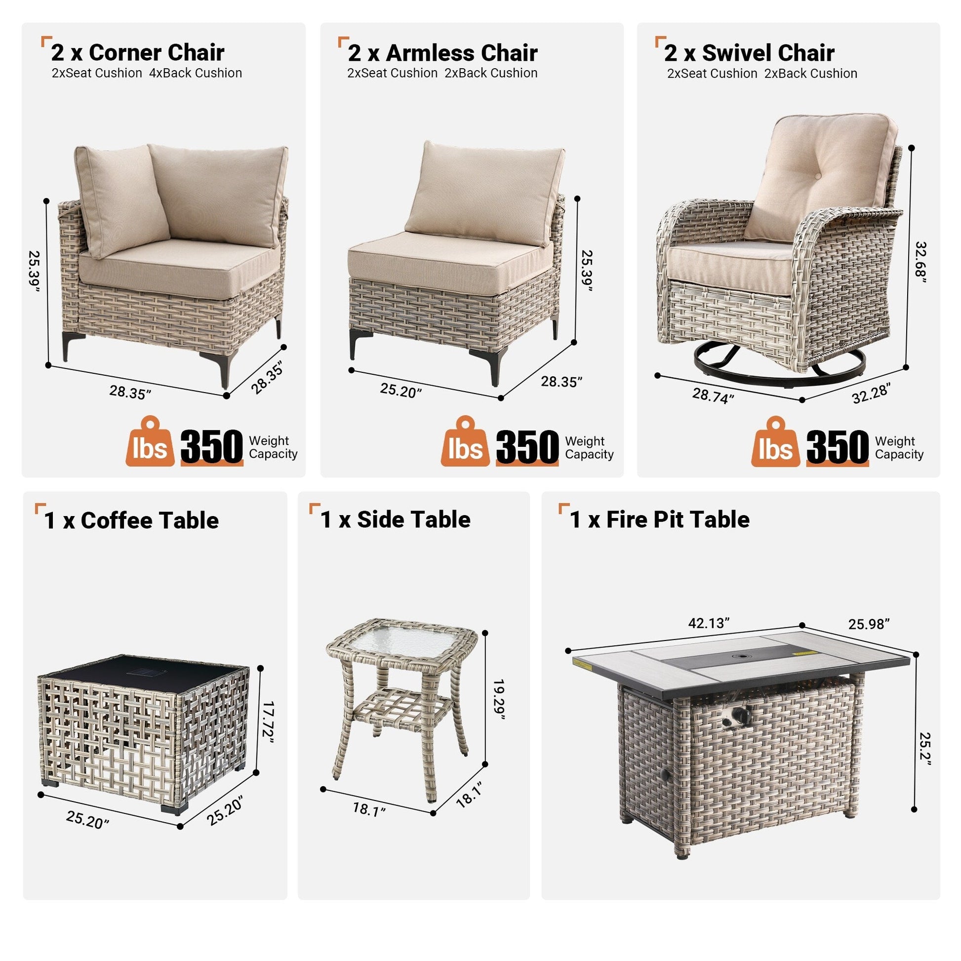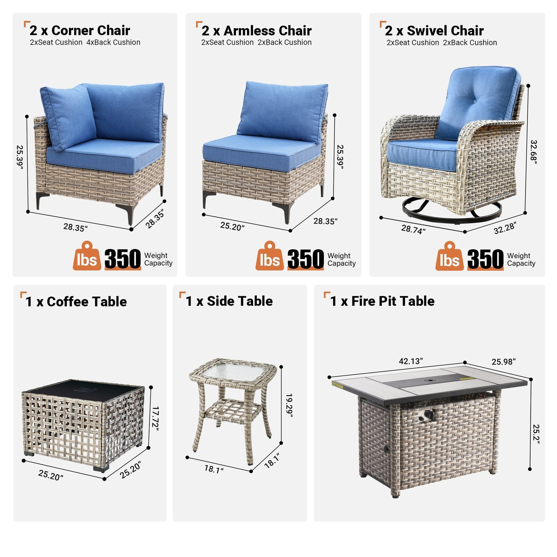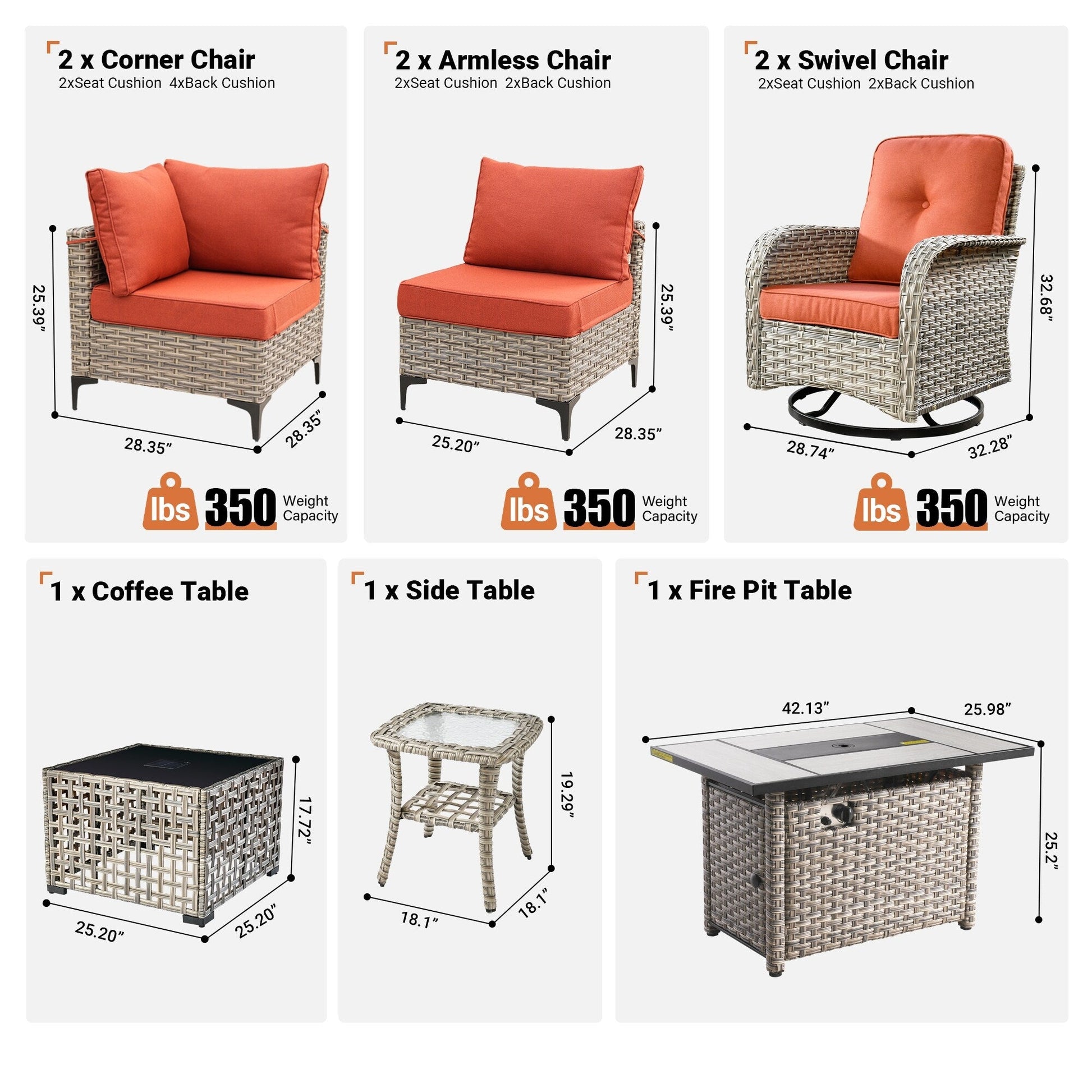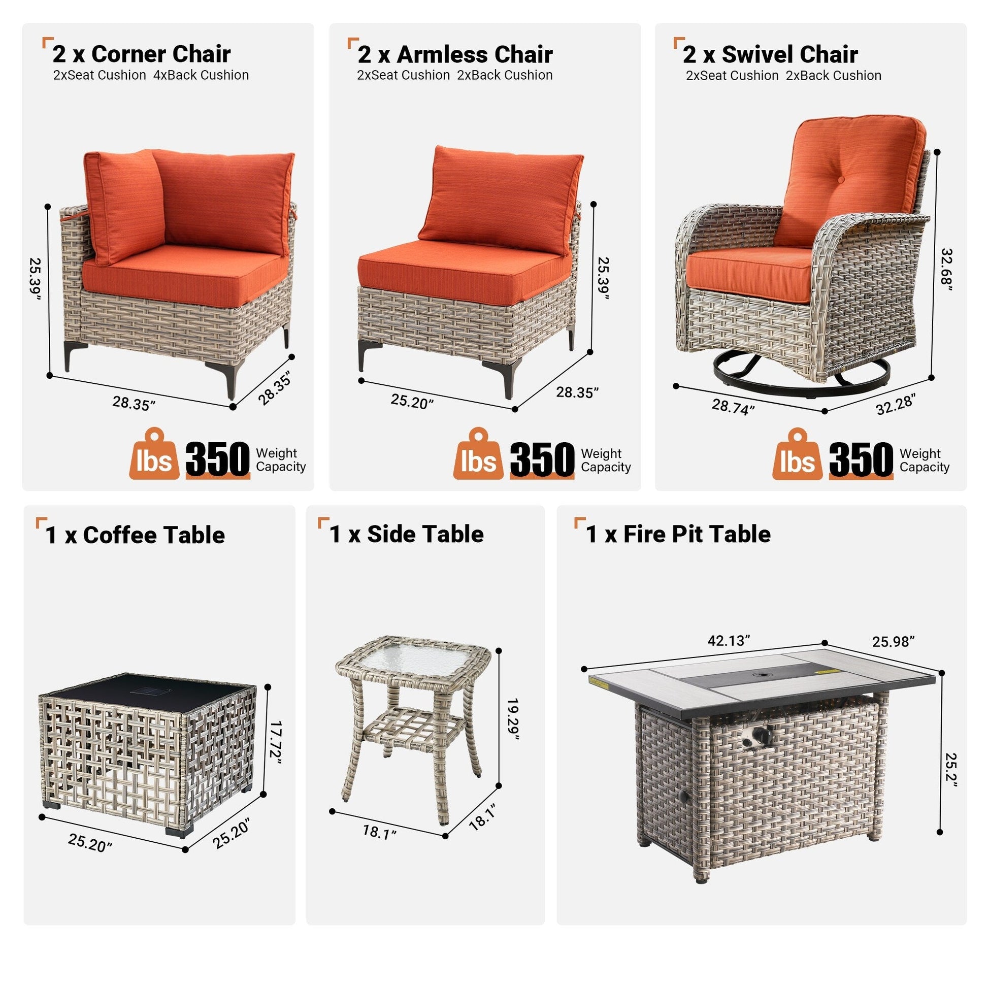 #Set Includes: 2 corner chairs, 2 single sofas, 2 rocking chairs, 1 coffee table, 1 side table, 1 rattan fire pit