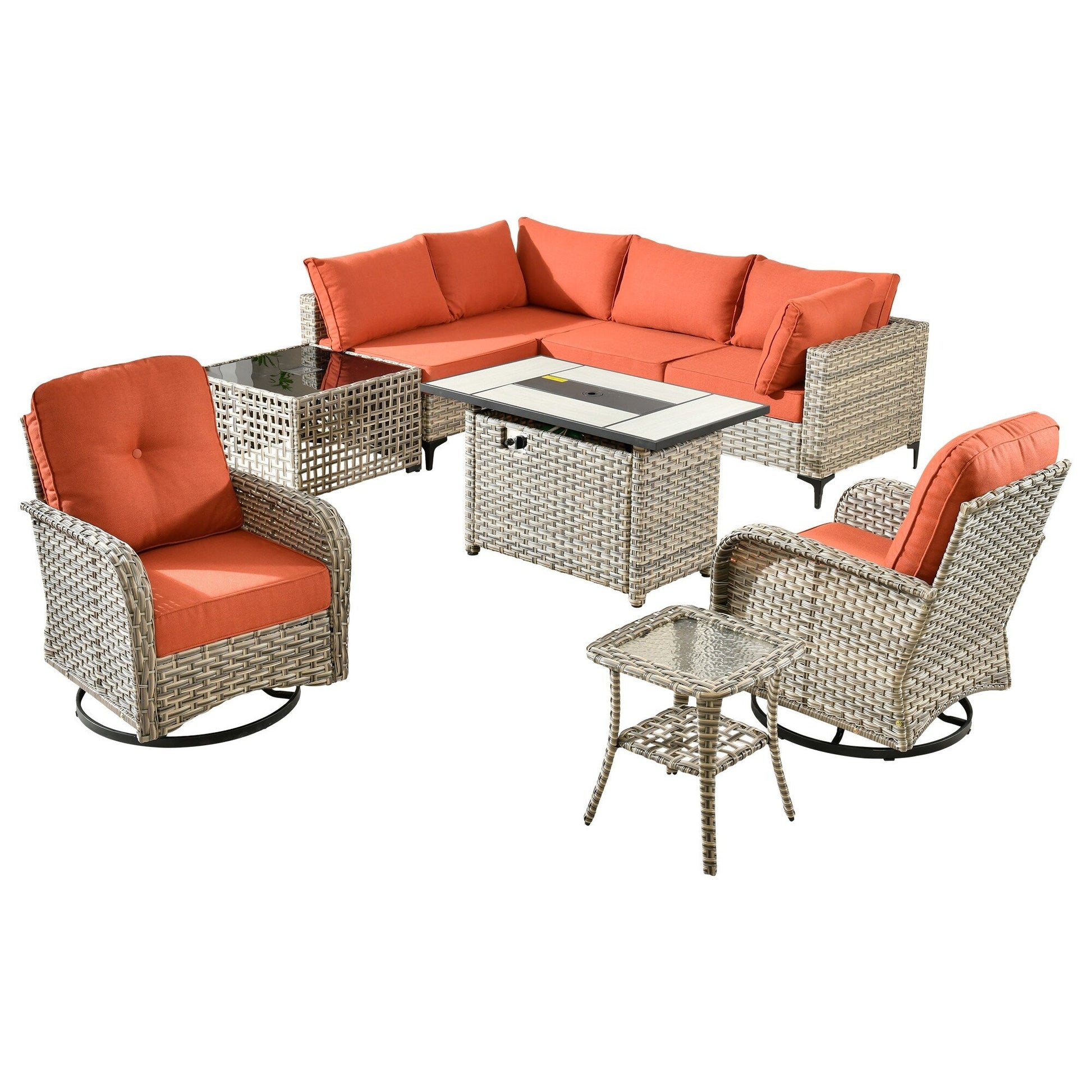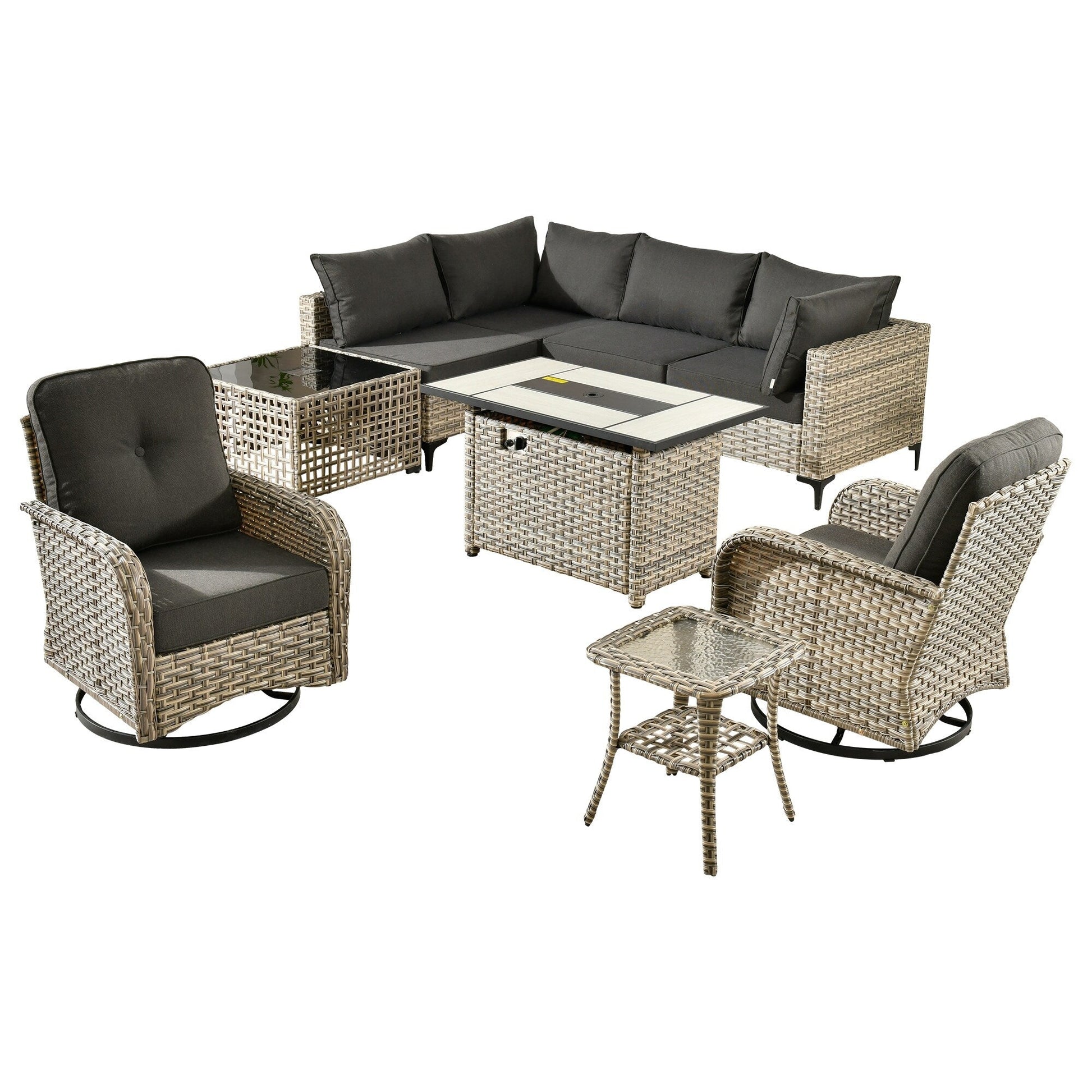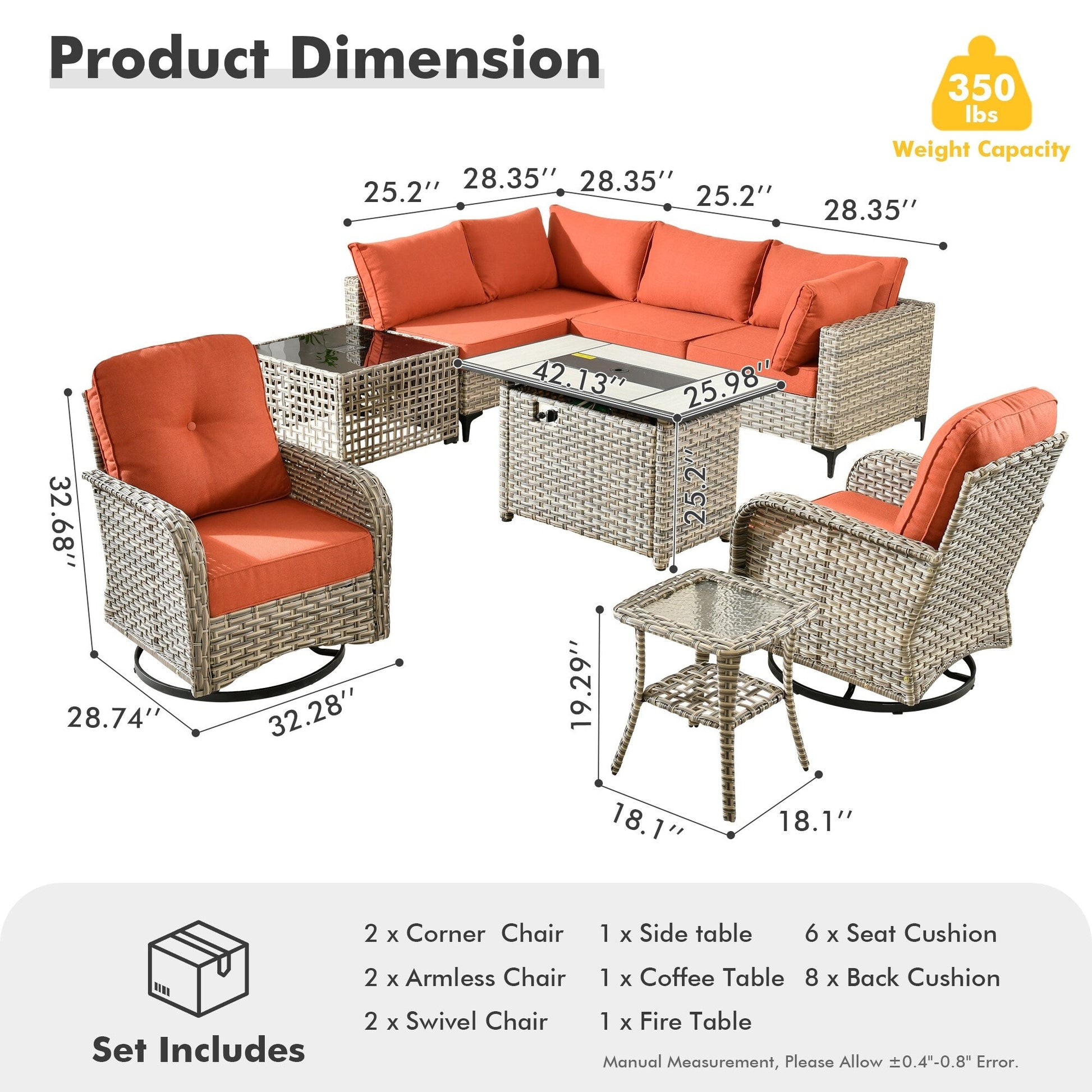 #Set Includes: 2 corner chairs, 2 single sofas, 2 rocking chairs, 1 coffee table, 1 side table, 1 rattan fire pit