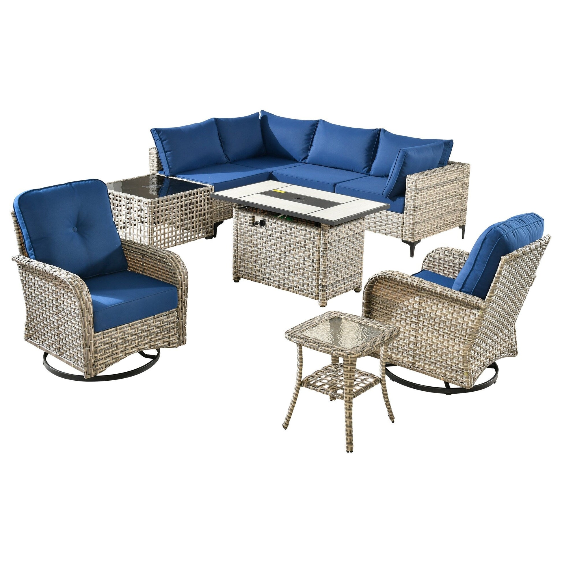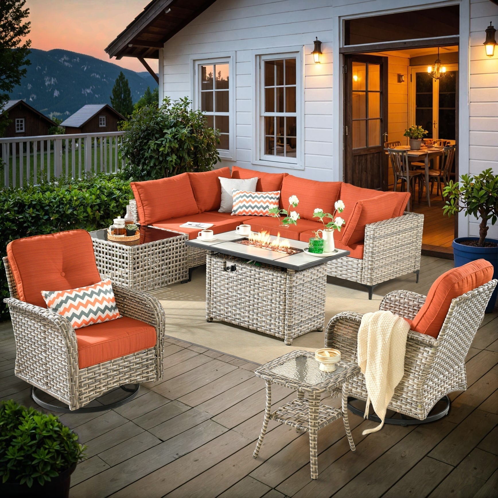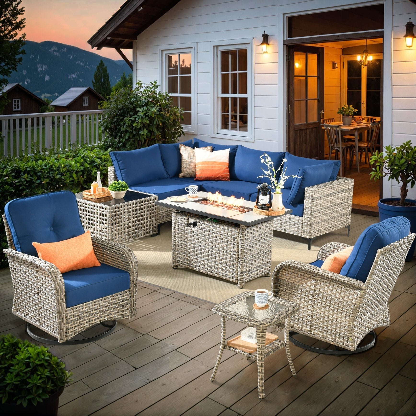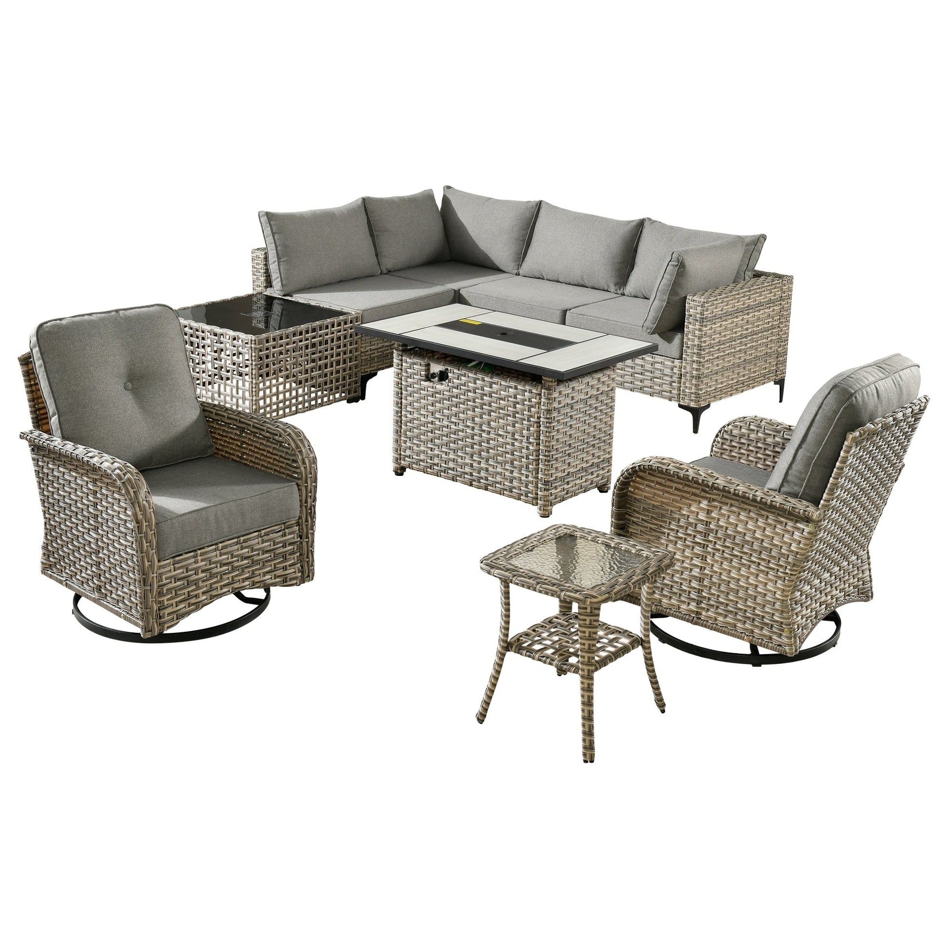 #Set Includes: 2 corner chairs, 2 single sofas, 2 rocking chairs, 1 coffee table, 1 side table, 1 rattan fire pit