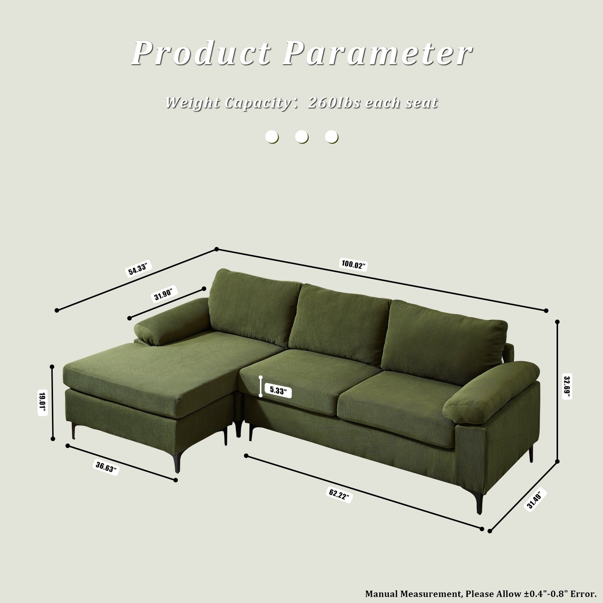 Add a touch of luxury to your living room with the OVIOS Chaise Sofa with Cushions and Metal Legs. The textured fabric offers a pleasant feeling and is not easily wrinkled. Enjoy comfortable sitting with the high-density sponge and plump seat cushion. Sturdy metal legs and a solid frame with high-quality spring coils provide stability, durability, and safety. The back cushions provide ample space for lounging or sleeping.