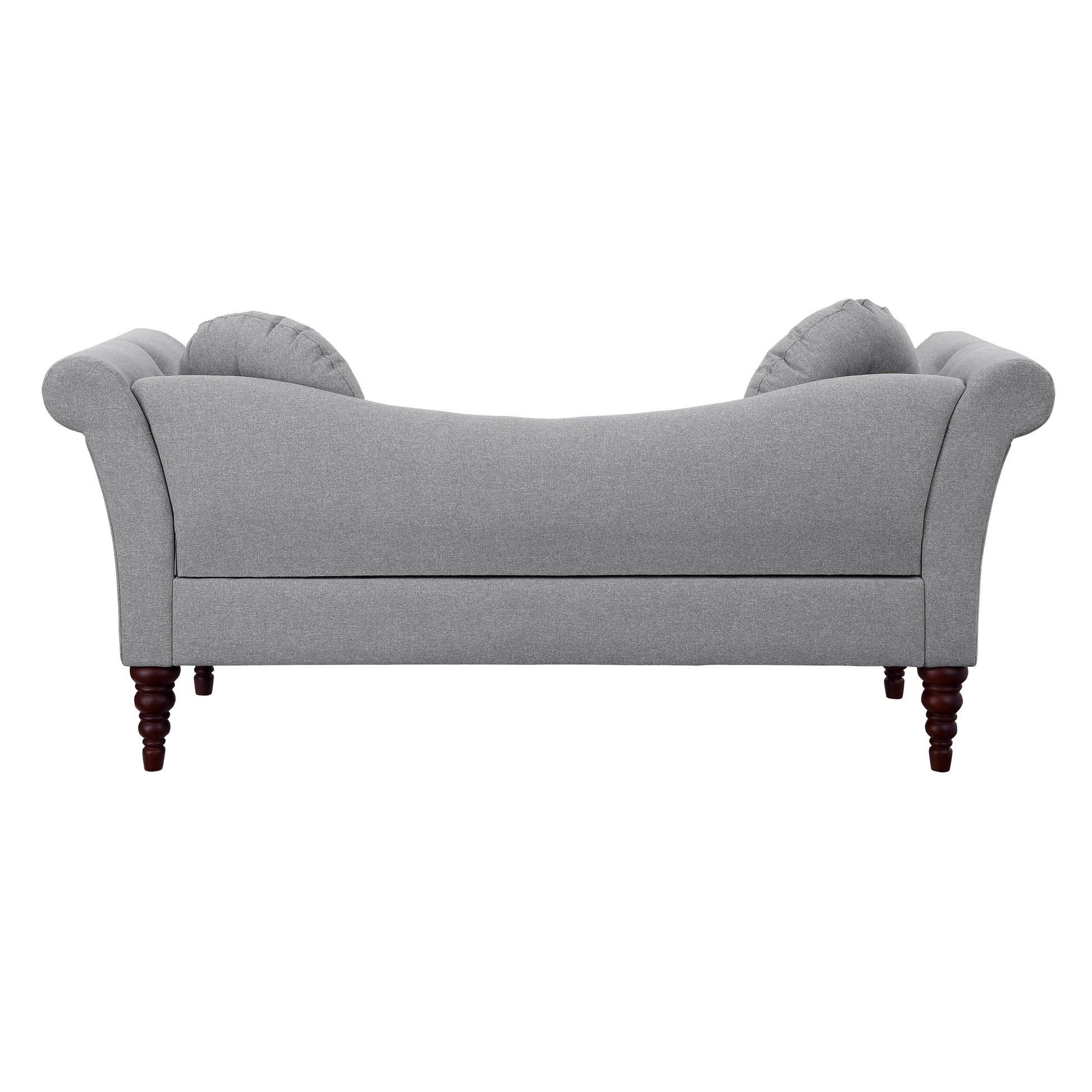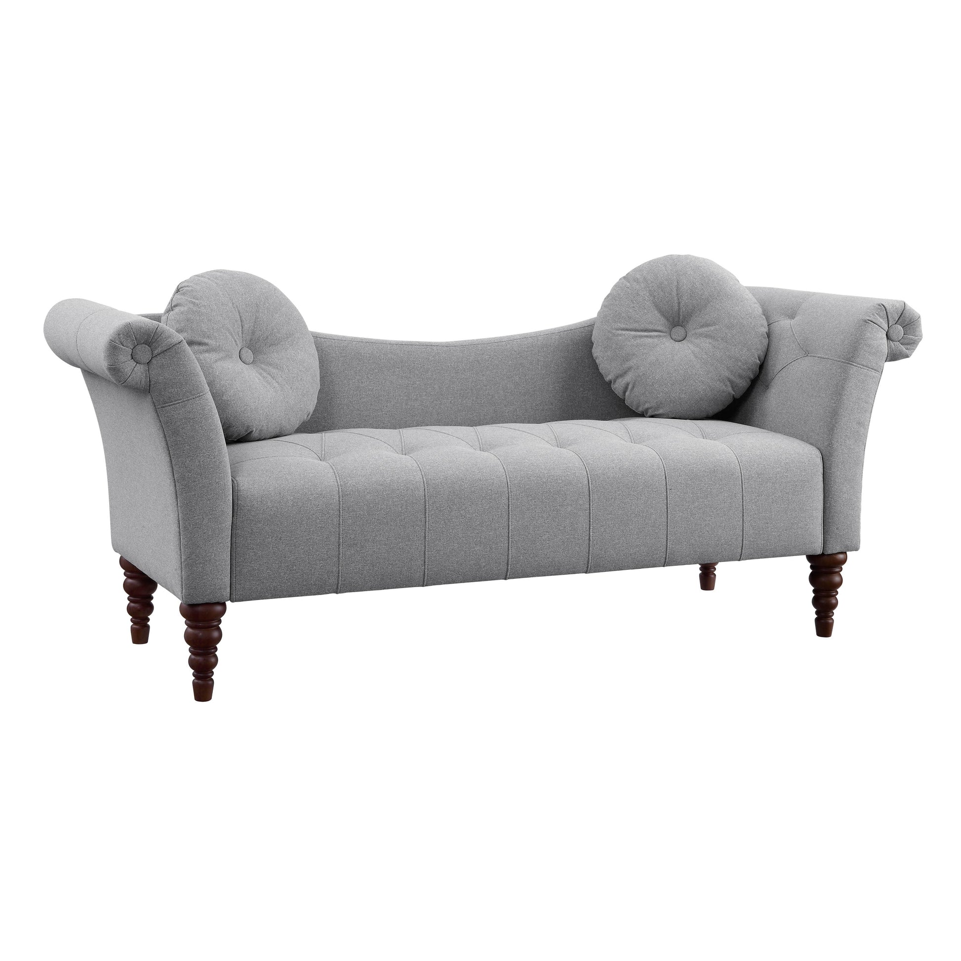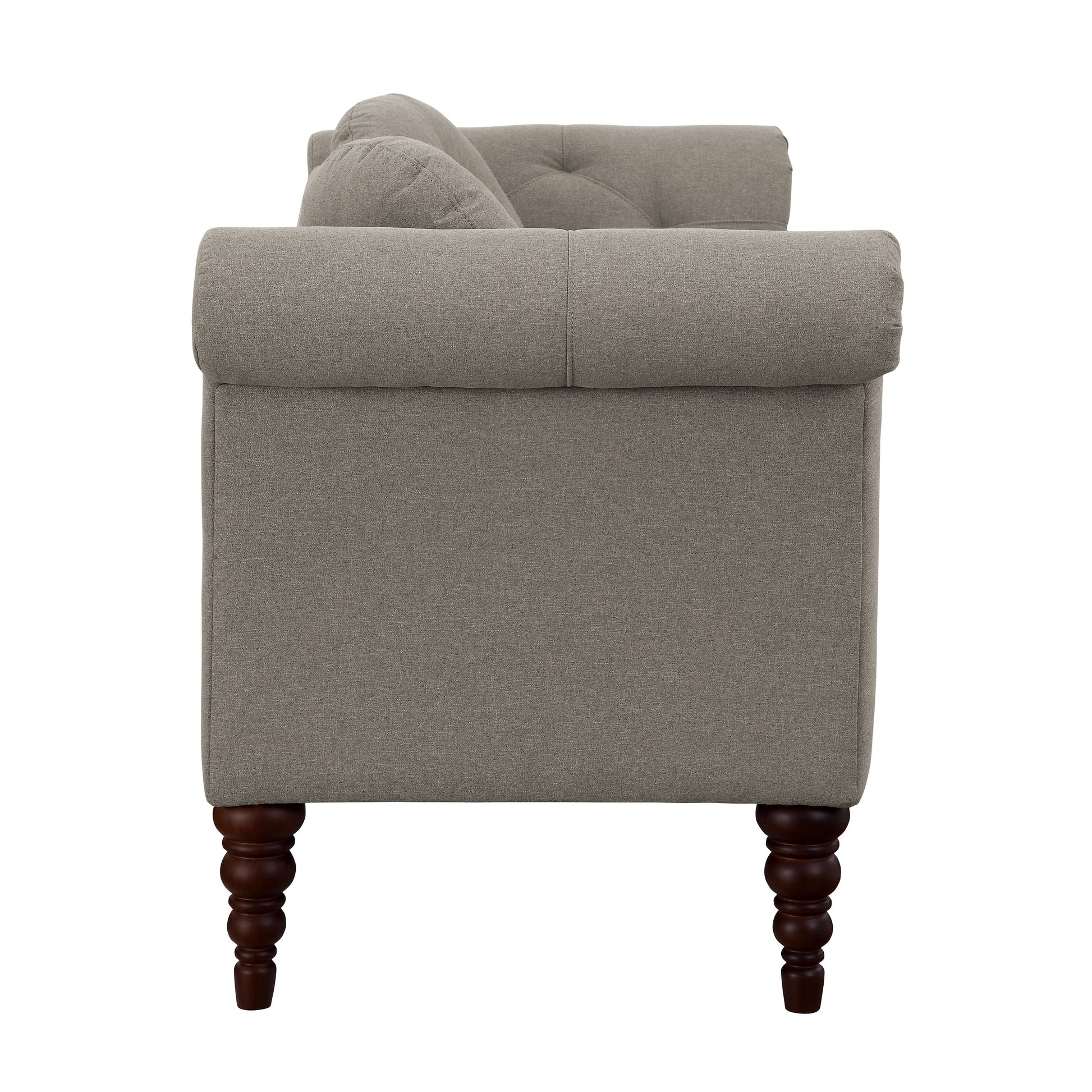 Add a touch of sophistication to your home with the Fremont & Park Oxlip Settee Sofa. The modern traditional styling, contoured shape, and classic accents create a timeless look that is perfect for any space. The diamond tufted fabric upholstery and turned wood legs, along with the rolled arms and concave back, provide both comfort and elegance. This Settee Sofa comes with two round button-tufted accent pillows for added comfort and is available in Brown, Blue, and Dove Gray to match any home decor.