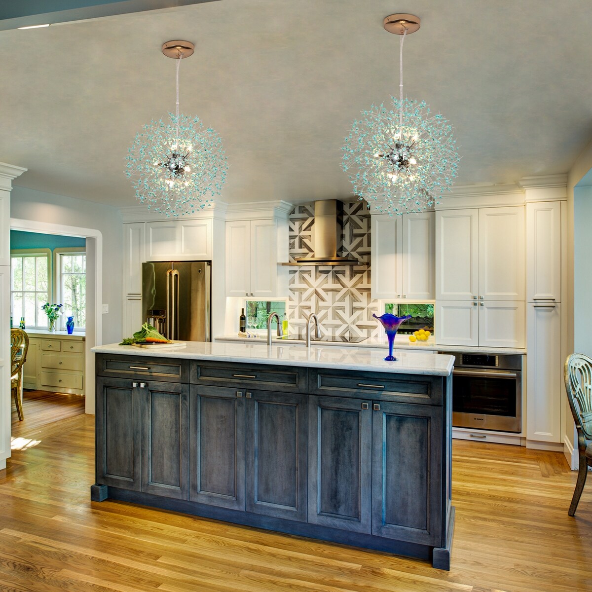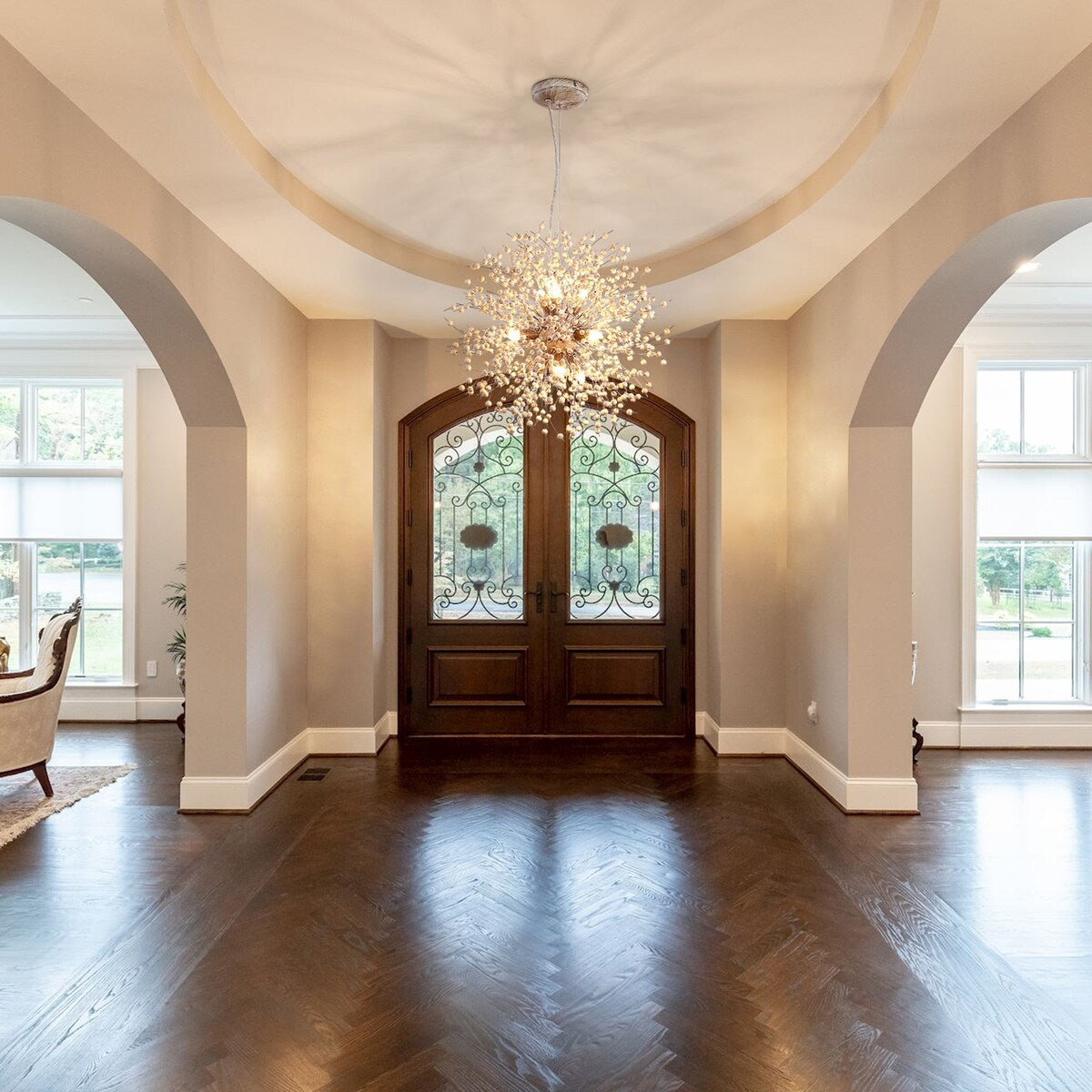 Make a statement with this resplendent Sputnik firework crystal chandelier. Sparkling crystal beads adorned with delicate wires radiate from shiny gold or chrome spheres. It features handcrafted crystal flowers that can be bent and adjusted to create your own signature look. This modern and elegant design is perfect for decorating your living room, bedroom, dining room, kitchen, bathroom, foyer, hallway, office or children's room.