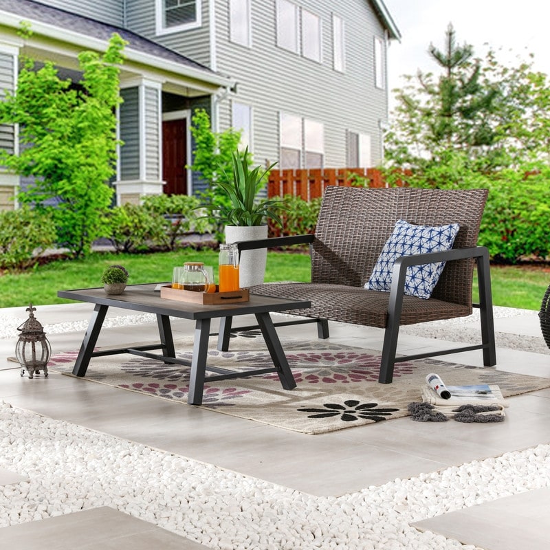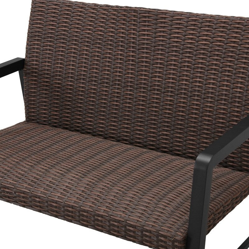 A coffee table and a loveseat are built with a black powder-coated steel frame, all-weather PE wicker and fast-drying padding. This is an original and unique design with built-in quick-drying cotton under the seat, which makes the chair more coordinated and beautiful. Classic woven wicker/rattan on the loveseat makes the whole conversation set elegant and eye-catching.