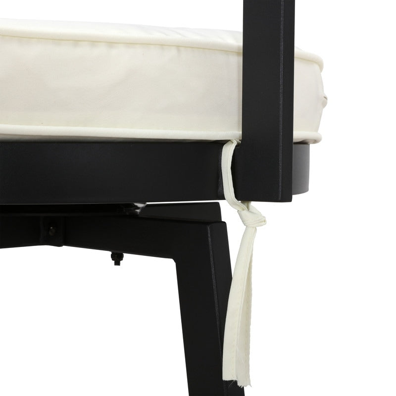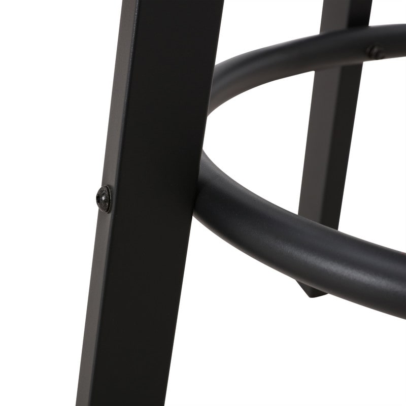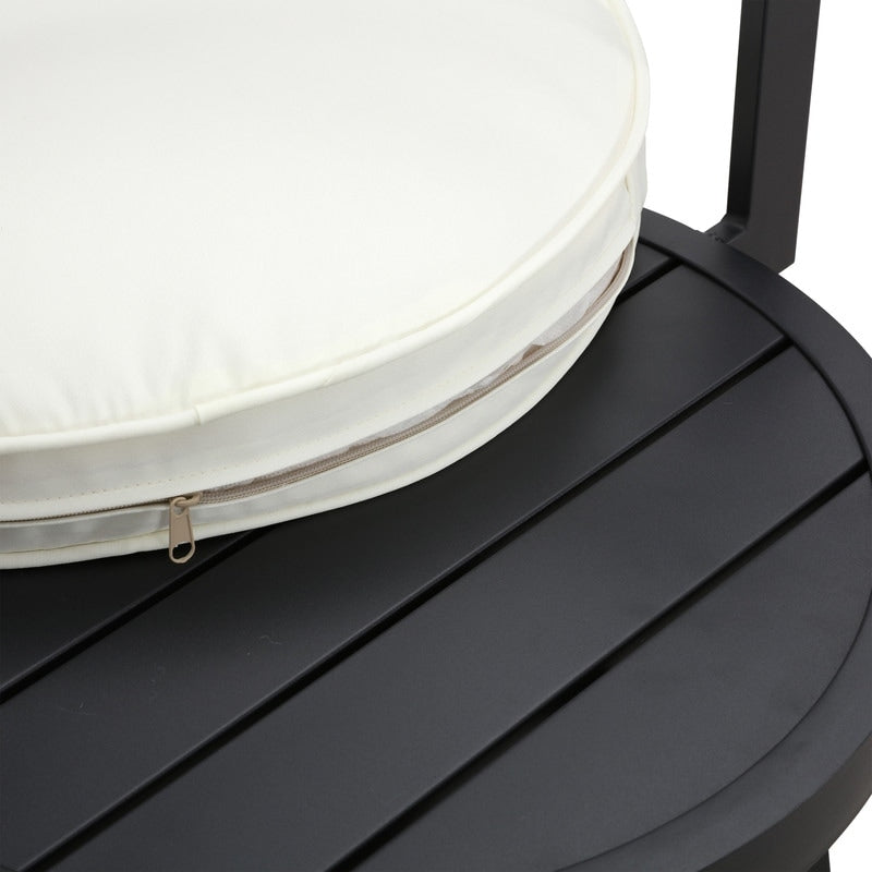 The bar chairs are swivel bar stools with gorgeous half-round back. They are small and exquisite, saving space. They have a durable powder-coated steel frame and not fragile polyester fabric cushion. They are water-resistant and weather-resistant. The smooth product line design brings you a comfortable seating experience and a beautiful visual experience. The bar table with an aluminum-plastic alloy tabletop, which is durable and not fragile. It has double fixing rings and a slot on the table foot, a convenient and labor-saving KD structure, generous dirt-resistant spray. The upright bracket design and the four legs that open out make the chair more concise while ensuring the most important stability.