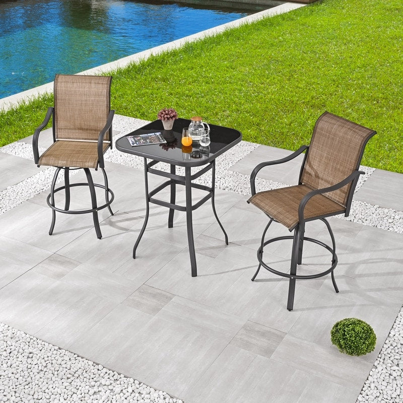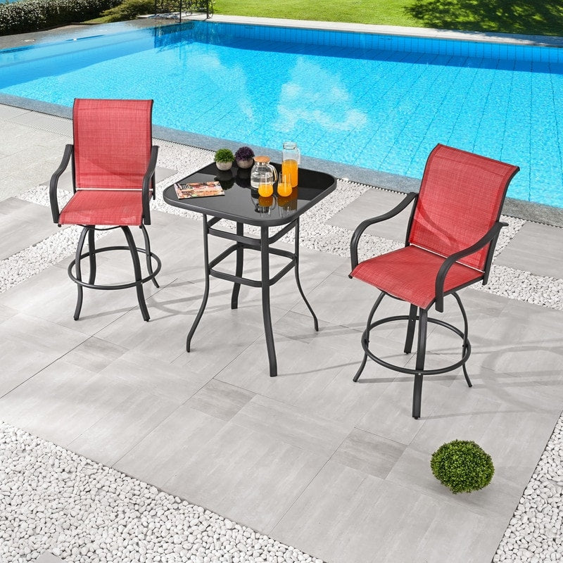 Add some charm to your outdoor space with the PATIO FESTIVAL 3-Piece Outdoor Metal Bar Height Swivel Bistro Set. Perfect for relaxing and soaking up the sun, this set is crafted with a sturdy powder-coated steel frame that ensures durability and longevity. The rounded square table and two swivel chairs are upholstered in water- and UV-resistant PVC-coated polyester sling fabric, which is available in various color options. The chairs swivel 360 degrees and come with leg levelers to offset uneven surfaces, while the chairs can support up to 300 pounds each.