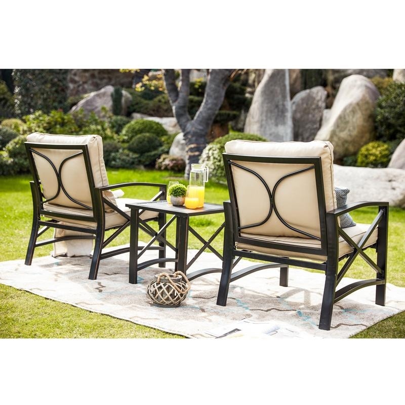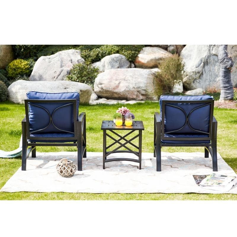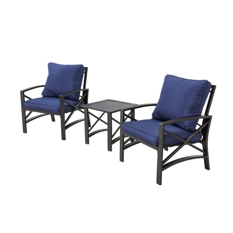 Relax in style and comfort with this 3-piece Patio Festival outdoor conversation set. The steel frames and powder-coated metal finish provide a touch of sophistication to your outdoor decor, while the plush, removable cushions ensure ultimate relaxation. Weather-resistant and easy to clean, this set is perfect for any outdoor space, whether you're catching up with friends or sipping coffee. Available in blue or khaki cushions.