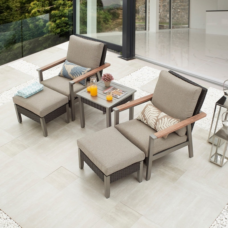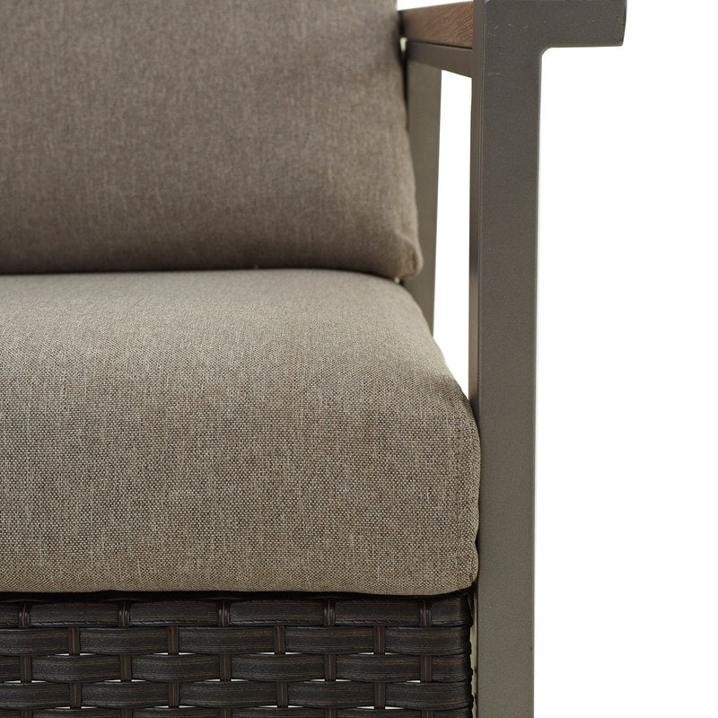 Our Thermal Transfer 5-Piece Outdoor Conversation Set is the perfect way to bring luxury and convenience to your outdoor space. With its warm rustic design and quality construction, this set will transform any backyard into an elegant space for conversation. Crafted with powder-coated metal frames and UV-resistant Olefin fabrics, this set features a wood grain visual for a natural feel and full cushions for spacious seating. All-weather PE wicker and rattan ensures a long lifespan.