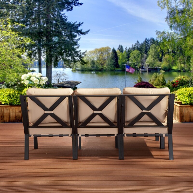The Patio Festival X-Back 5-Piece Outdoor Sofa Seating Set is the perfect solution for outdoor entertaining! This set includes a side table, middle module, right armrest, left armrest, ottoman, four seat cushions and three back cushions. The durable powder-coated steel frames and Polyester fabric provide comfort and long-lasting quality, while the unique X-shaped back design adds style and elegance. The aluminum-plastic plate tabletop is easy to maintain and complete the look of your outdoor space.