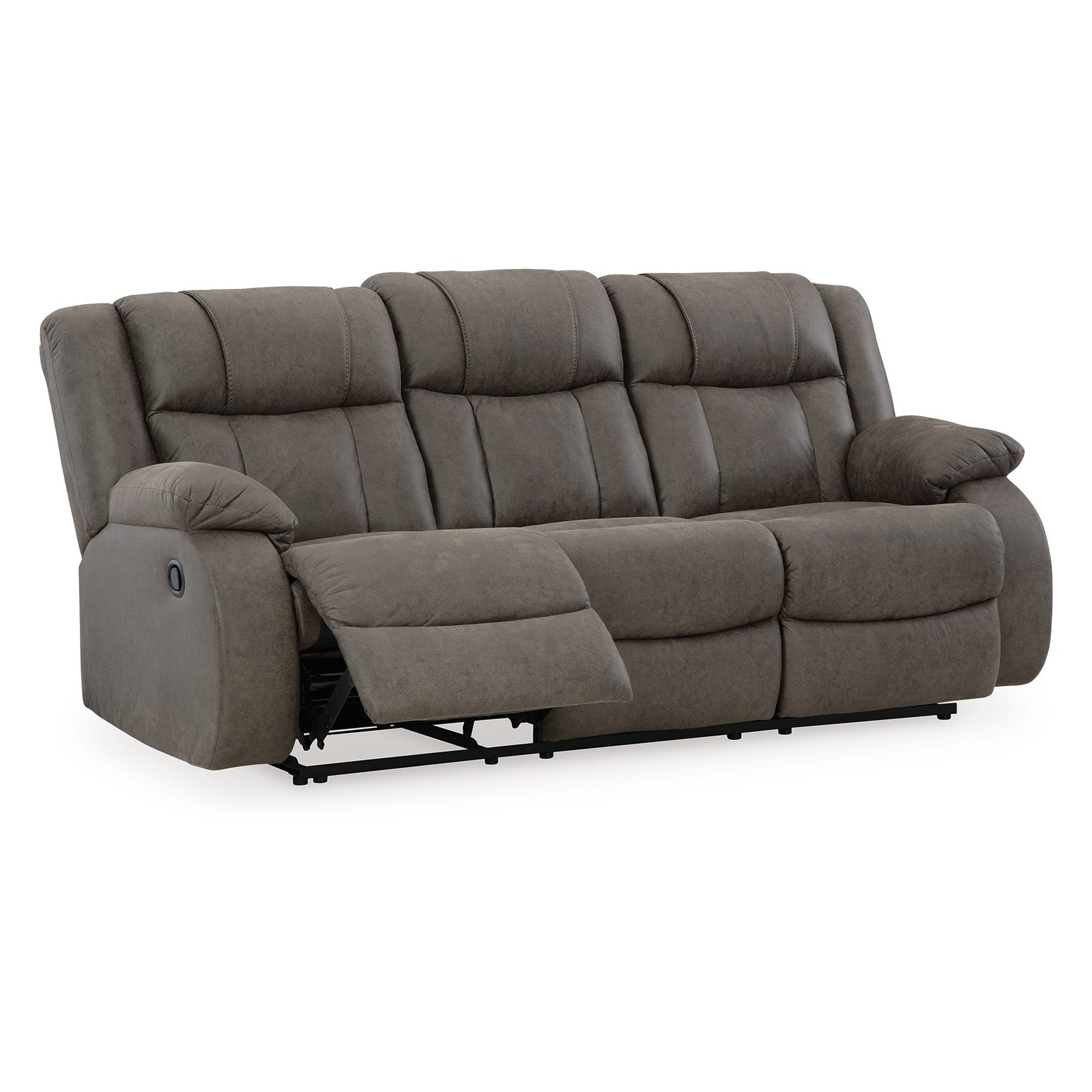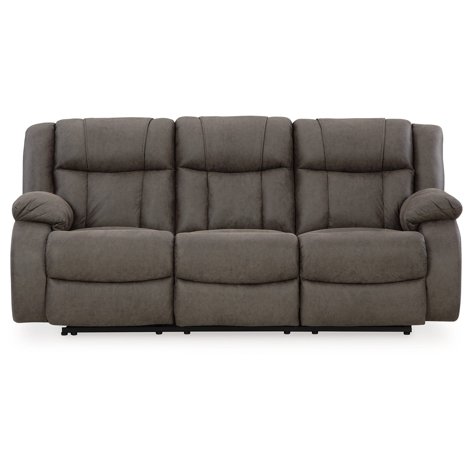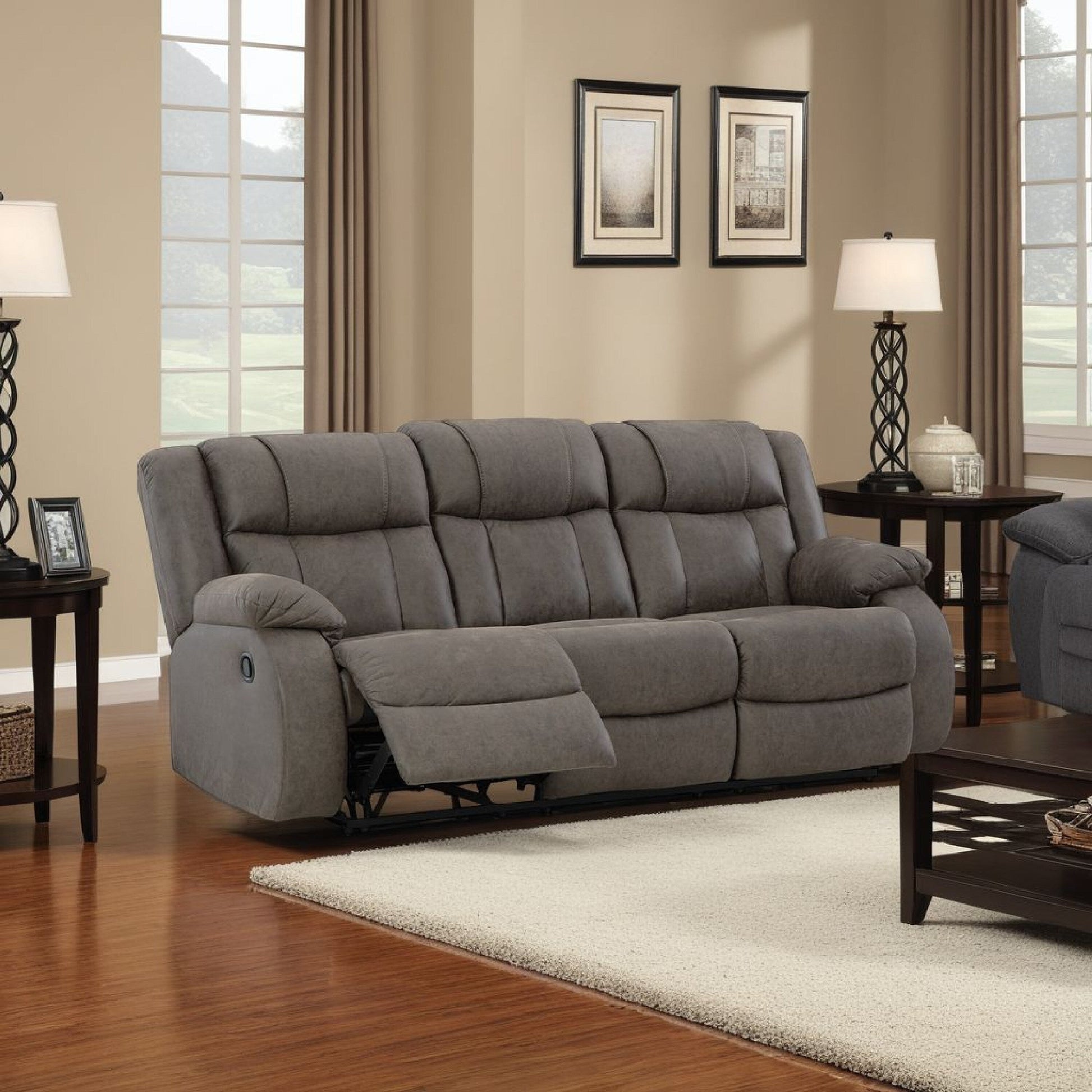 Unwind in effortless style and comfort with this reclining sofa, which is designed with dual-sided reclining. The gray-tone faux leather upholstery adds a modern touch, while the contrasting stitched details enhance its appeal. With high-resiliency foam cushions, a corner-blocked frame, and metal-reinforced seating, it is built for durability and ease. Explore our Perth collection for more.