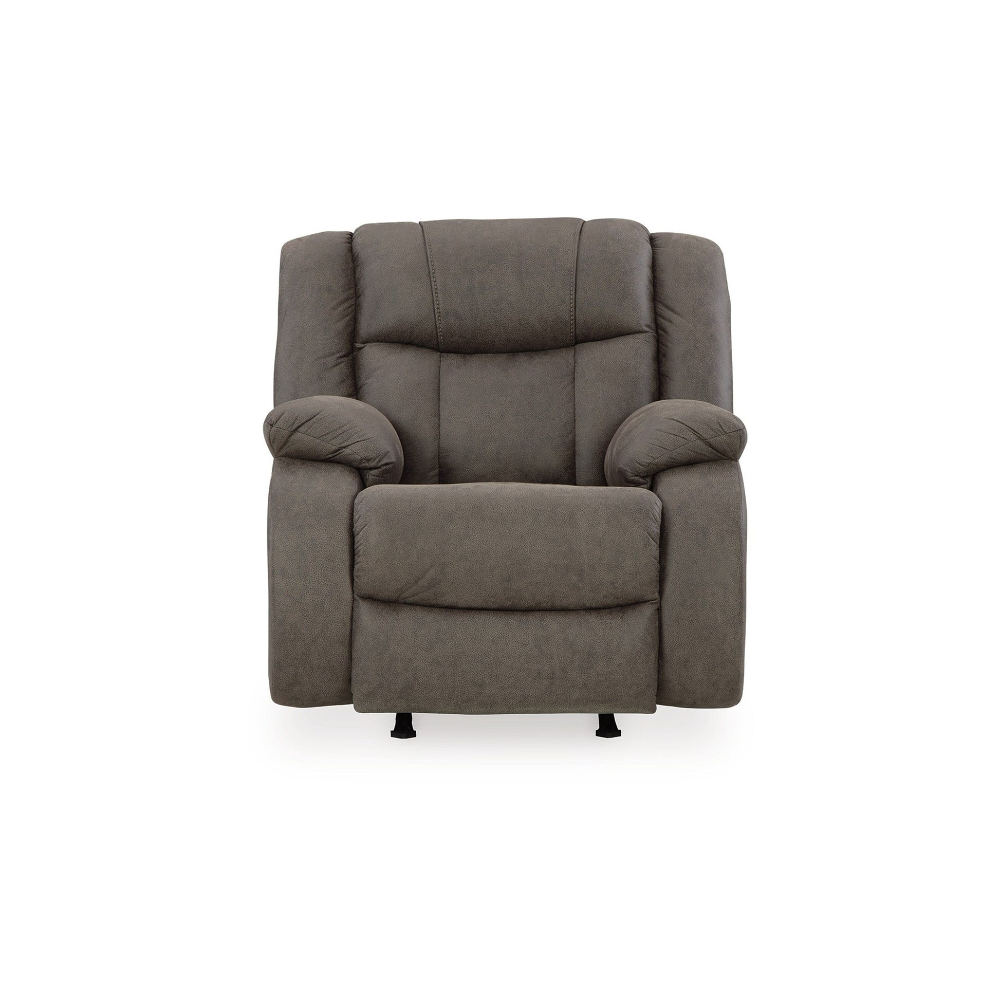 Relax in style and comfort with this rocker recliner chair, designed for modern living. Upholstered in gray faux leather, the pull-tab reclining mechanism lets you kick back with ease while the gentle rocking motion enhances relaxation. High-resiliency foam cushions ensure lasting support, and the metal-reinforced seat guarantees long-term durability. Check out our Perth collection for more.