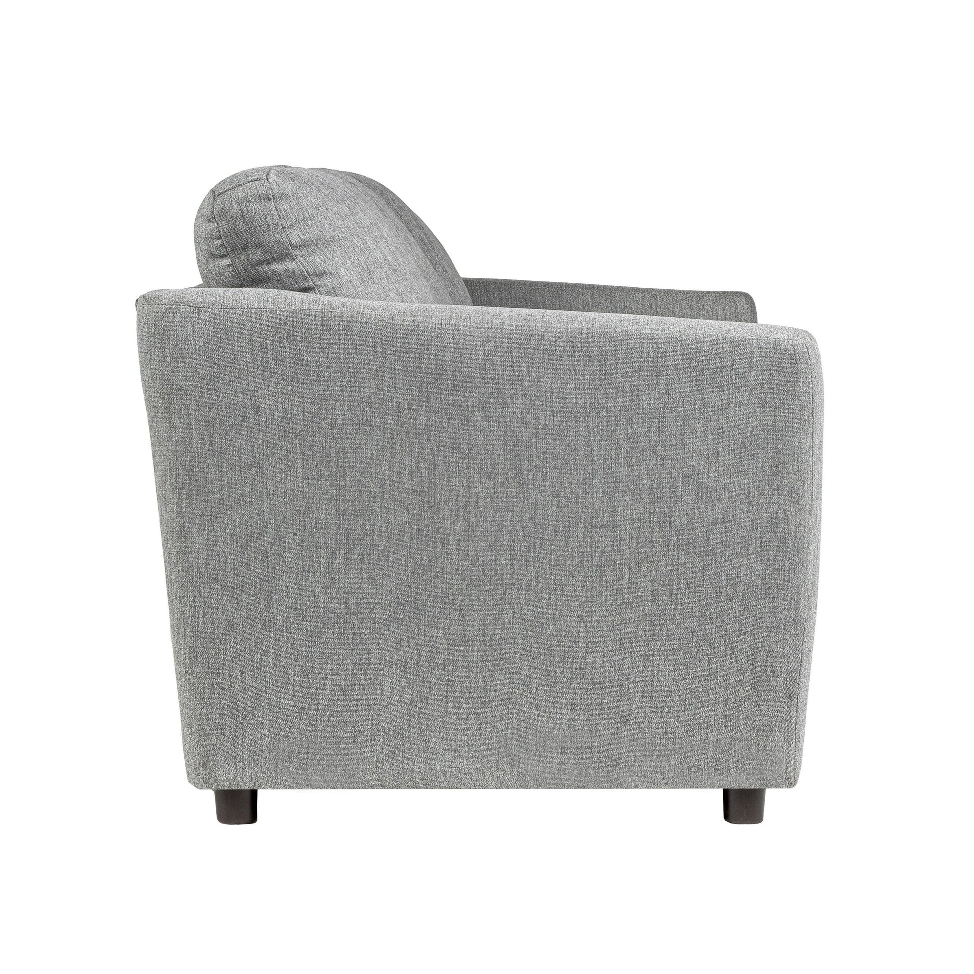 Upholstered in easy care light gray polyester fabric for a stylish, versatile, and low maintenance look