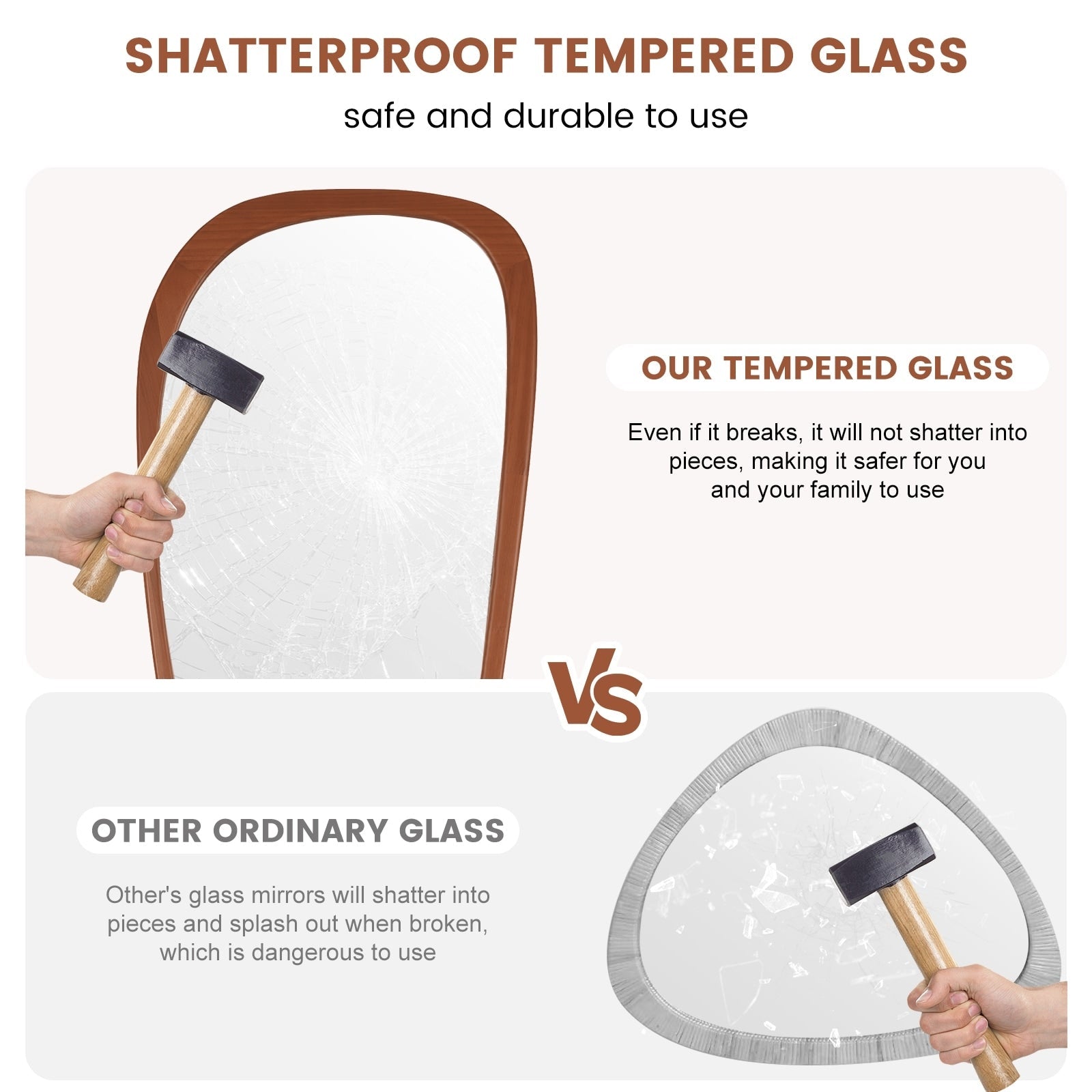 These wall mirrors provide the inviting energy of nature without clashing with modern décor pieces. The attractive shape catches the eyes of your guests while adding visual space and light to the room! The natural wood frame is made from genuine pine, featuring sturdy finger joints for a long-lasting visual style. These mirrors are lightweight, easy to hang, and feature premium shatter-resistant glass that provides a distortion-free reflection.