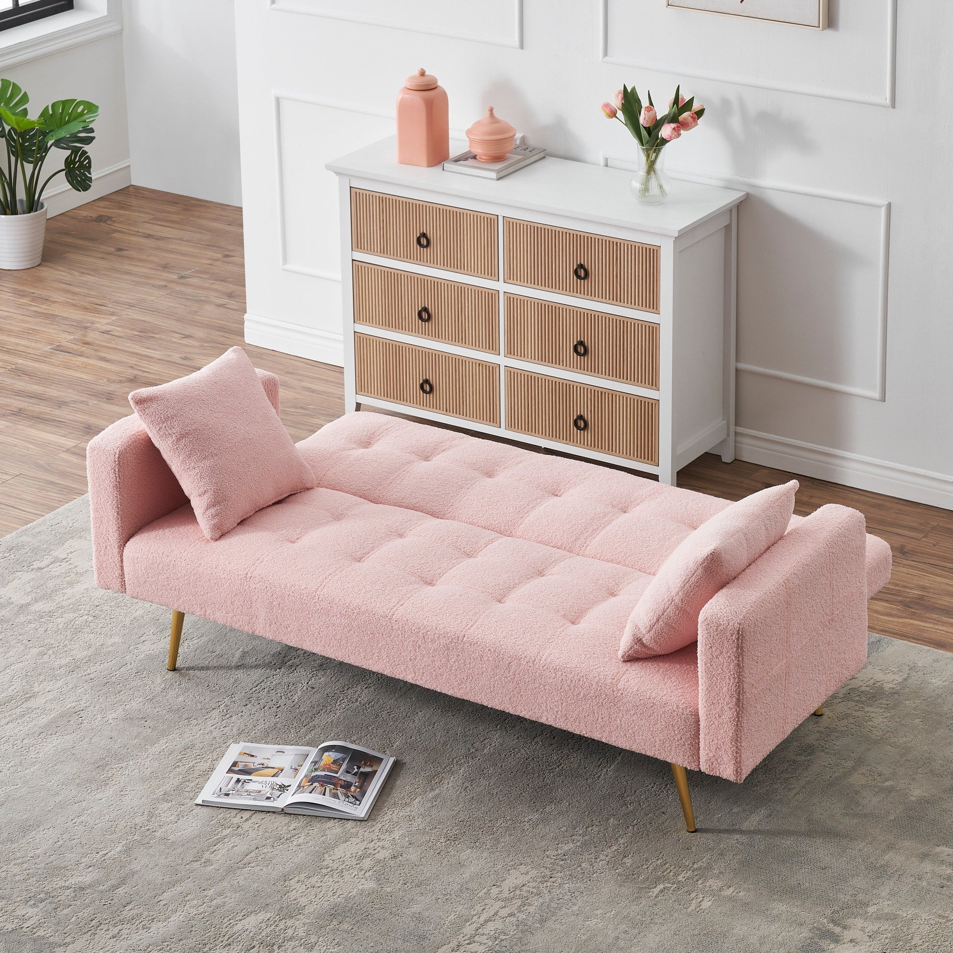 This sofa not only has the function of a sofa bed but also includes a coffee table in the middle that can be freely changed. The armrests of the sofa are fixed by Velcro, which can be placed at will. Very practical.
